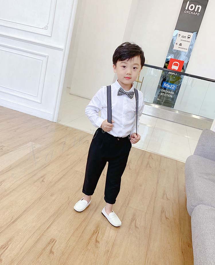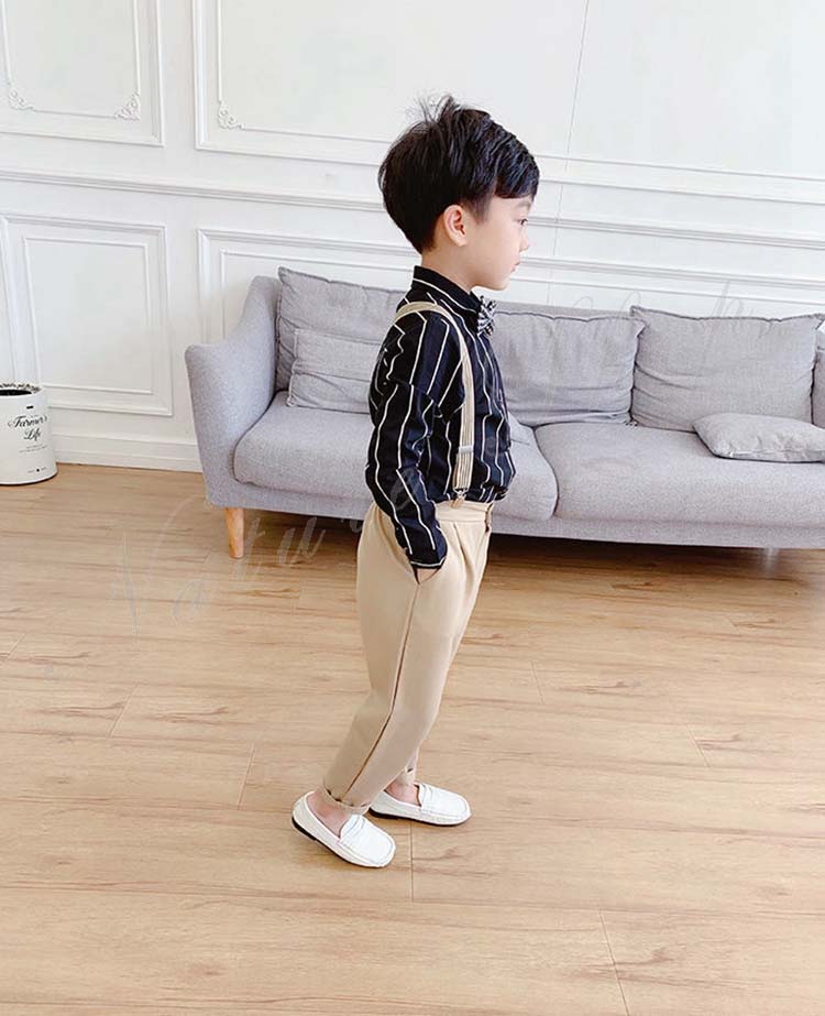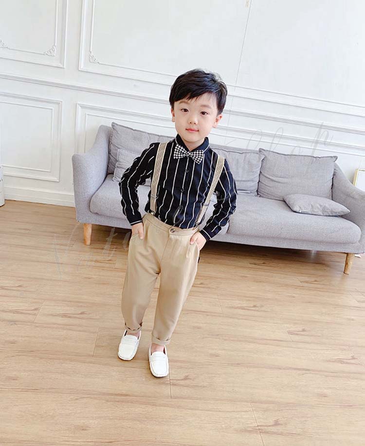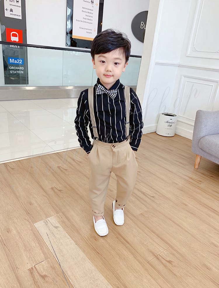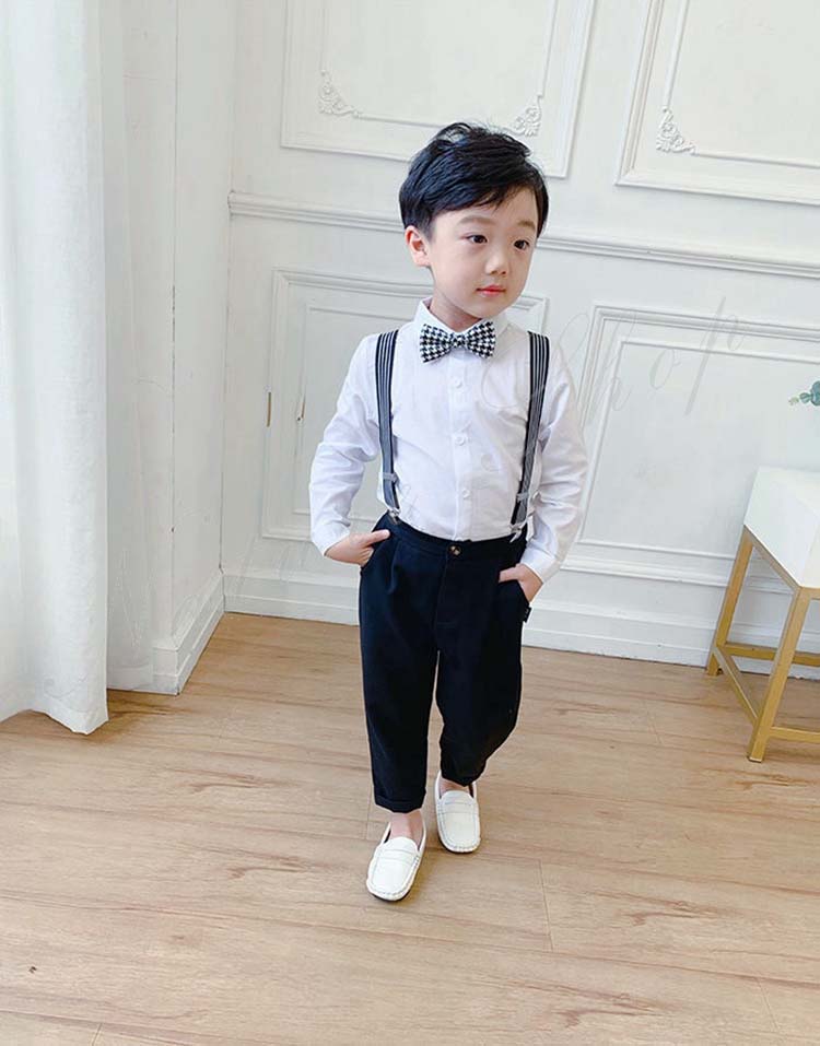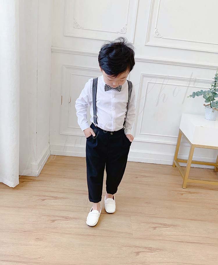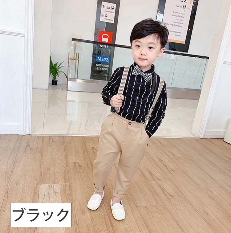 セットアップ 秋 長袖 シャツ 白 黒 ストライプ柄 オーバーオール キッズ 男の子 サロペット 130 150 蝶ネクタイ付き チェック柄 2colors ジュニア イギリス風 紳士 司会