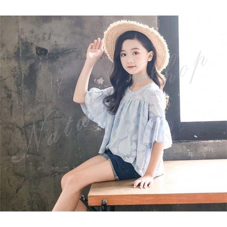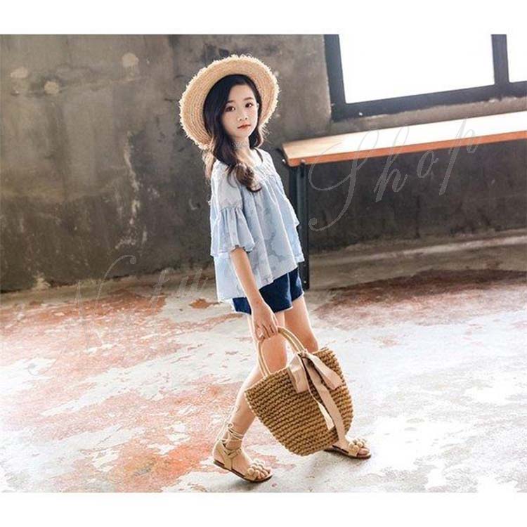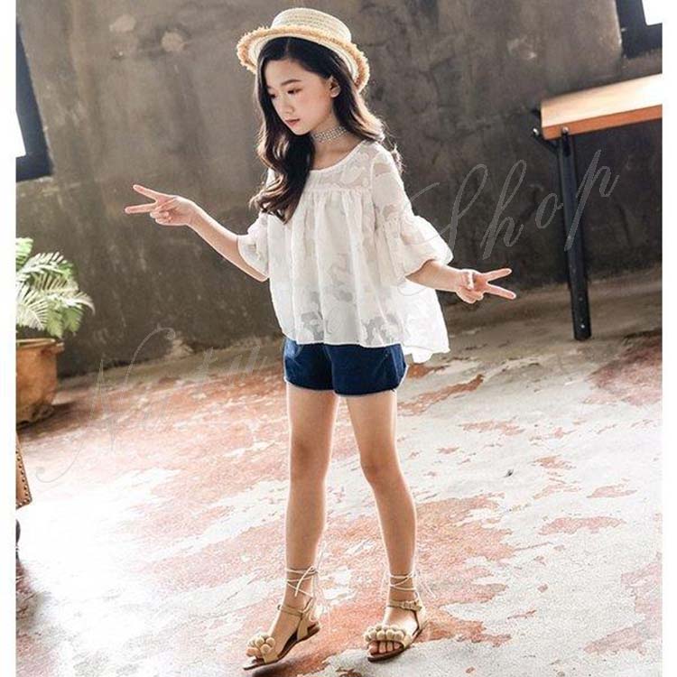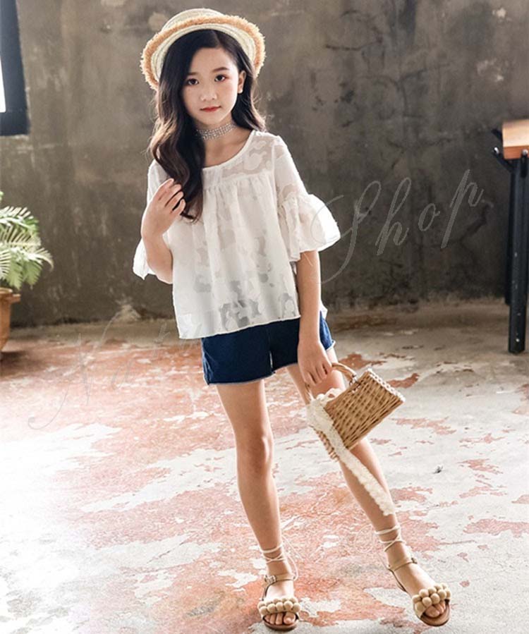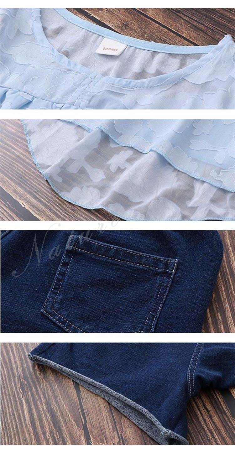 韓国子供服 セットアップ キッズ 春夏 女の子 2点セット 半袖Tシャツ トップス+ショートパンツ 子供服 シフォン デニム 短ズボン 上下セット 通学 通園 子ども服