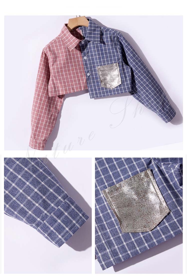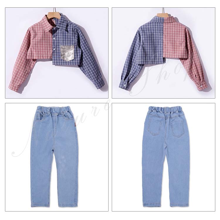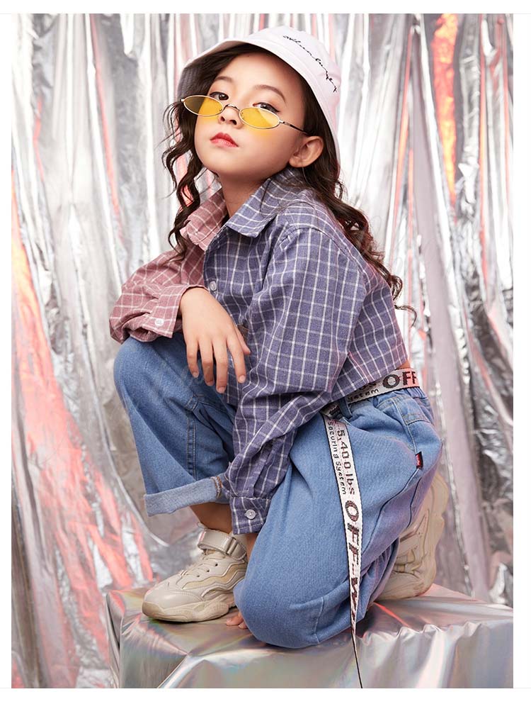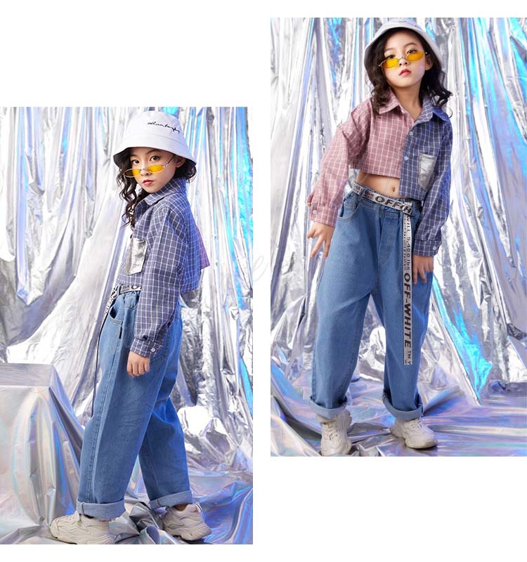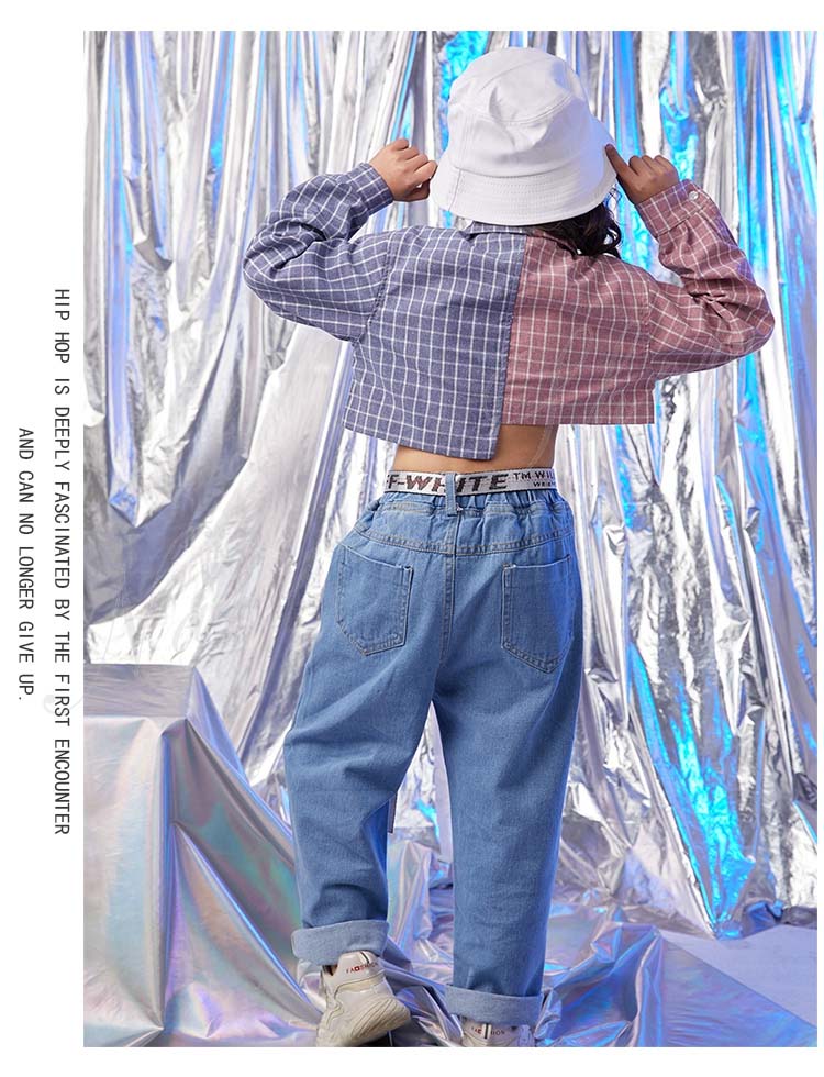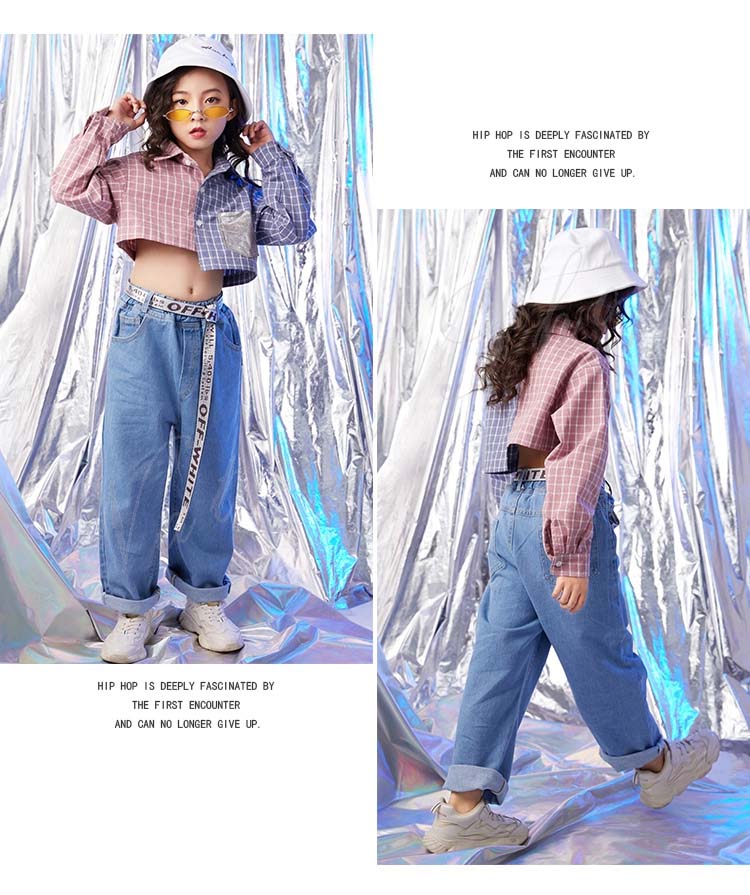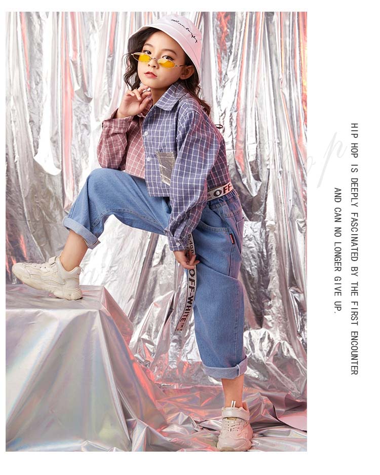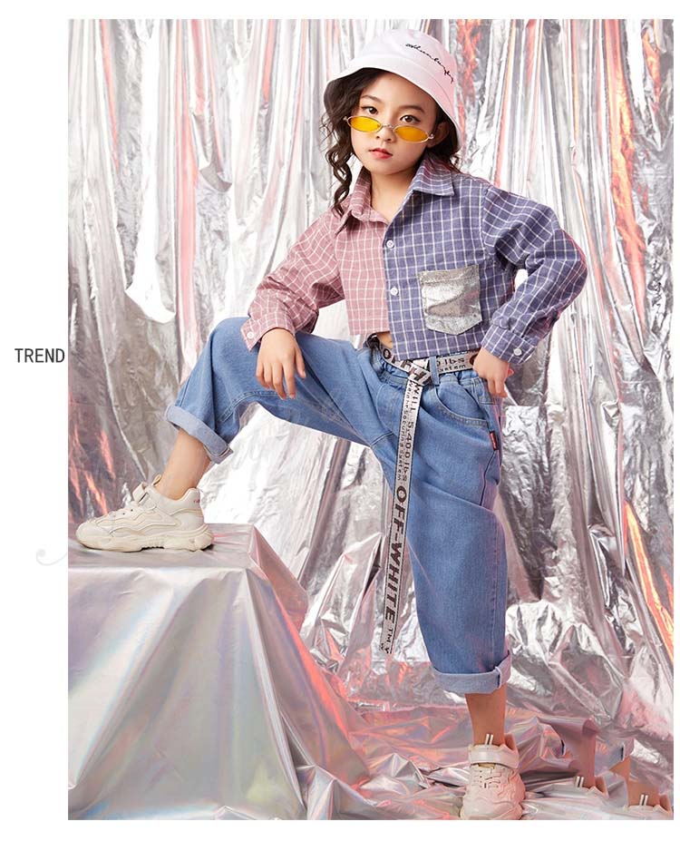 ヒップホップ 衣装 ファッション ダンス衣装 キッズ 長袖 シャツ 混色 チェック柄 ジーンズ おしゃれ デニム ロング丈 パンツ 長ズボン ダンスウェア レディース