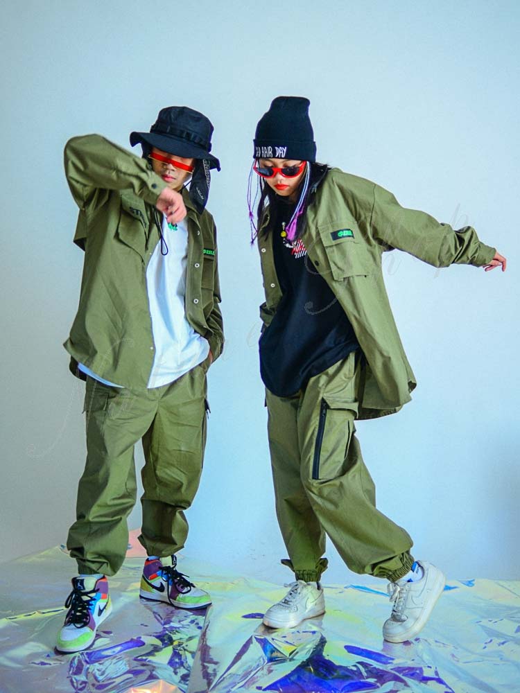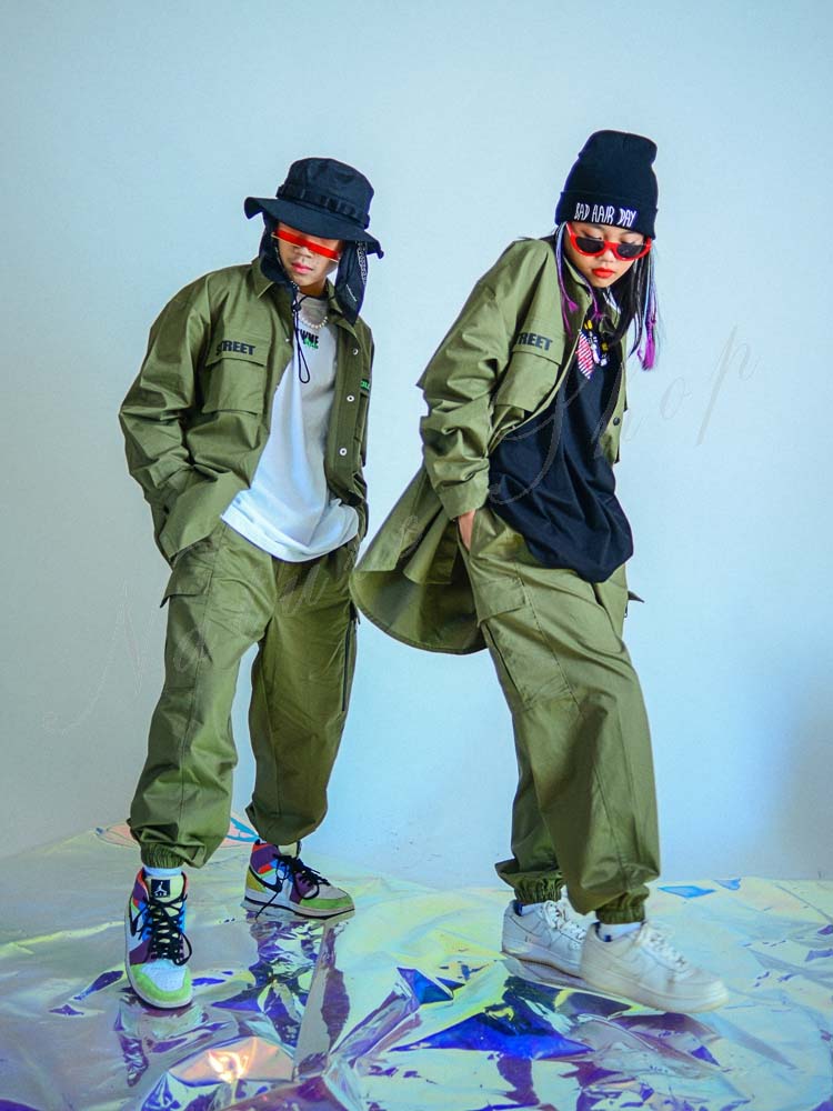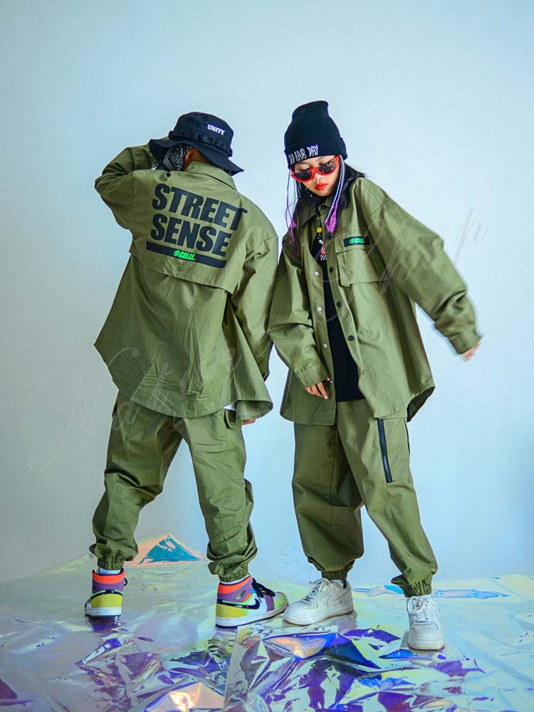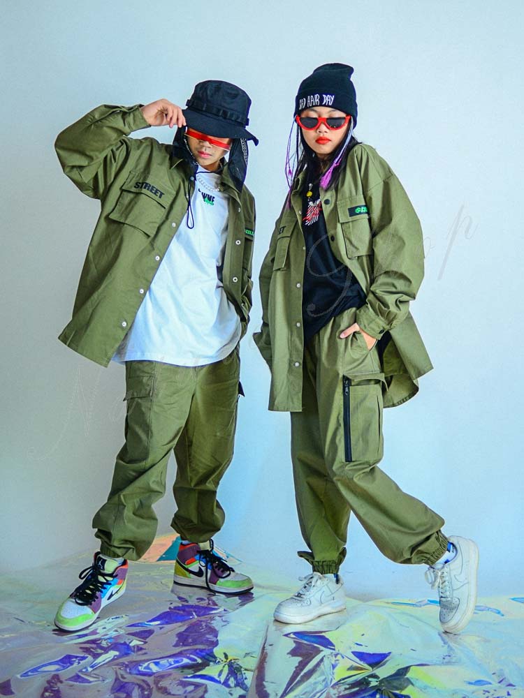 キッズダンス衣装 ダンス衣装 キッズ トップス パンツ 長袖 コートジャケット サルエルパンツ ヒップホップ 衣装 ファッション 緑色 ダンスウェア おしゃれ キッズ