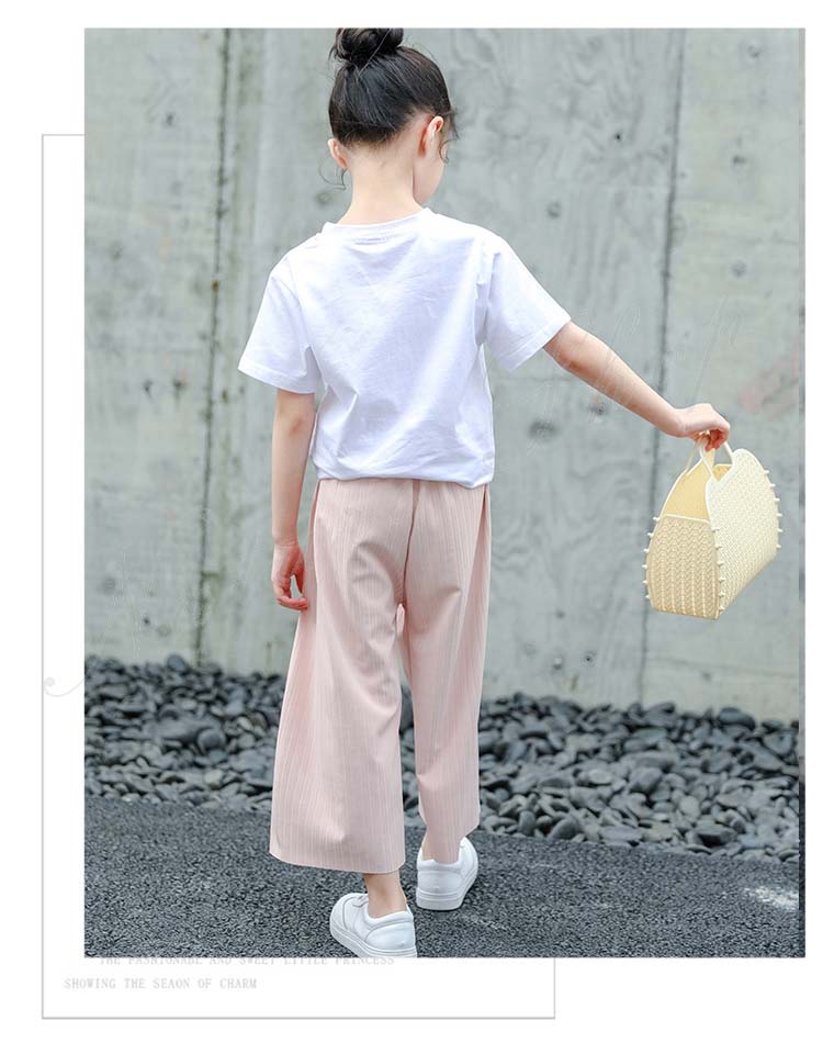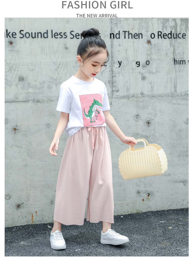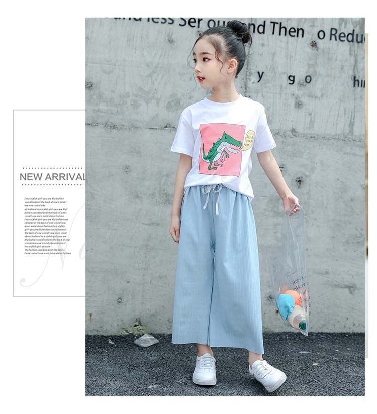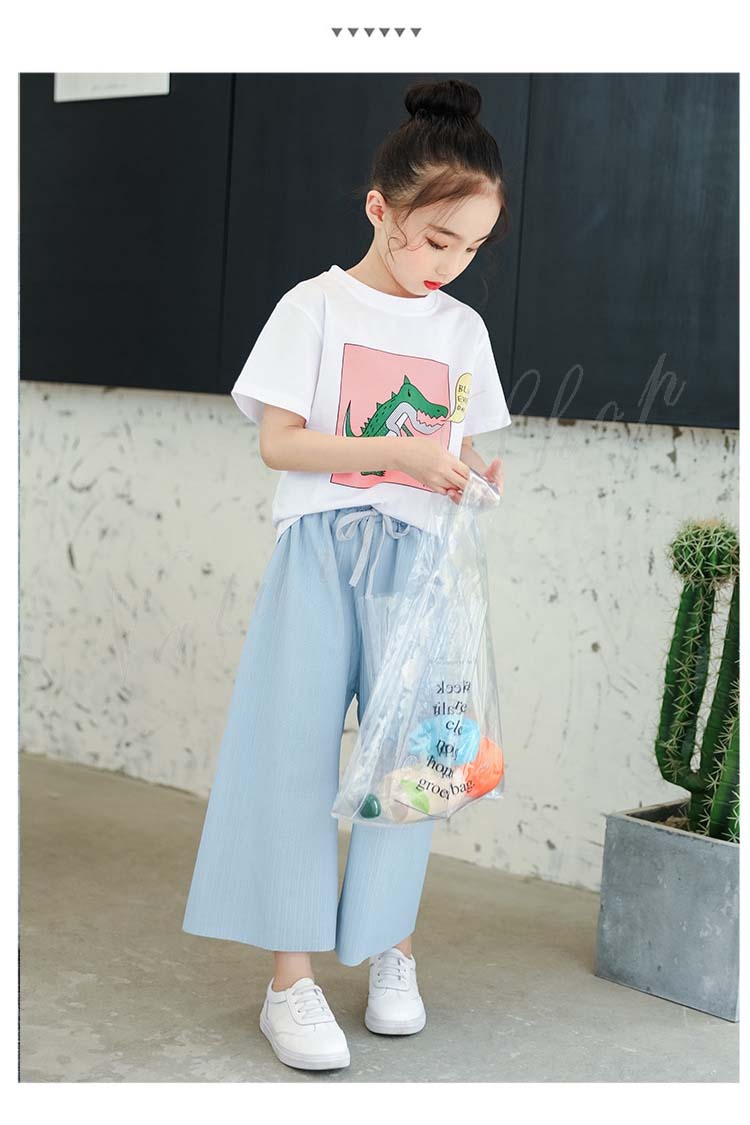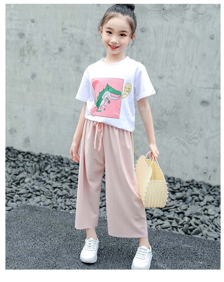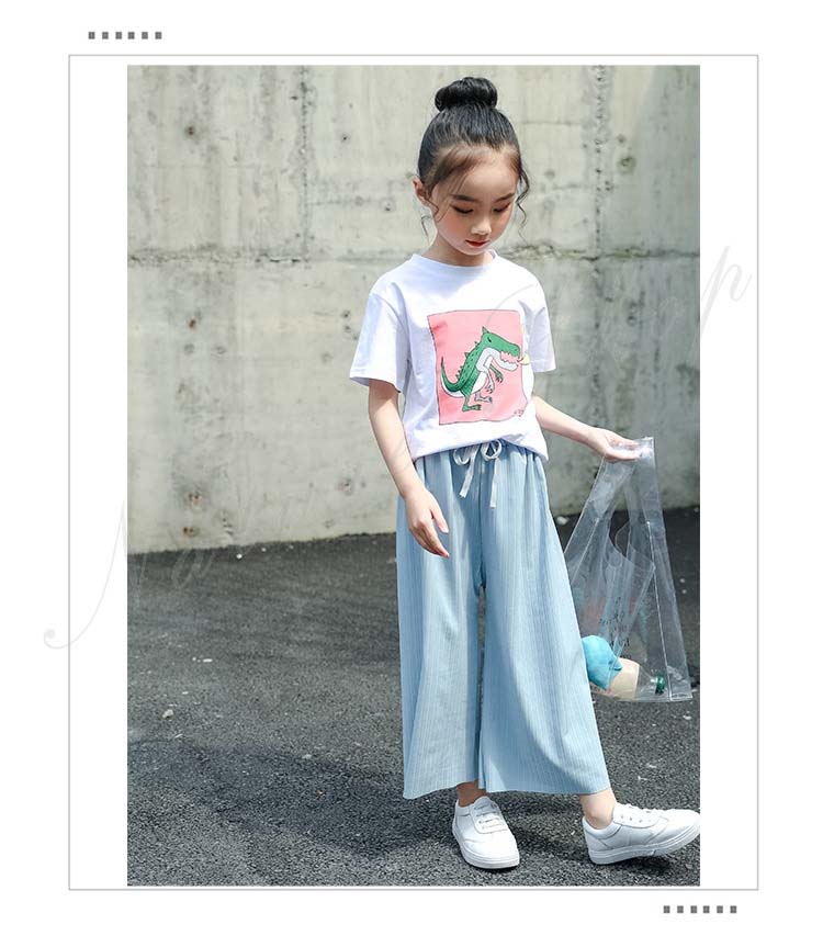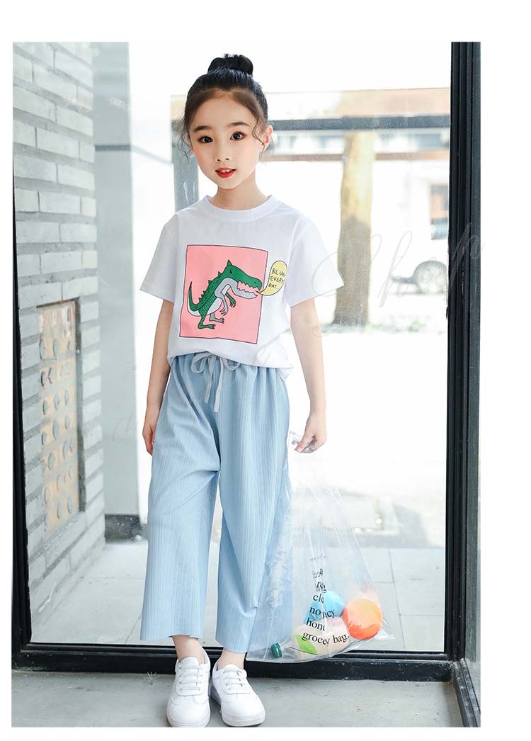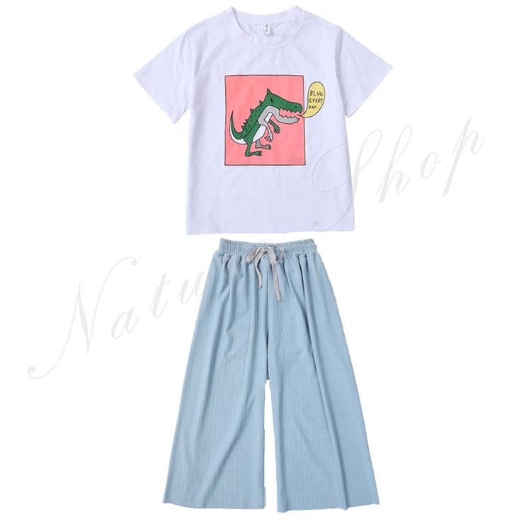 子供服 子ども服 女の子 夏 夏服 セットアップ カジュアル ナチュラル 白 Tシャツ ワイドパンツ 恐竜柄 ロング丈 ズボン 上下 2点セット 2色選べる ブルー ピンク