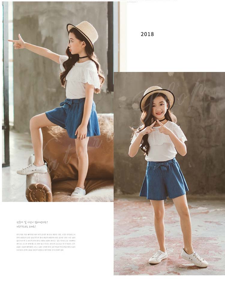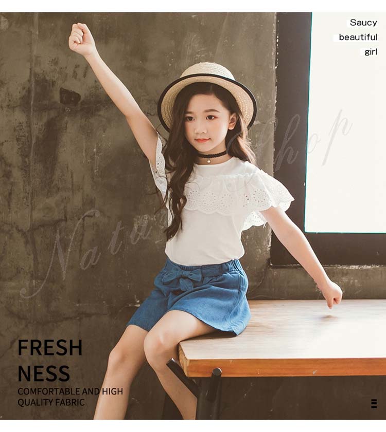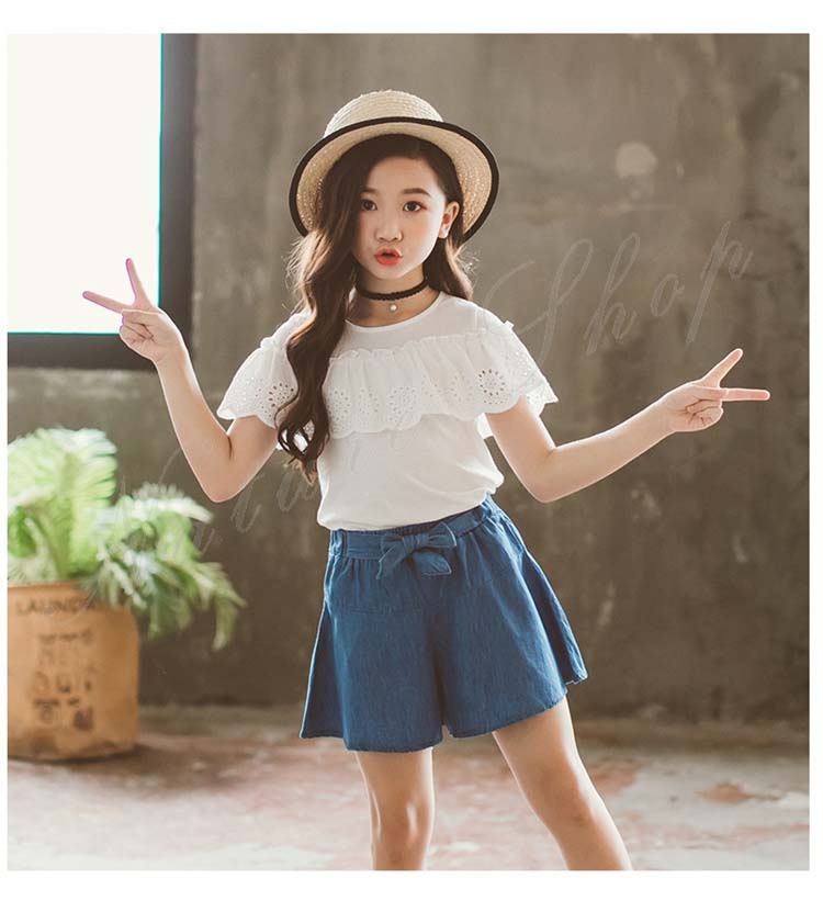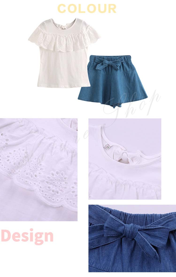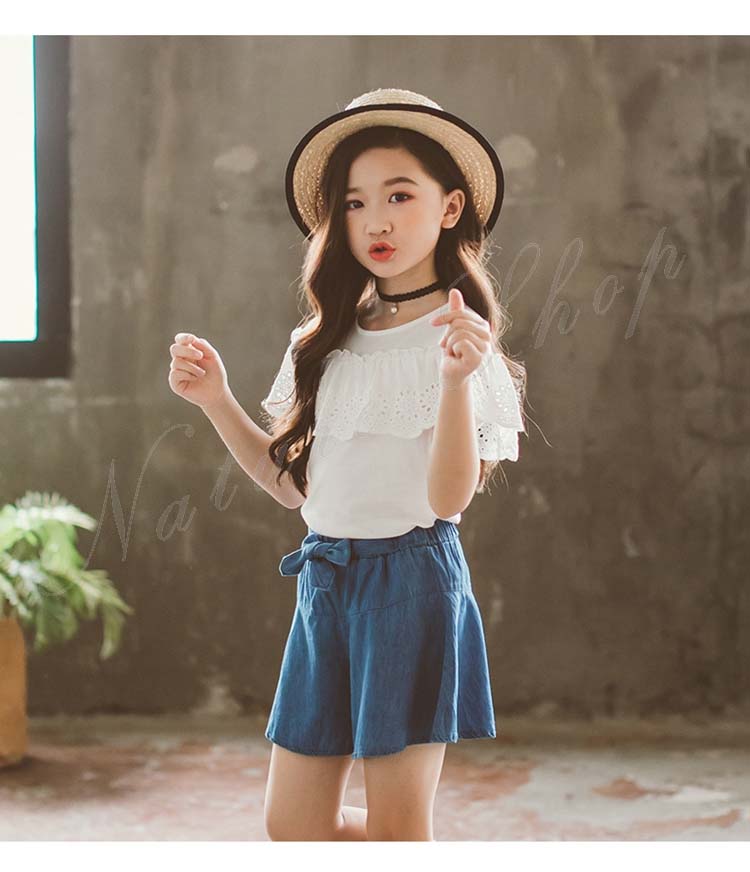 子供服 子ども服 女の子 夏 夏服 セットアップ カジュアル ナチュラル 白 半袖 ブラウス デニム スカート キュロット ゆったり デニム 半ズボン 女の子 夏