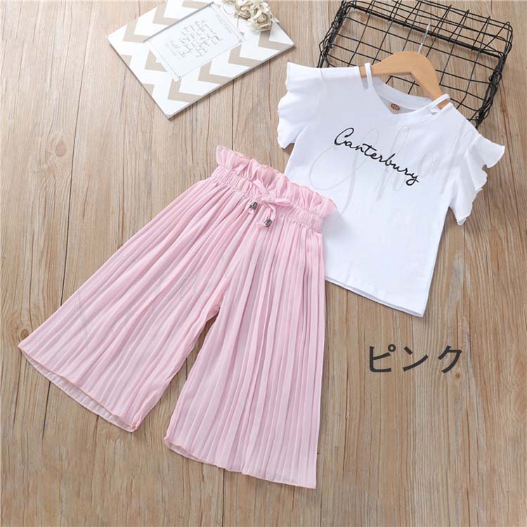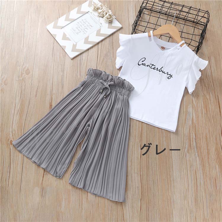 子供服 子ども服 女の子 夏 夏服 セットアップ カジュアル ナチュラル Tシャツ ワイドパンツ ふわふわ 上下 2点セット 3colors ピンク グレー グリーン 通学