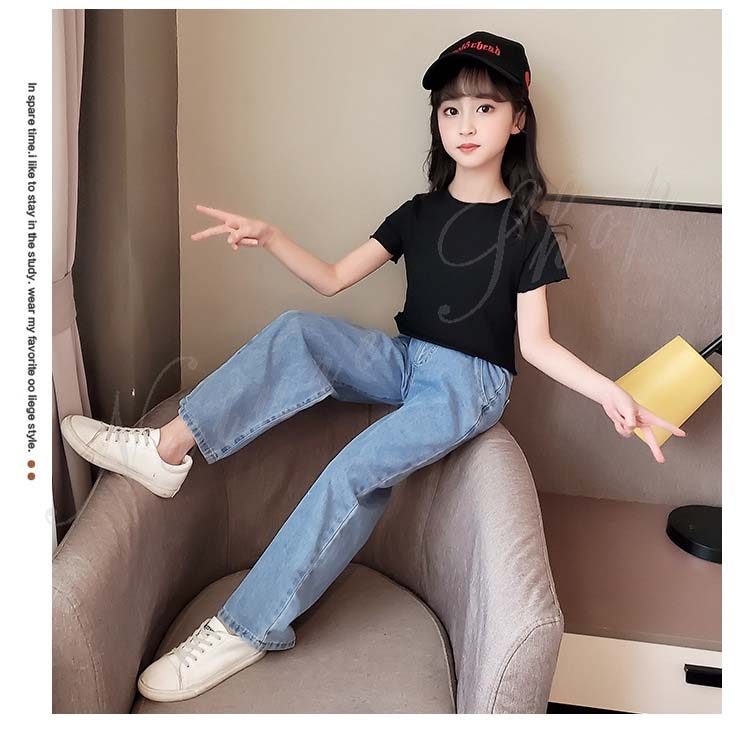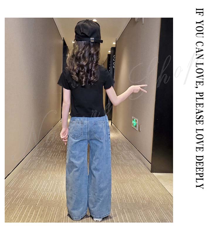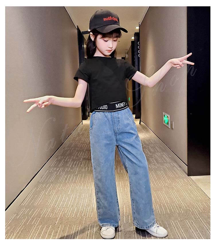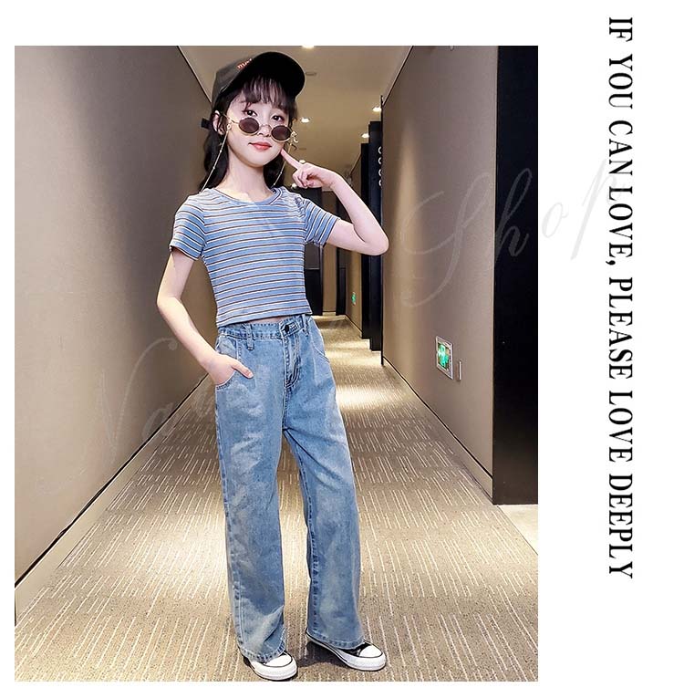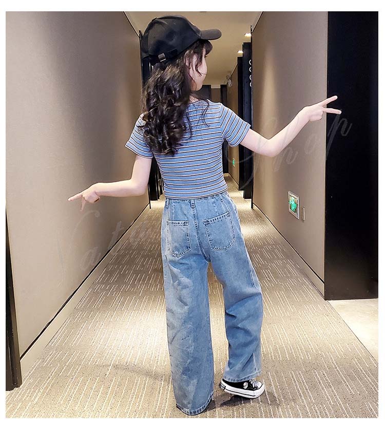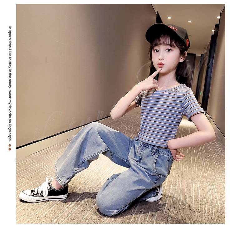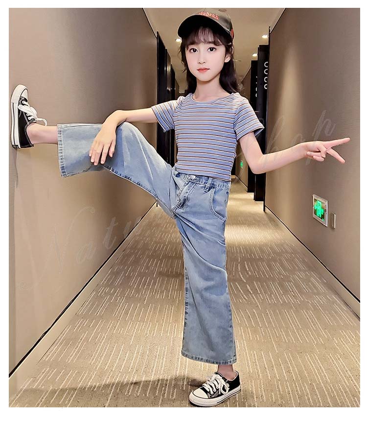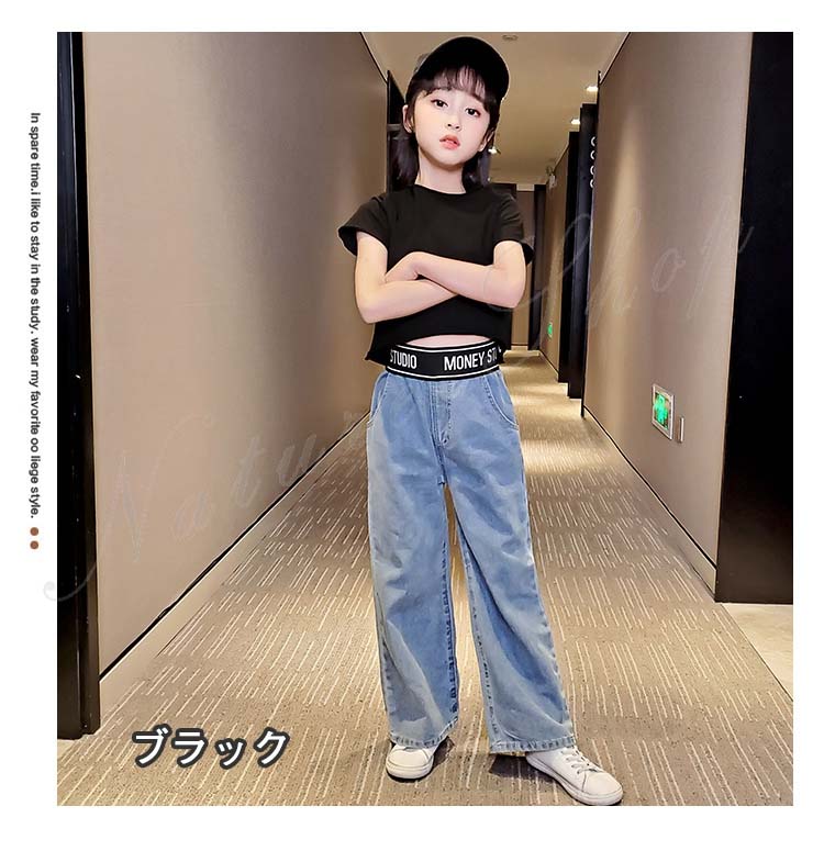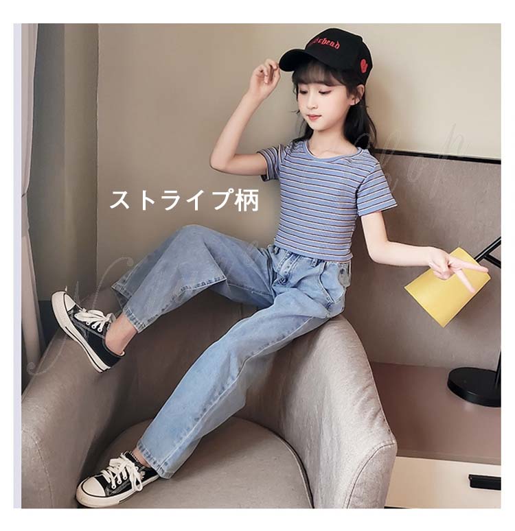 子供服 子ども服 女の子 夏 夏服 セットアップ カジュアル ナチュラル 半袖 Tシャツ ジーンズ 2colors ストライプ柄 ブラック ロング丈 デニム ズボン ワイドパンツ