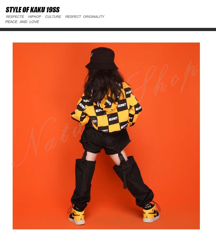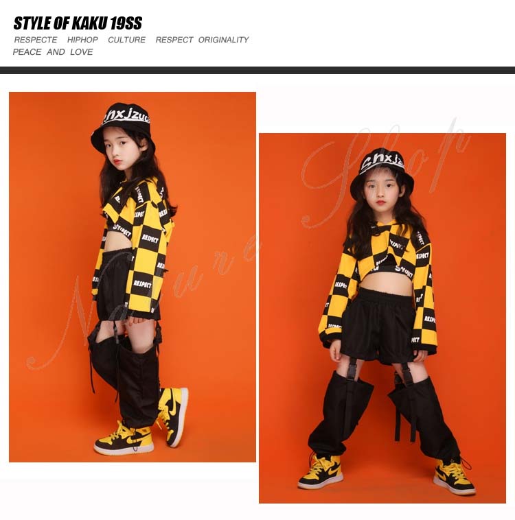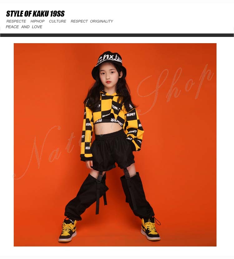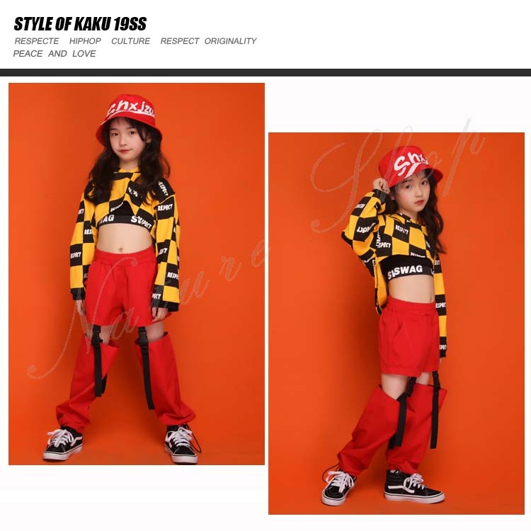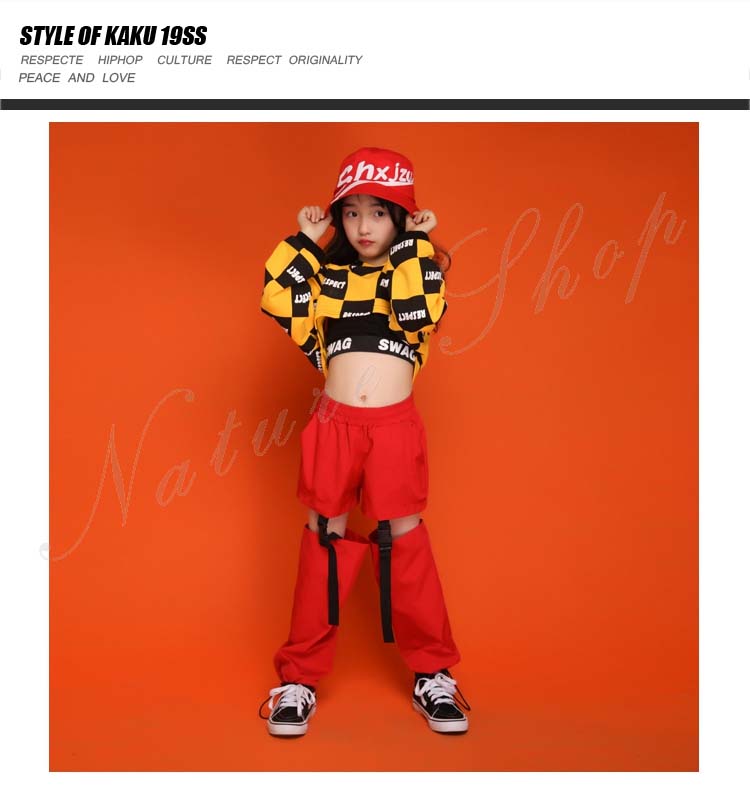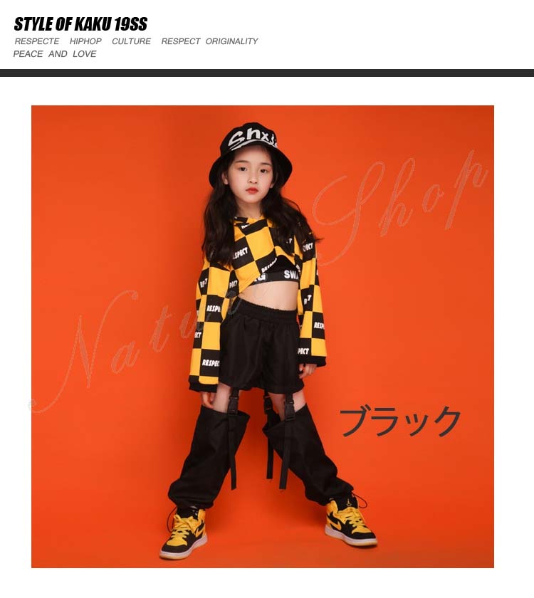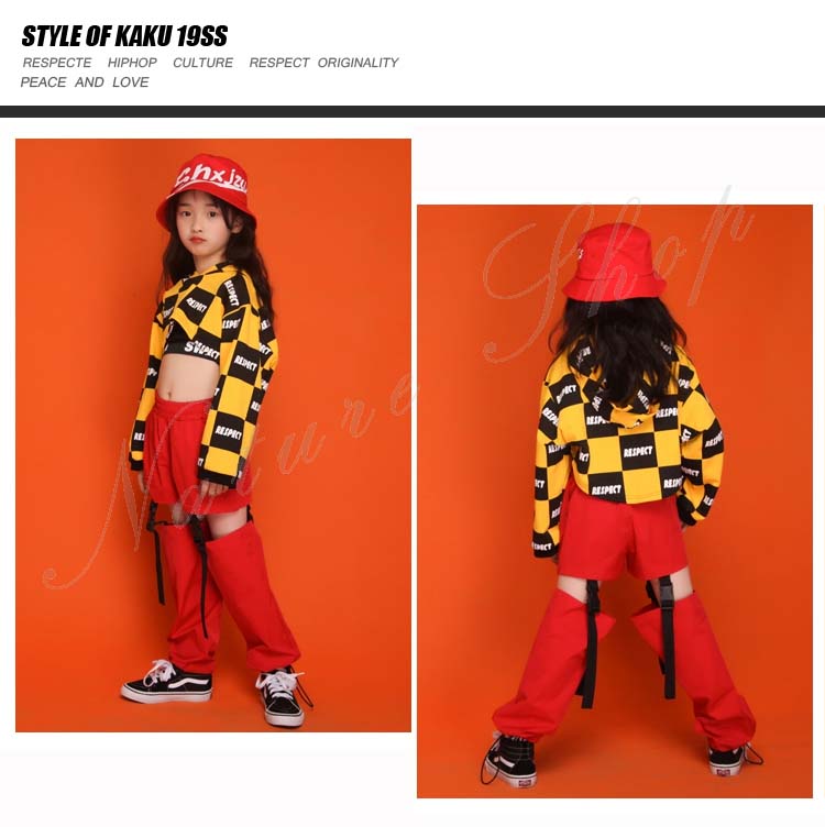ダンス衣装 キッズ セットアップ トップス パンツ 上下 長袖 イエロー パーかー へそ出し チェック柄 ロング丈 ズボン 3色パンツ 2点セット 3colors チェック柄 赤 黒