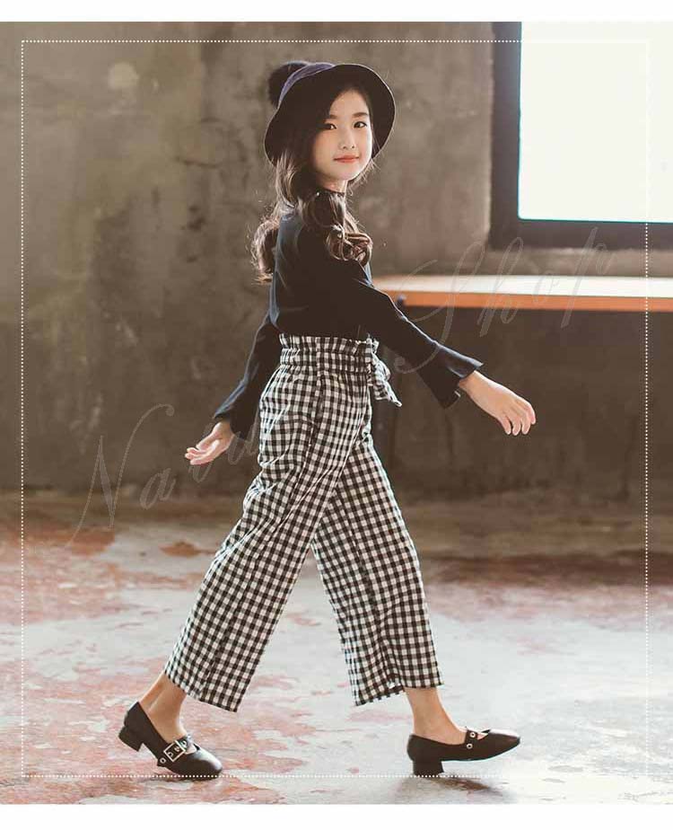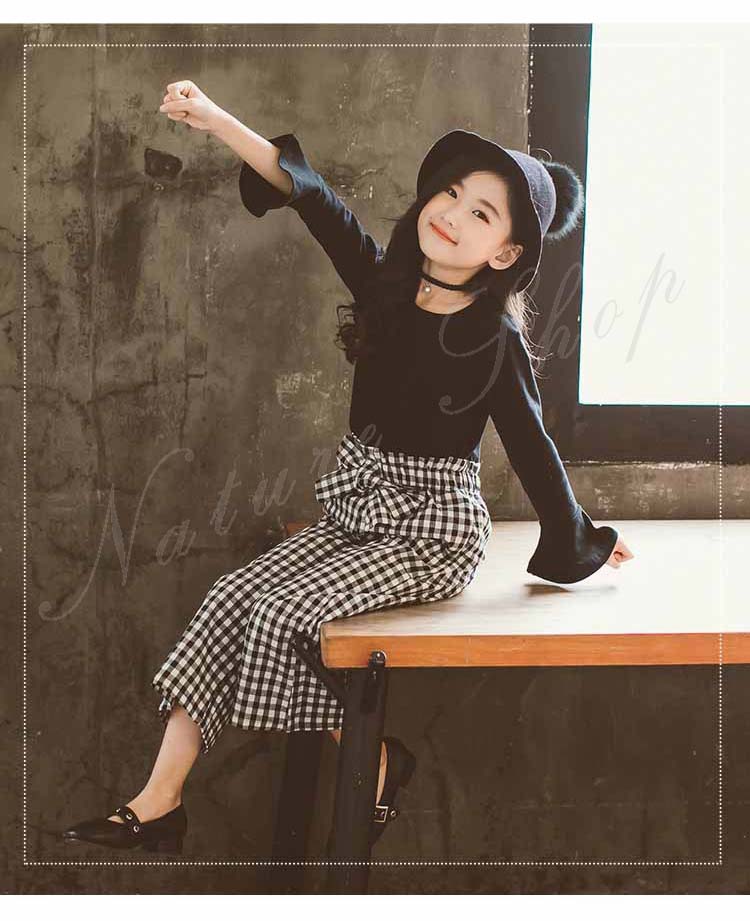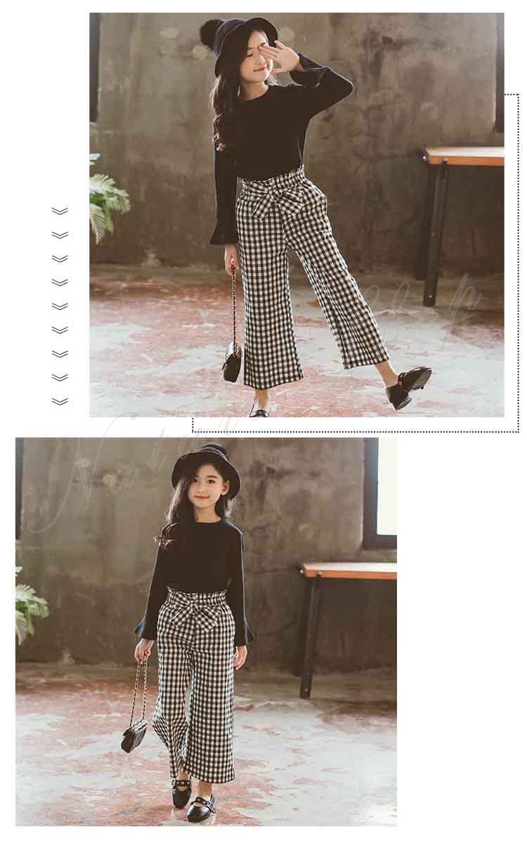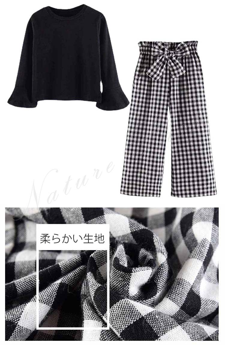 長袖 Tシャツ ワイドパンツ セットアップ レディース キッズ カジュアル おしゃれ 大きいサイズ 女の子 ラッパ袖 無地 Tシャツ ロング丈 ズボン チェック柄 リボン飾り