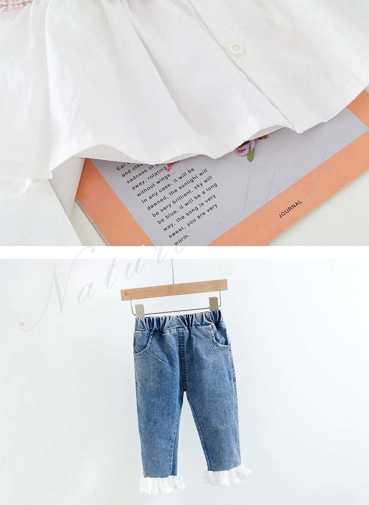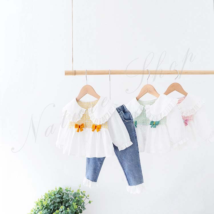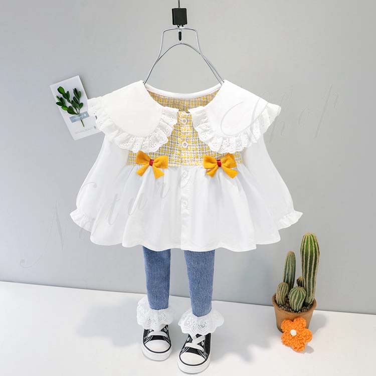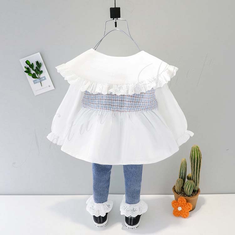 キッズ セットアップ 女の子 長袖 ブラウス ジーンズ 子供服 子ども服 女の子 セットアップ カジュアル ナチュラル フリル 折り襟 丸襟 リボン飾り デニムパンツ ロング丈