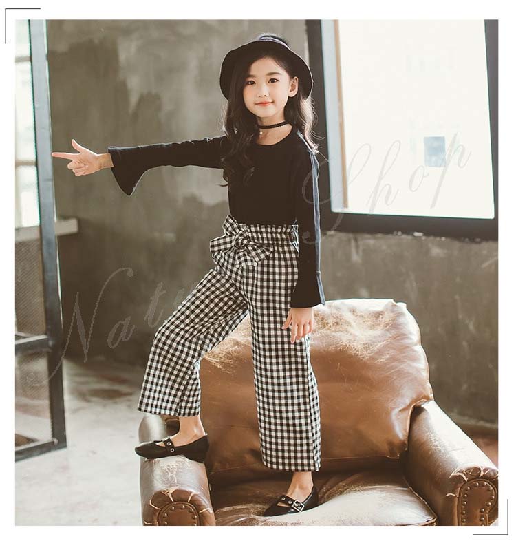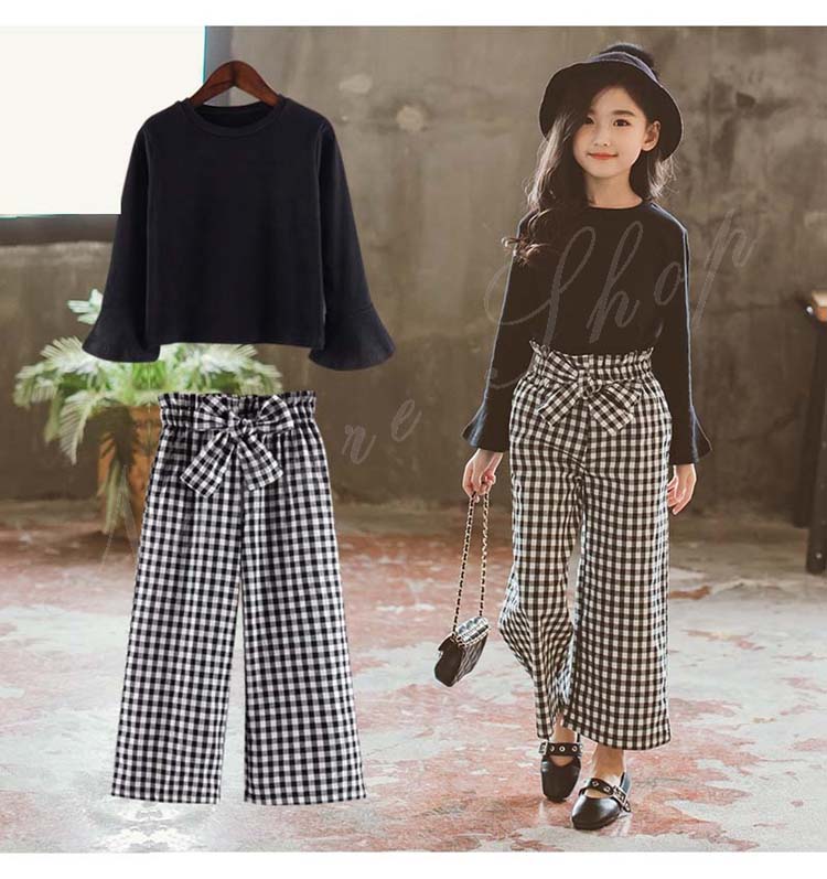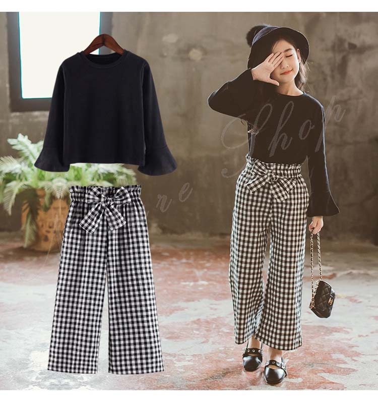 子ども 子供 カジュアル レディース 女の子 セットアップ 上下 2点セット 長袖 黒 Tシャツ ワイドパンツ 千鳥柄 チェック柄 ロング丈ズボン ジュニア 運動着 ダンス衣装