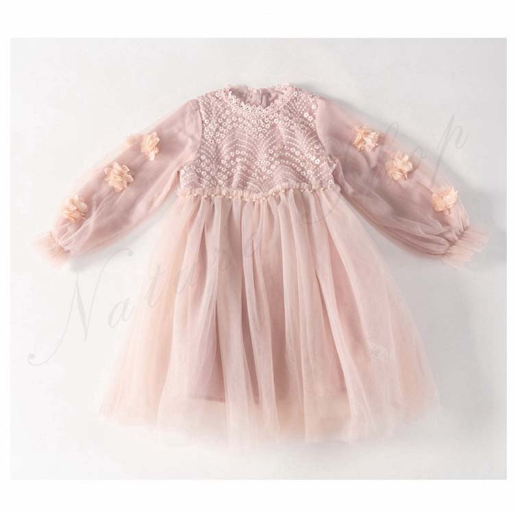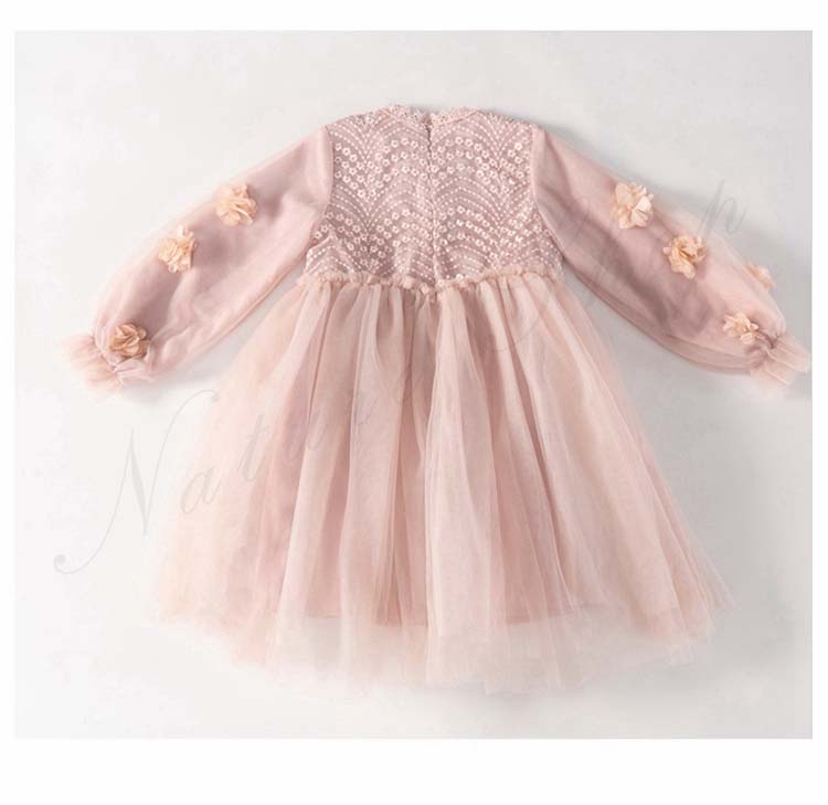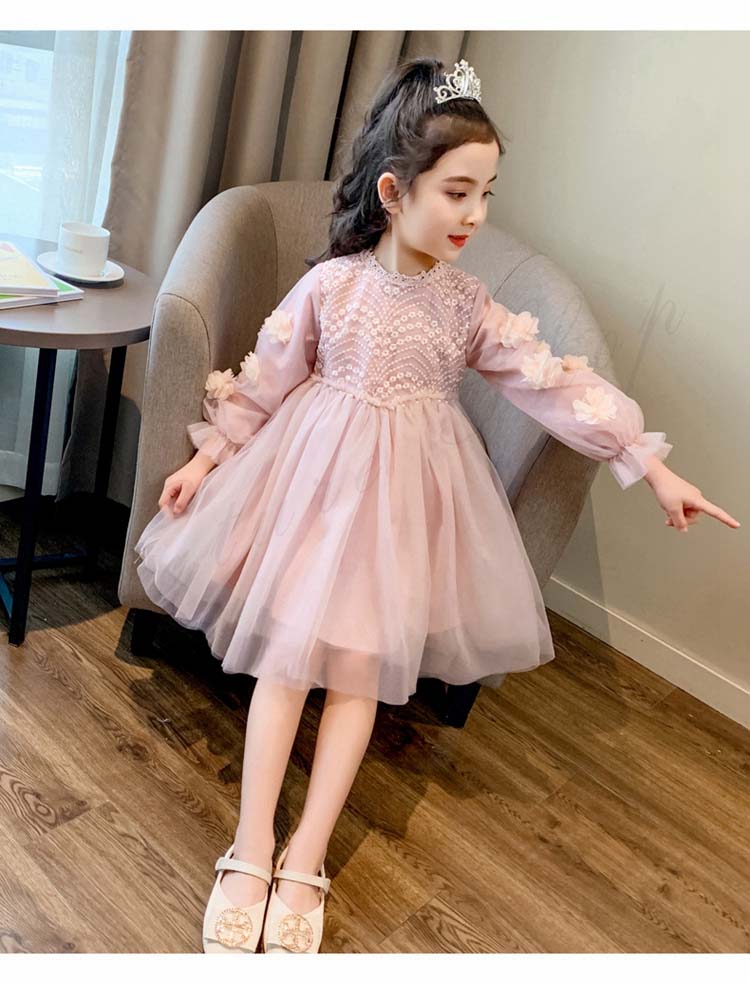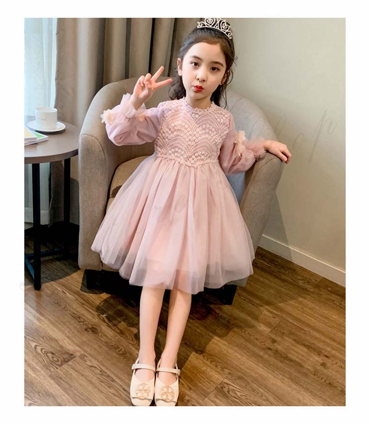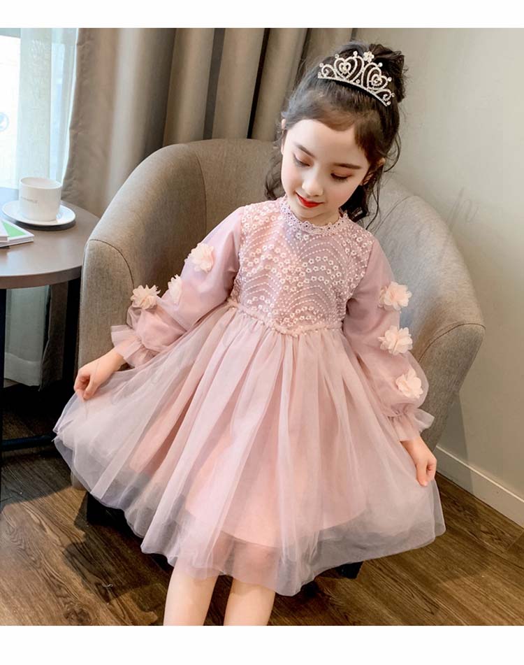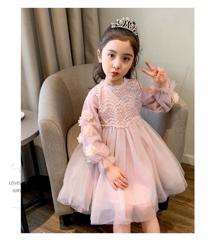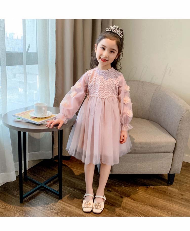 ジュニアドレス 子供 ドレス 発表会 ワンピース 長袖 ひざ丈 女の子 かわいい チュールスカート チュール ワンピース ピンク レース 花飾り オシャレ 110cm 120cm 130cm