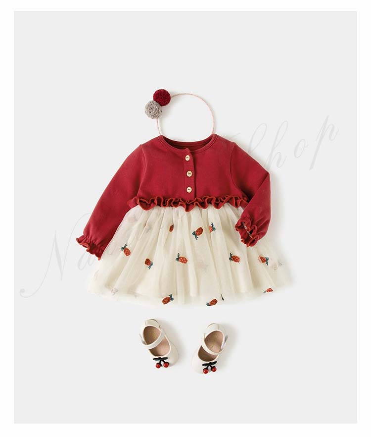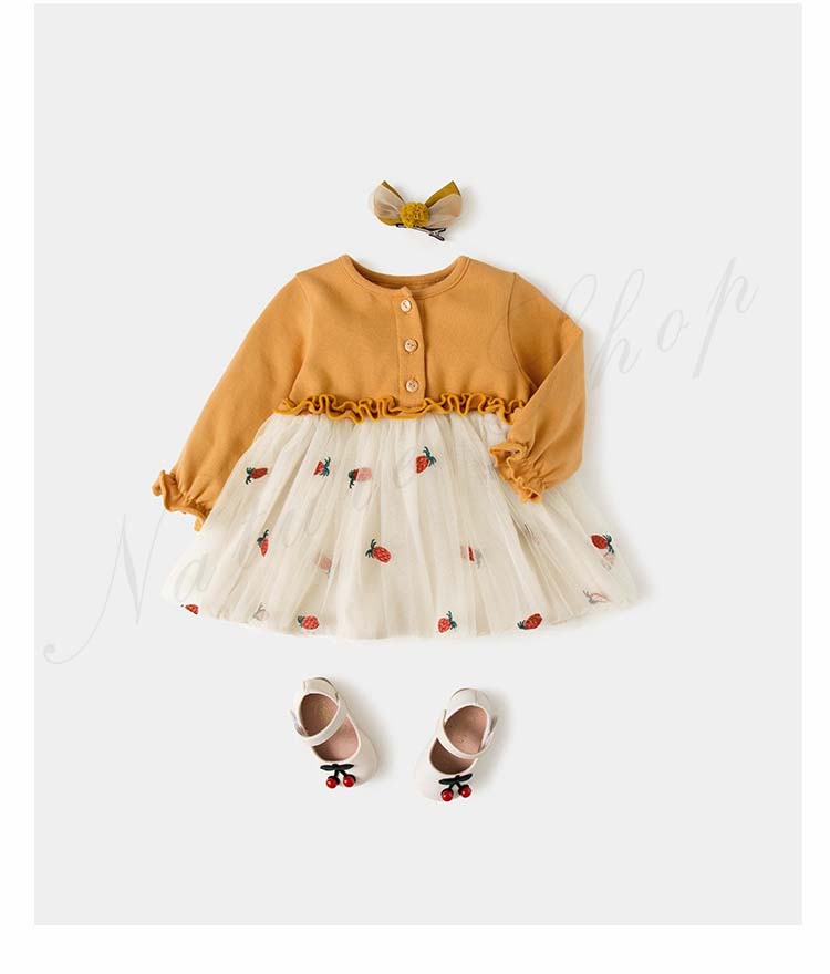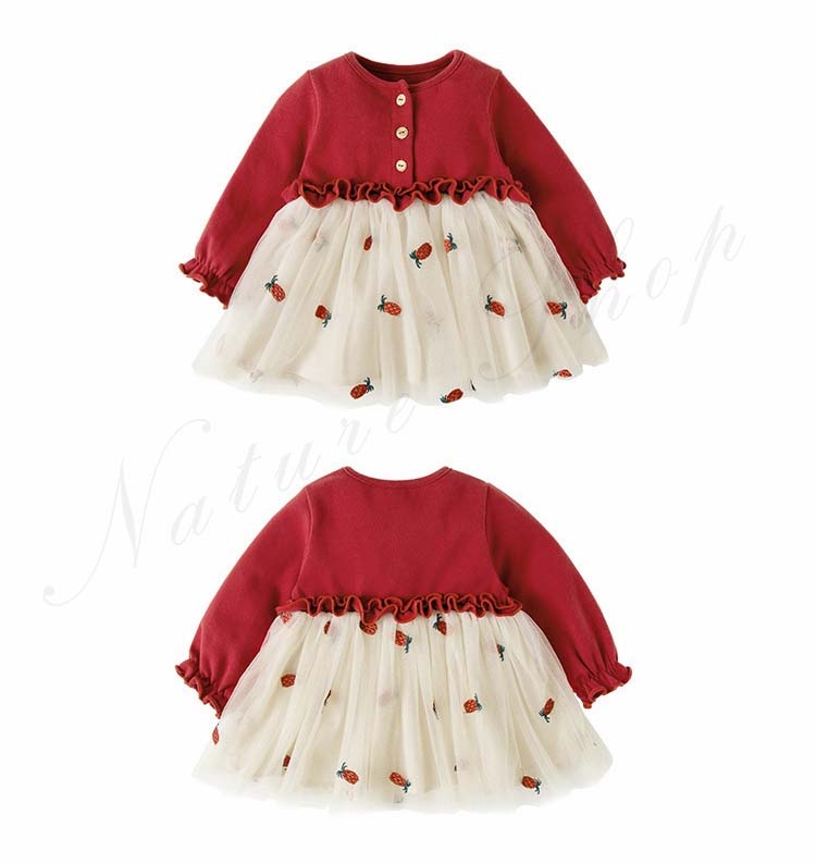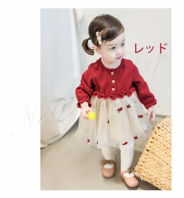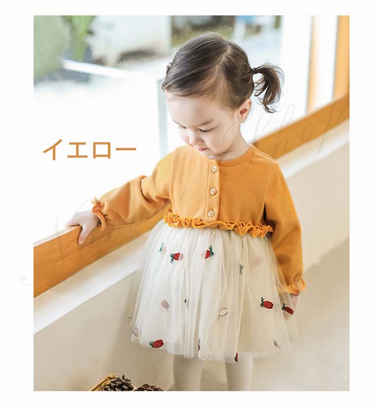 ベビードレス 新生児 子供ドレス 長袖 ひざ丈 ワンピース 可愛い オシャレ 普段着 私服 女の子 チュールスカート チュール ワンピース 果物柄 総柄 かわいい 赤 黄色