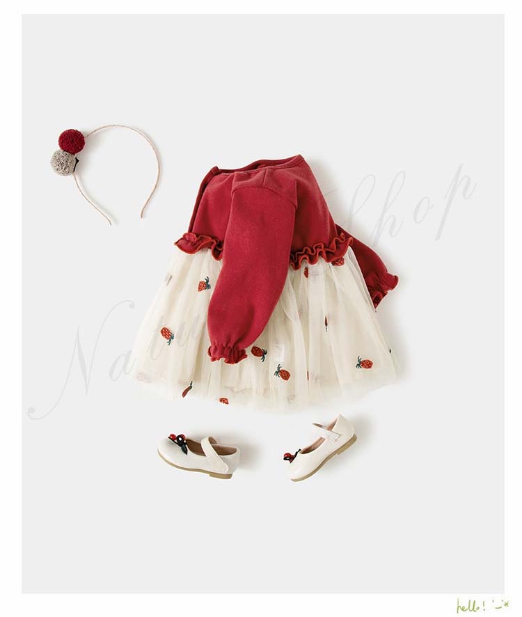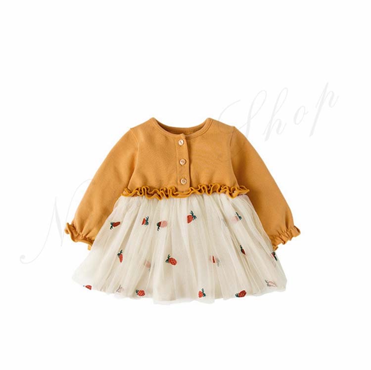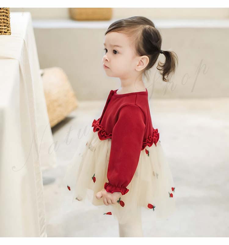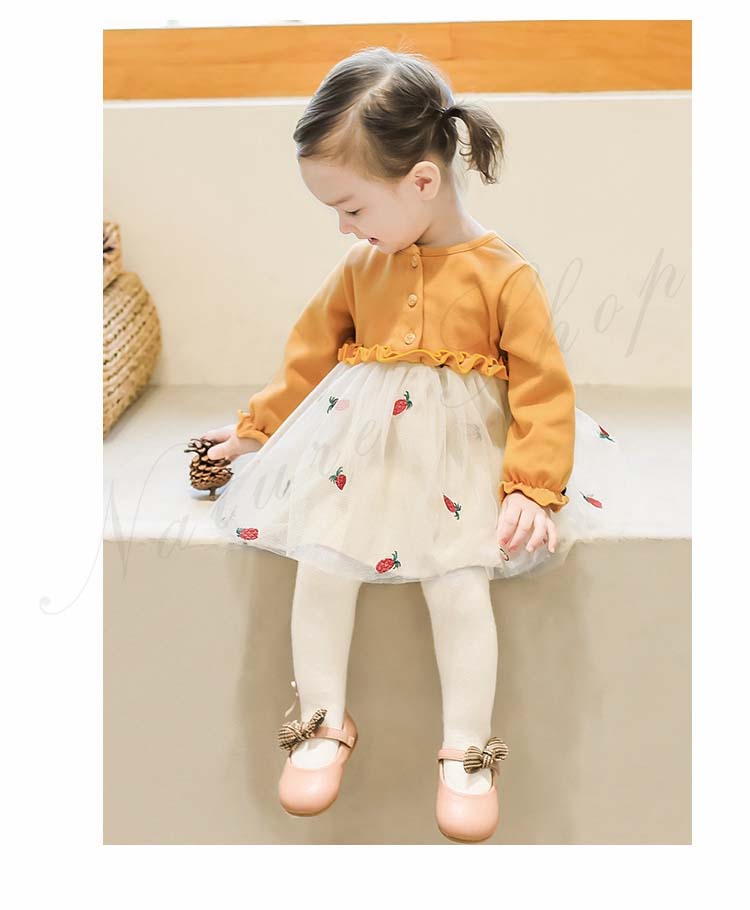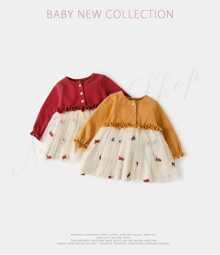 ベビードレス 新生児 子供ドレス 長袖 ひざ丈 ワンピース 可愛い オシャレ 普段着 私服 女の子 チュールスカート チュール ワンピース 果物柄 総柄 かわいい 赤 黄色