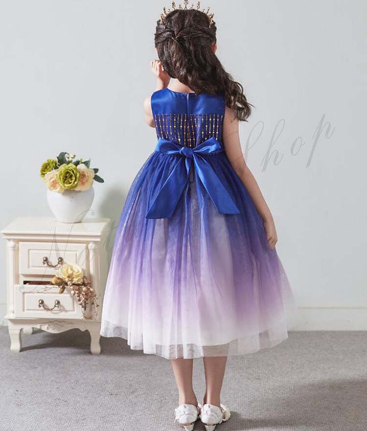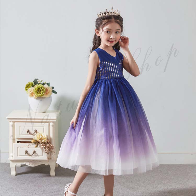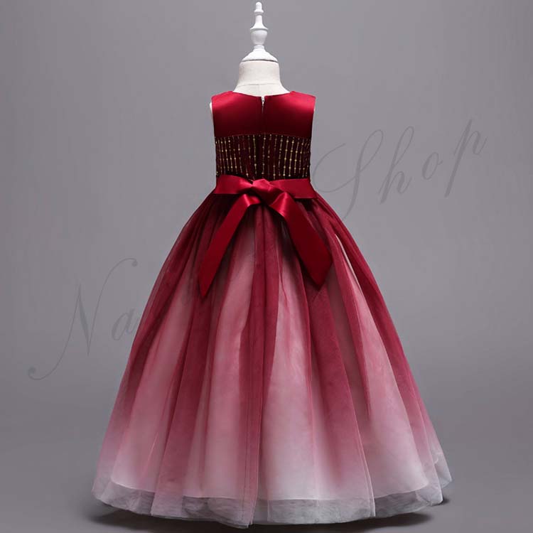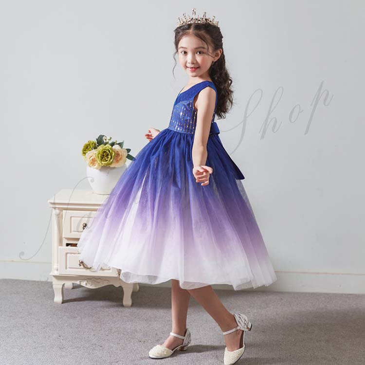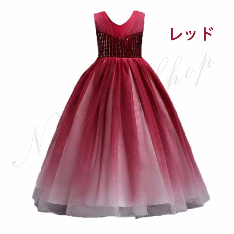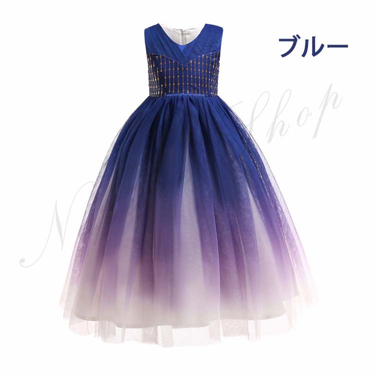 ロングドレス 演奏会 ジュニア ピアノ 発表会 大きいサイズ vネック 袖なし ノースリーブ グラデーション スパンコール 飾り 後ろリボン ミモレ丈 ドレス 子供 ピアノ 発表会
