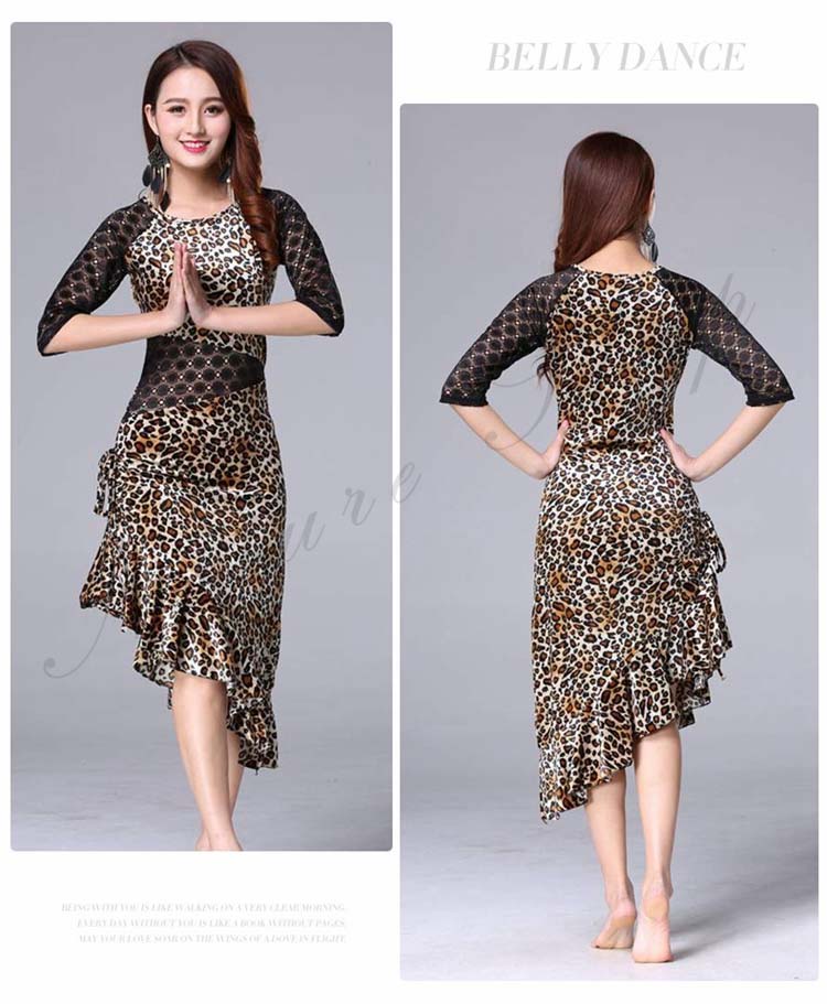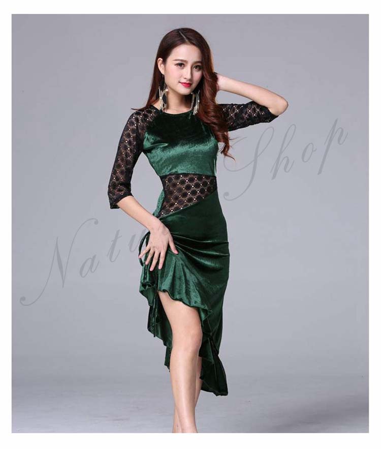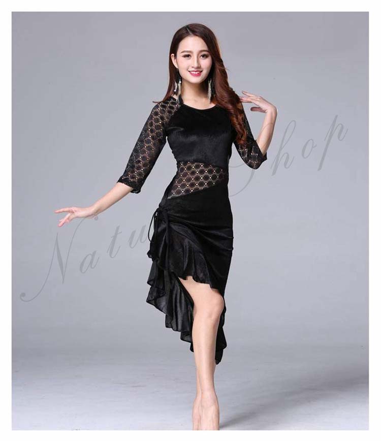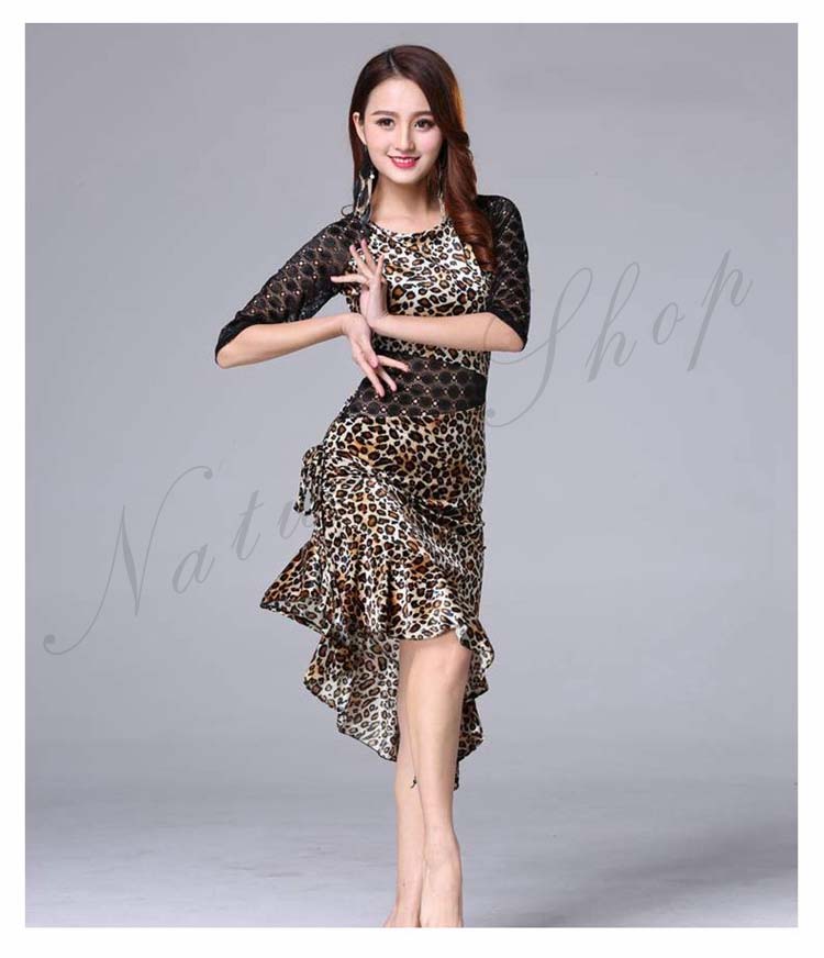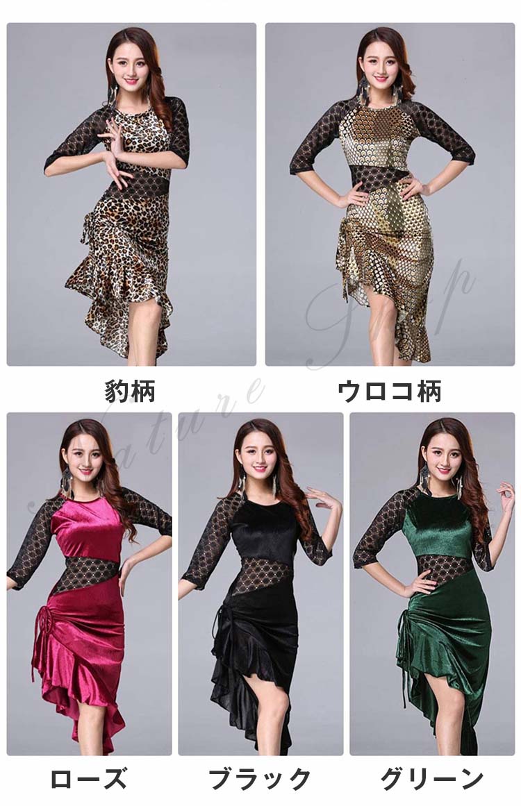 大人 レッスン着 衣装 黒 ストレッチ 緑 社交ダンス ローズ ラテンダンス 練習着 フリル裾 膝丈 レース 豹柄 ヒョウ柄 アシンメトリー ダンス M 五分袖 ワンピース 斜め 美シルエット