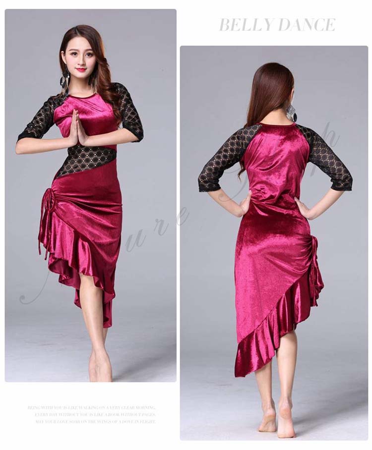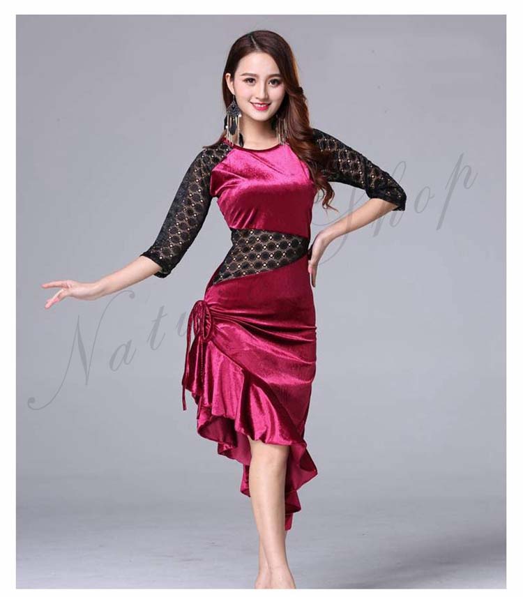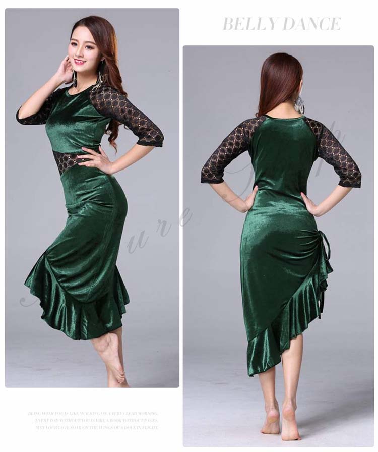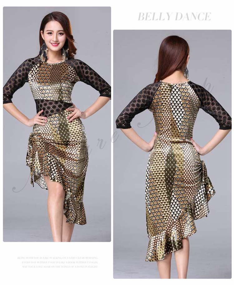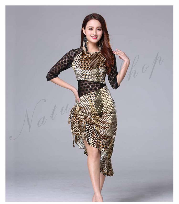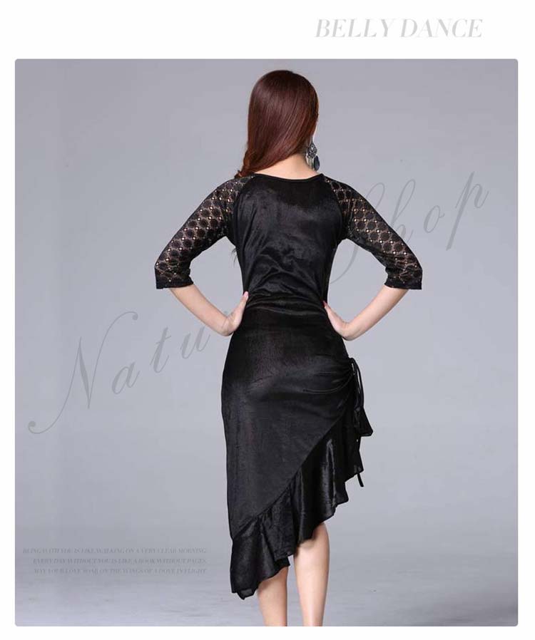 大人 レッスン着 衣装 黒 ストレッチ 緑 社交ダンス ローズ ラテンダンス 練習着 フリル裾 膝丈 レース 豹柄 ヒョウ柄 アシンメトリー ダンス M 五分袖 ワンピース 斜め 美シルエット