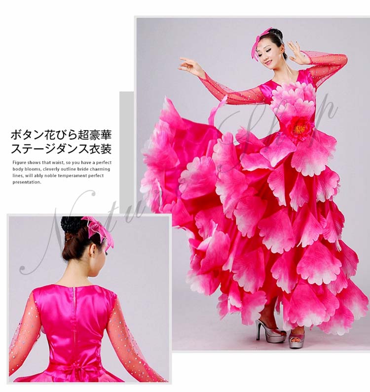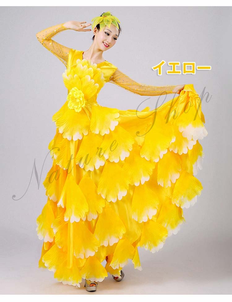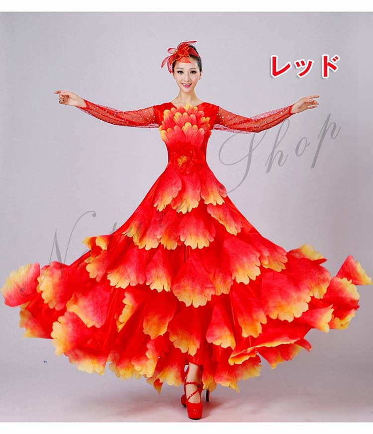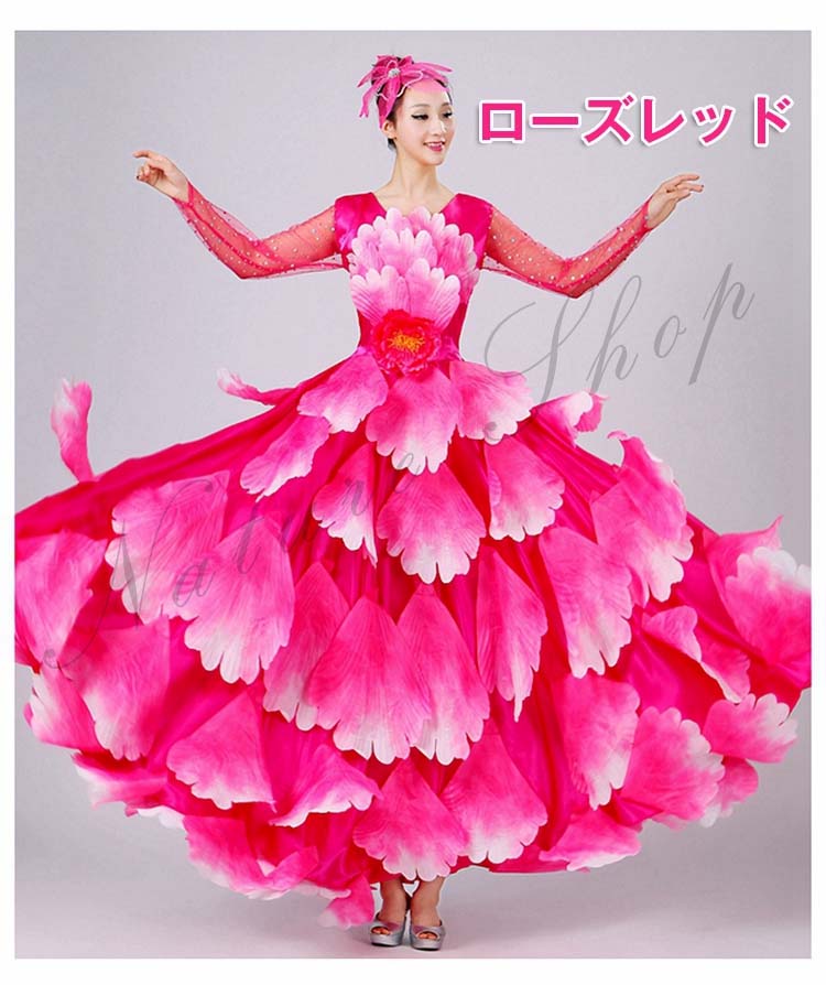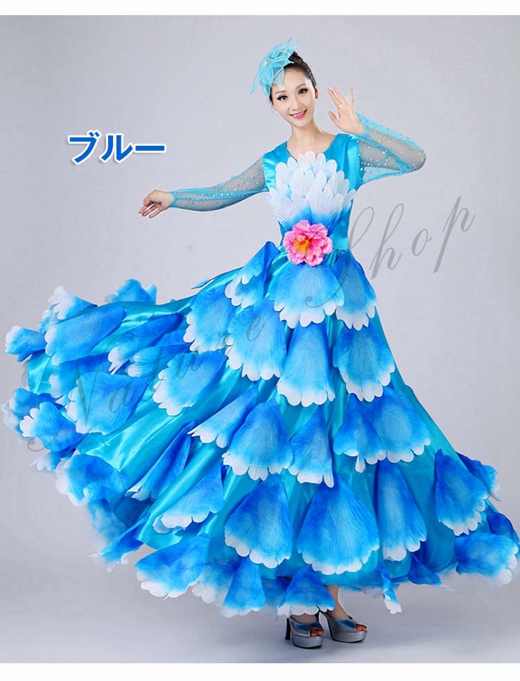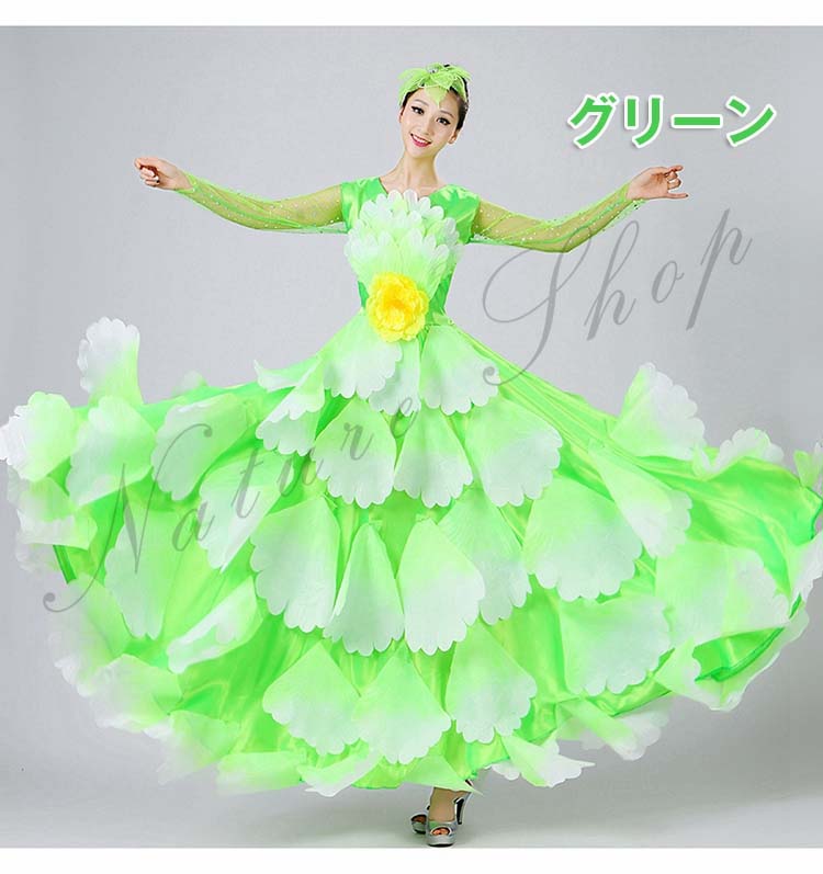 ボタン花びら超豪華ステージダンス衣装 民族舞踊 舞台演出ロングドレス モダンドレス 合唱団社交ダンス衣装 イベント撮影演出服 ワルツ裾ワタリ360°540°720°選択可 5色