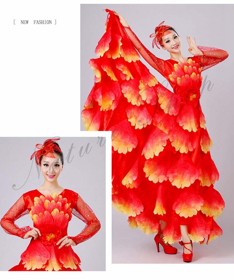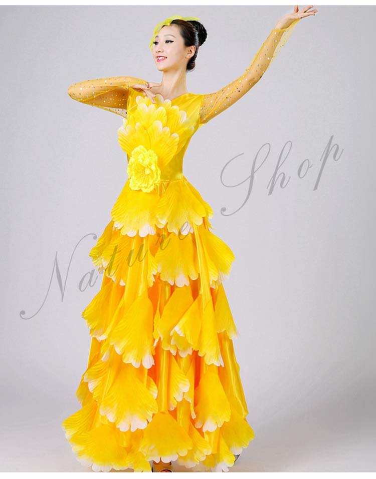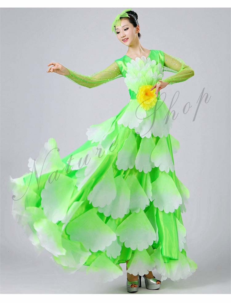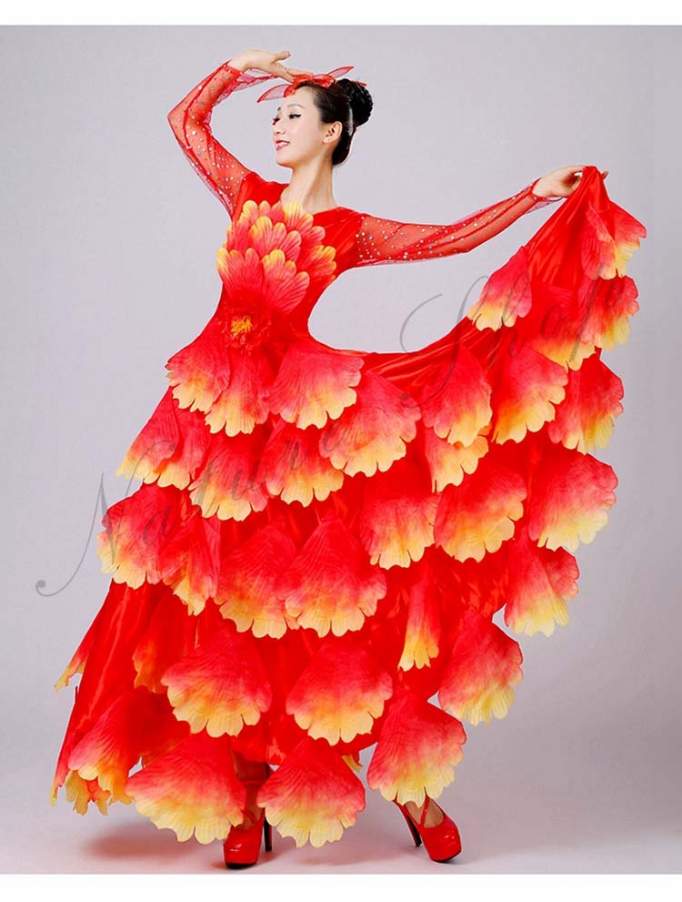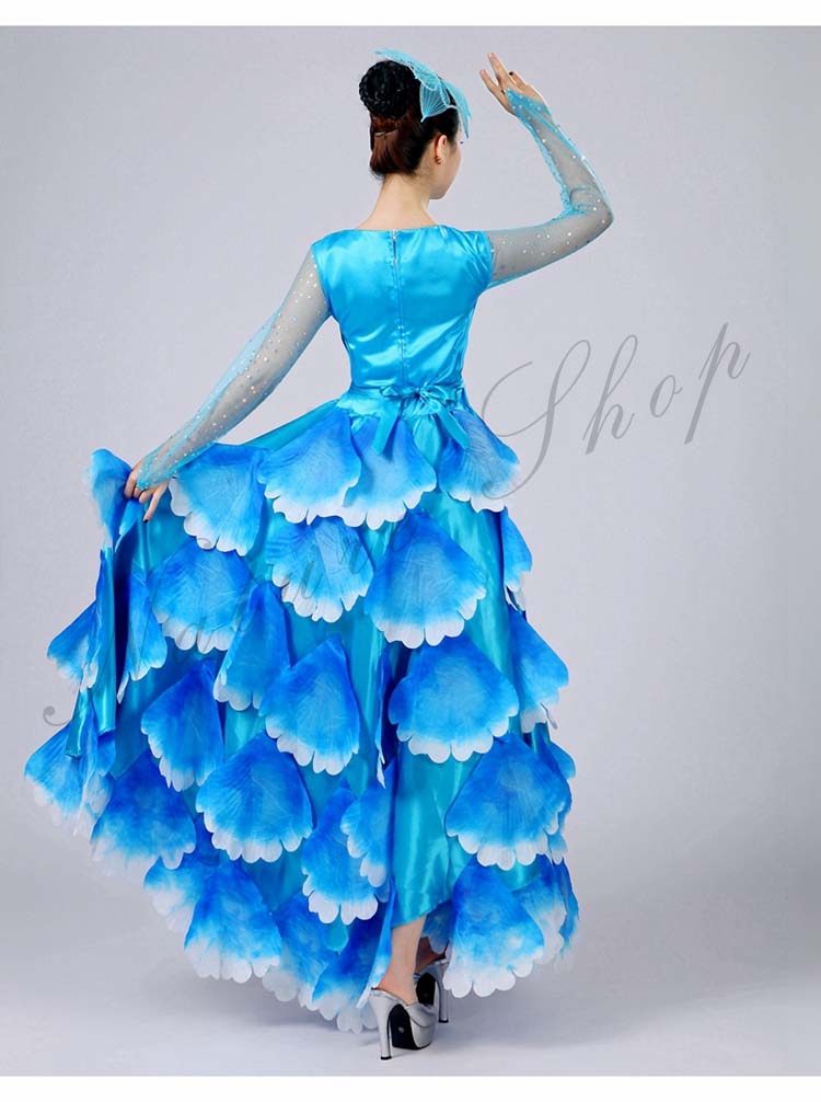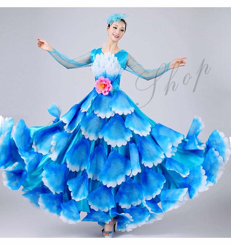 ボタン花びら超豪華ステージダンス衣装 民族舞踊 舞台演出ロングドレス モダンドレス 合唱団社交ダンス衣装 イベント撮影演出服 ワルツ裾ワタリ360°540°720°選択可 5色