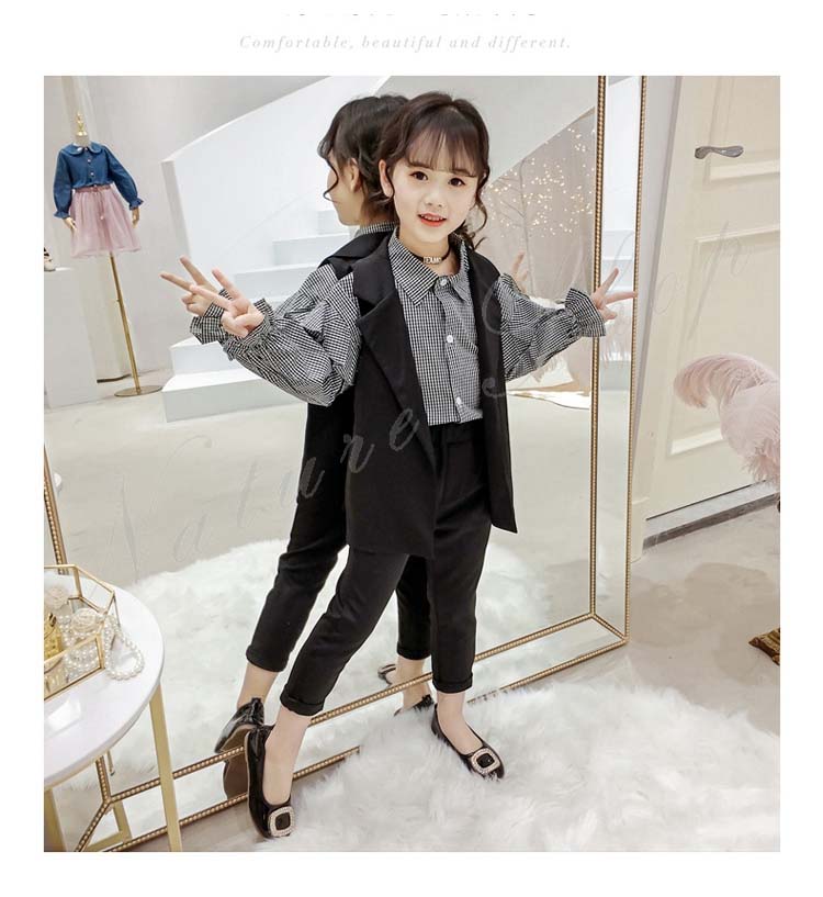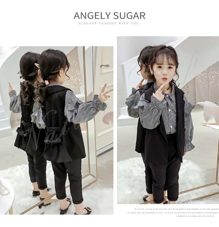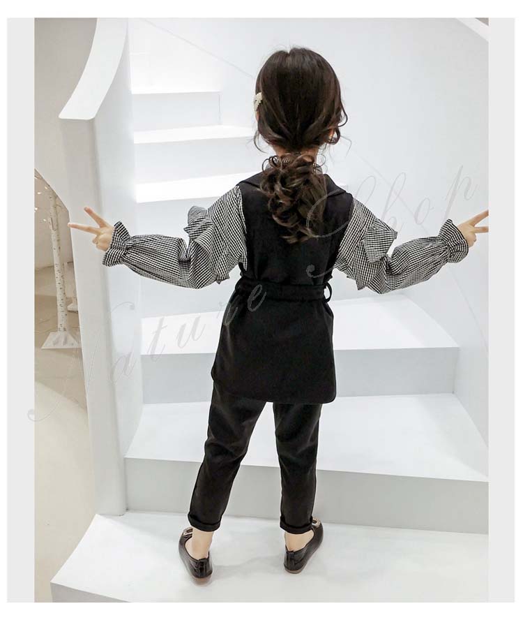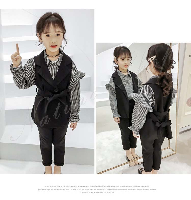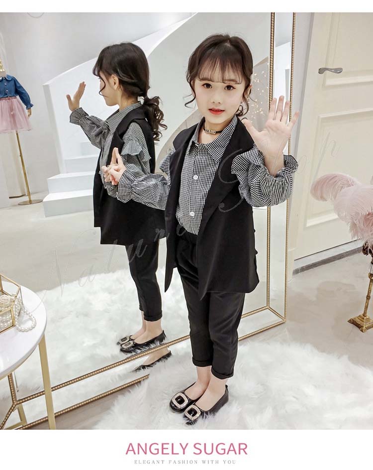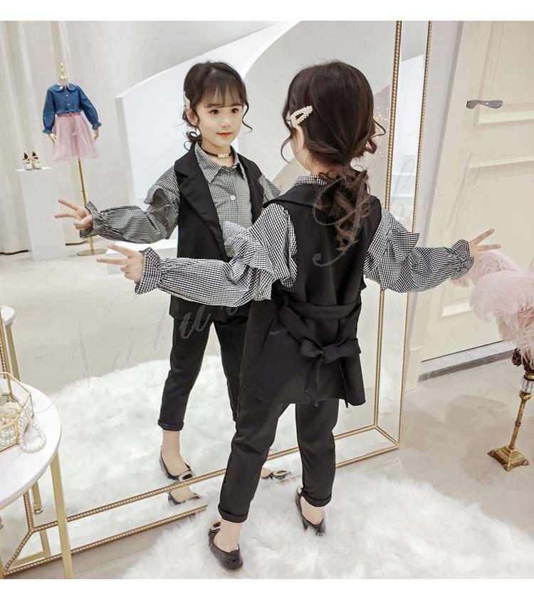 子供 スーツ 結婚式 親族 表彰式 フォーマルスーツ 女の子 おしゃれ こども 上下セット シャツ 長袖 チェック柄 フリル スーツ ベスト 黒 長ズボン ロング丈パンツ 無地
