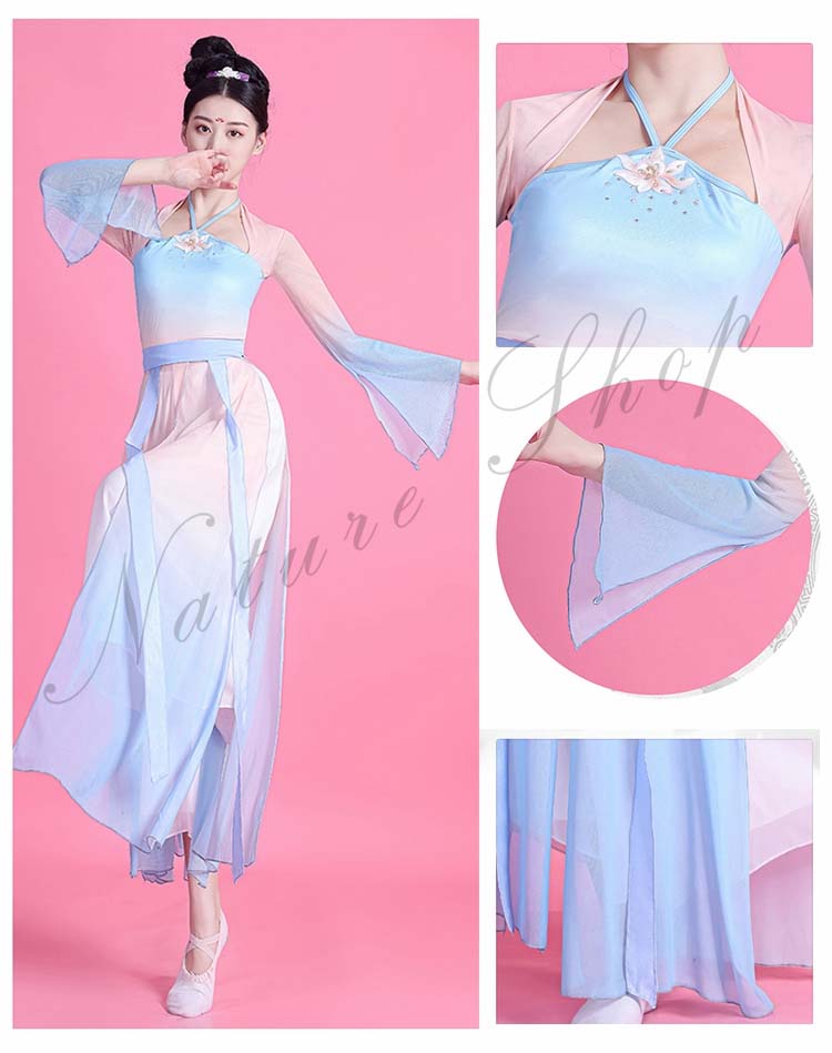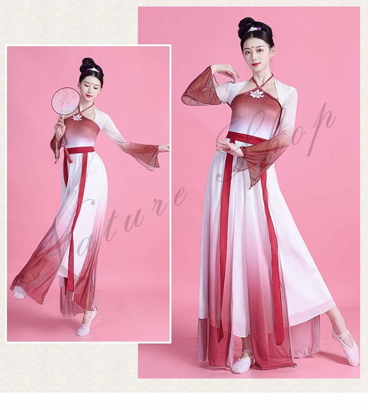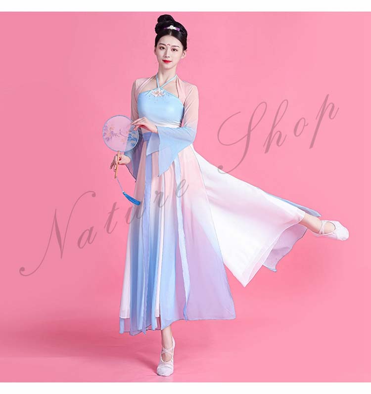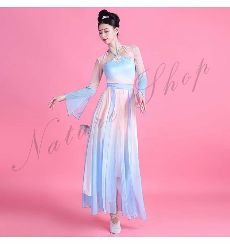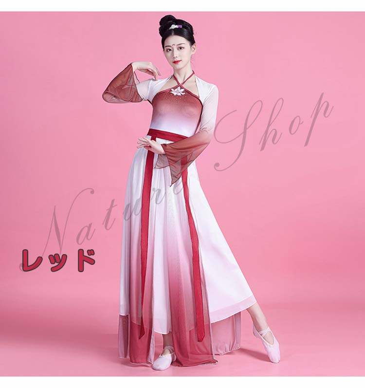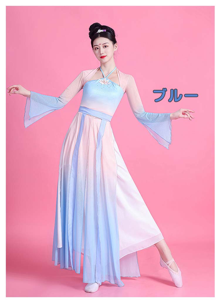 ダンス衣装 レディース エスニック グラデーション 古典中国 衣装 民族風 ワンピース 中華ダンスウェア Vネック 長袖 ロング丈 ダンス 箏 練習着 舞踊ダンス 演奏衣装 可愛い リボン