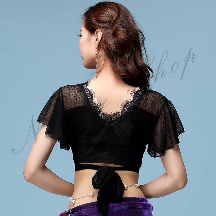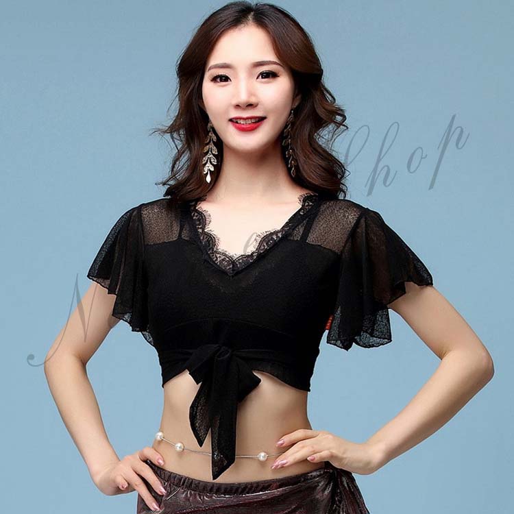 黒 DS舞台ステージ演出衣装 レースブラウス ラテンダンス衣装 レディース半袖ベリーダンス衣装 リボン バレエ レース ダンスウエアレッスン着 へそ出し羽織ボレロ