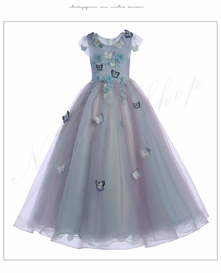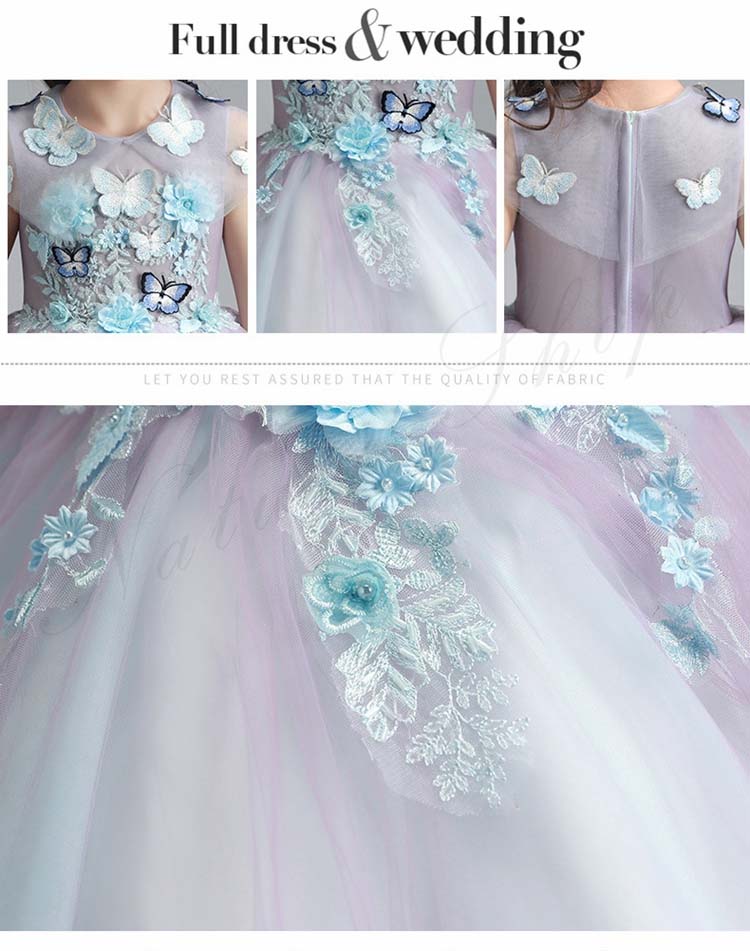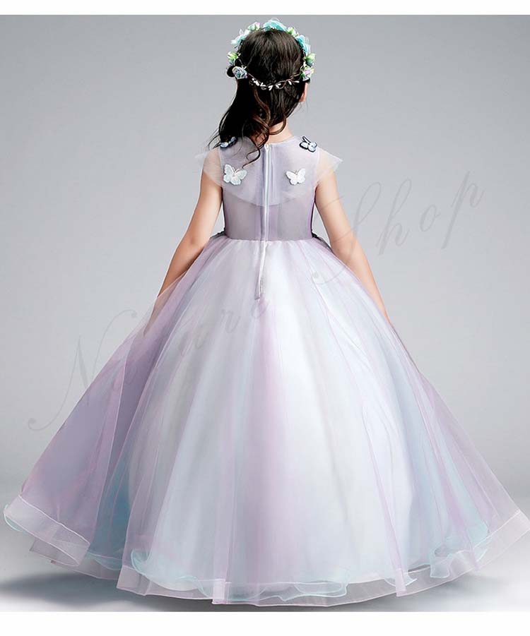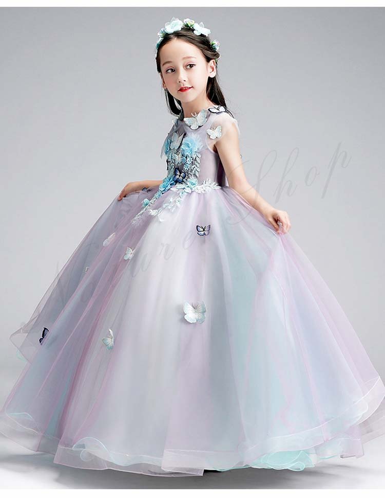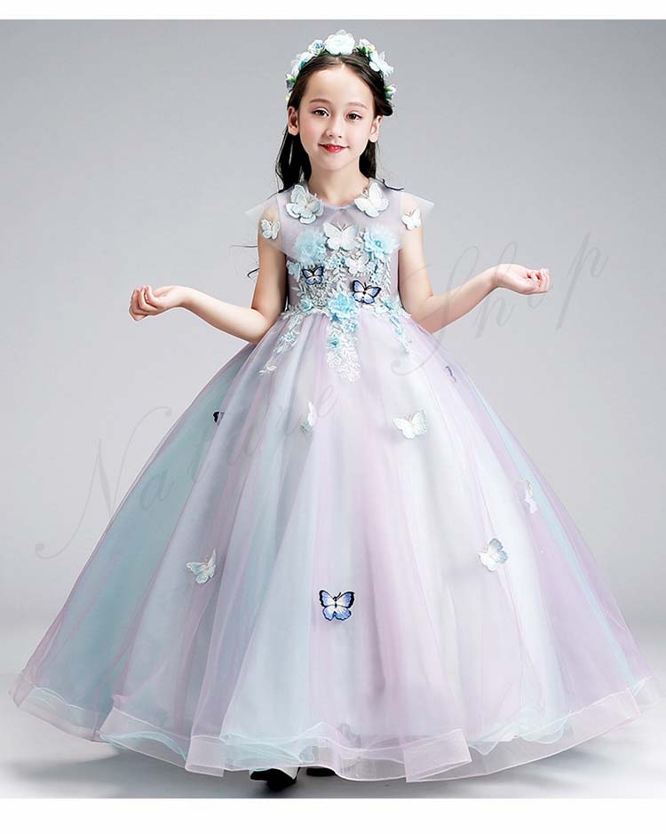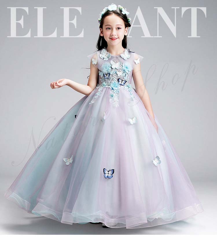 ジュニア コンクール ドレス 子供 ドレス ピアノ 発表会 ワンピース 袖なし ロング 花 刺繍 蝶飾り ファッション オシャレ ウェディングドレス チュールスカート