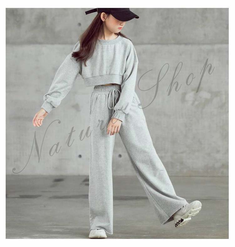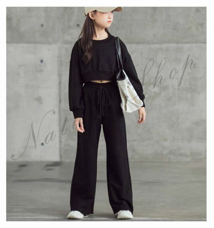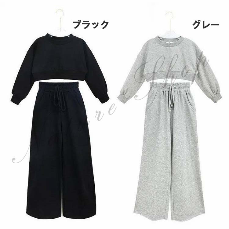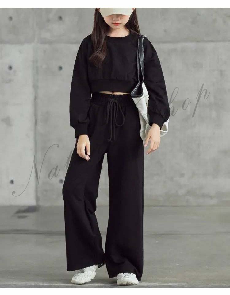 セットアップ レディース キッズ 女の子 大きいサイズ カジュアル おしゃれ オフィス ショートスウェット へそ出し 長ズボン 黒 上下 2点セット フォーマル ダンス衣装