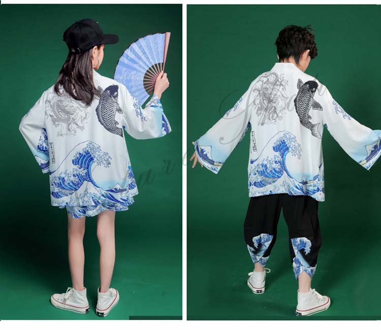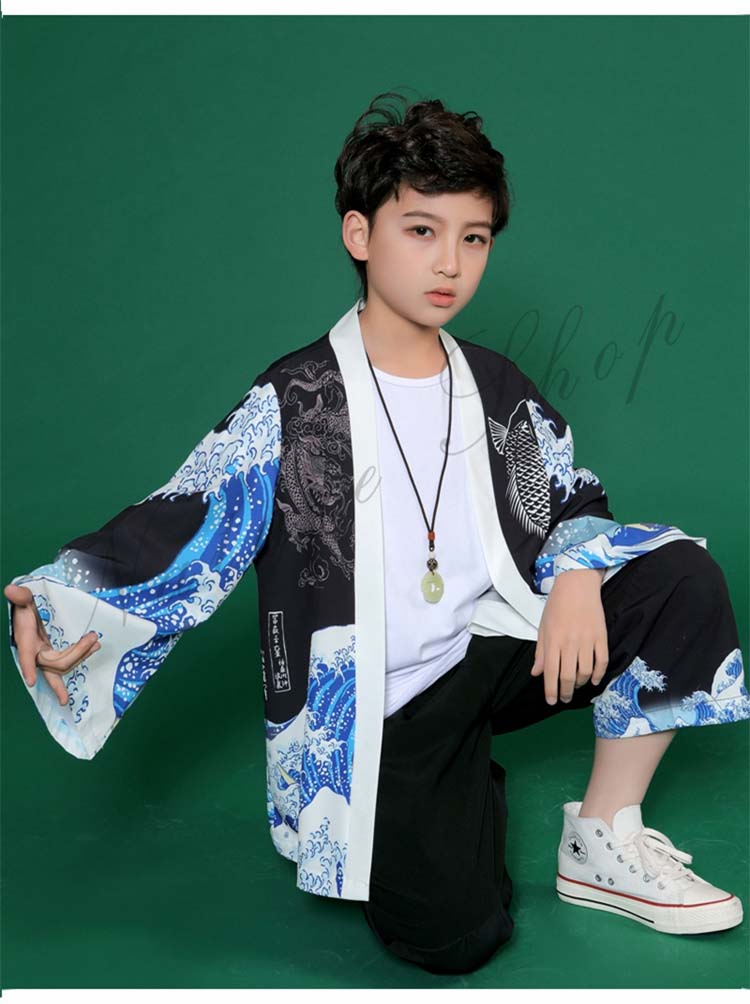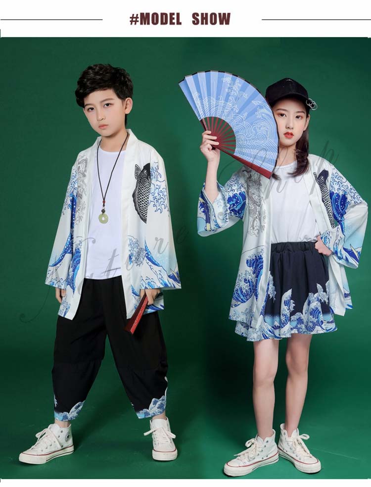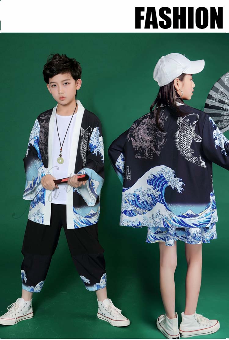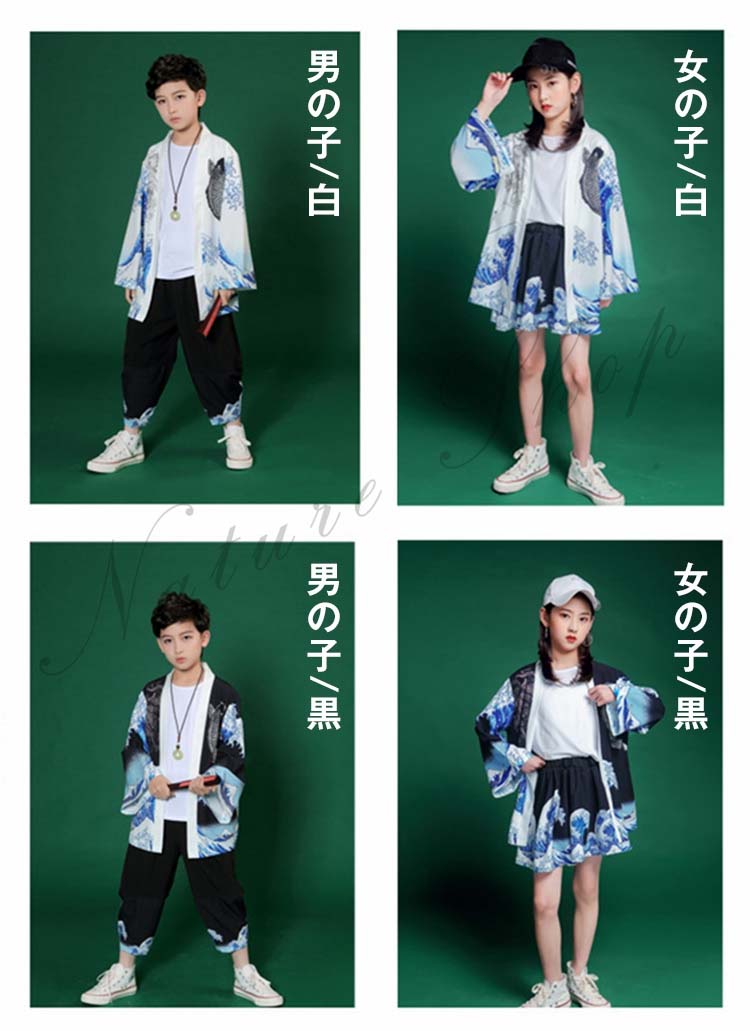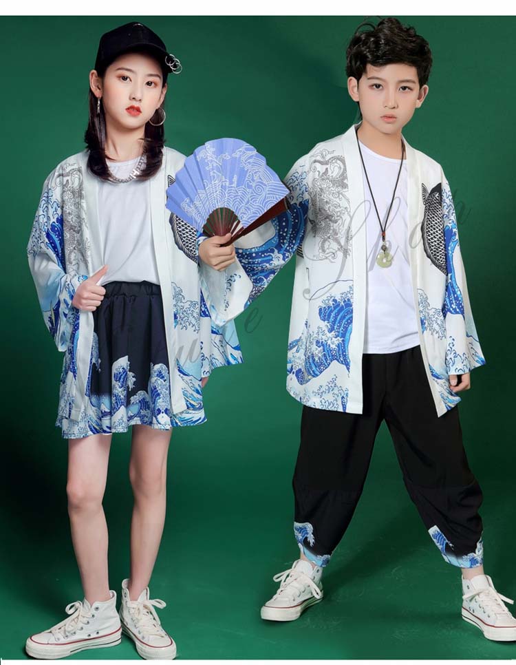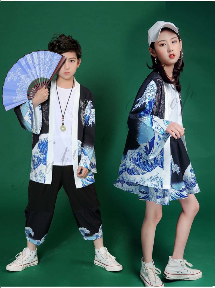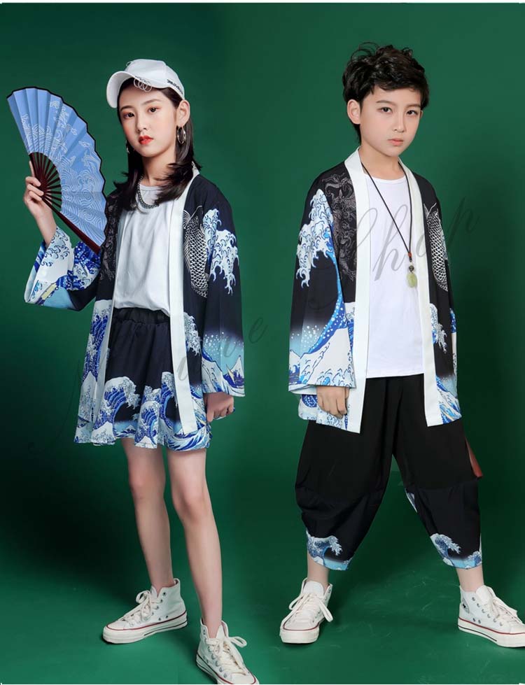 ヒップホップ 子供 ダンス衣装 和風舞台服 ステージ衣装 男の子 女の子 3点セット トップス Tシャツ パンツ スカート 袴風 キッズ カンフー 武術 表演服 モデルショー 公演服