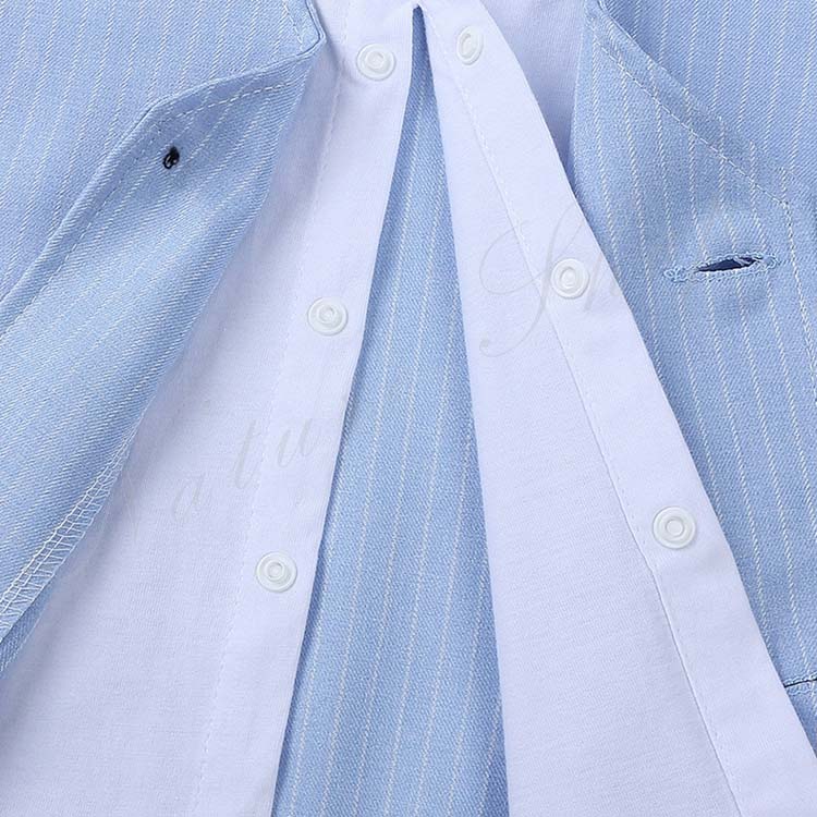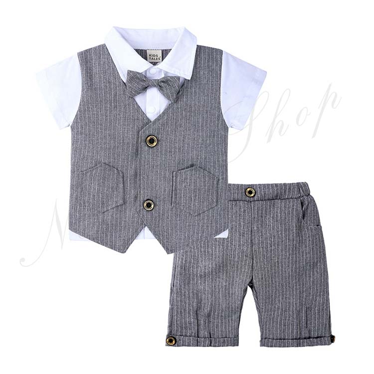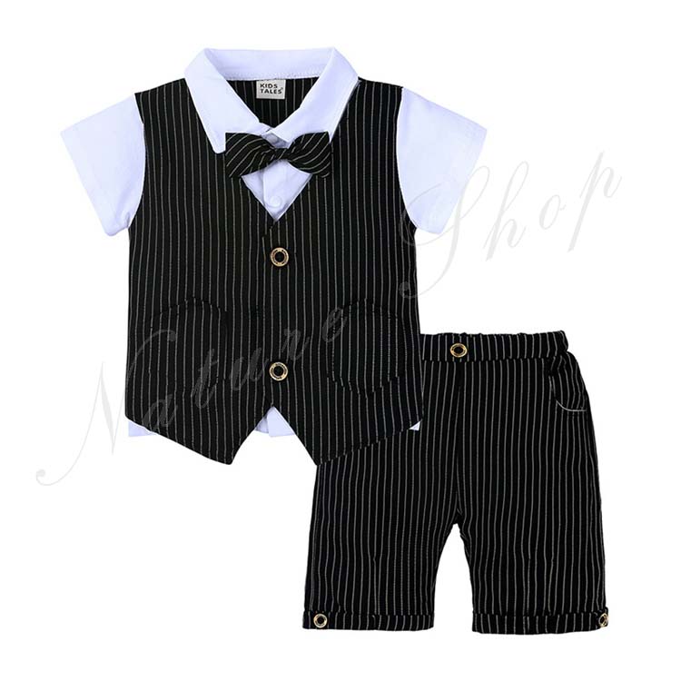 子供服 フォーマル 男の子 セットアップ 夏服 半袖 シャツ リボン ベスト 飾り 長ズボン ストライプ柄 3colors 黒 灰色 白 80 90 100 110cm フォーマルスーツ 結婚式 通学