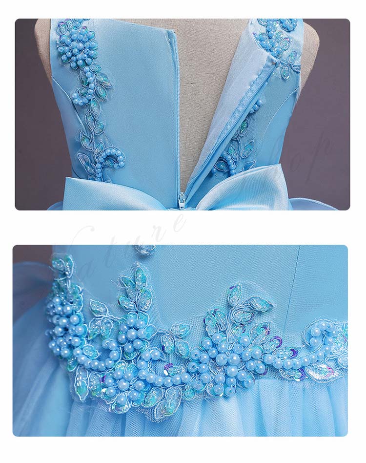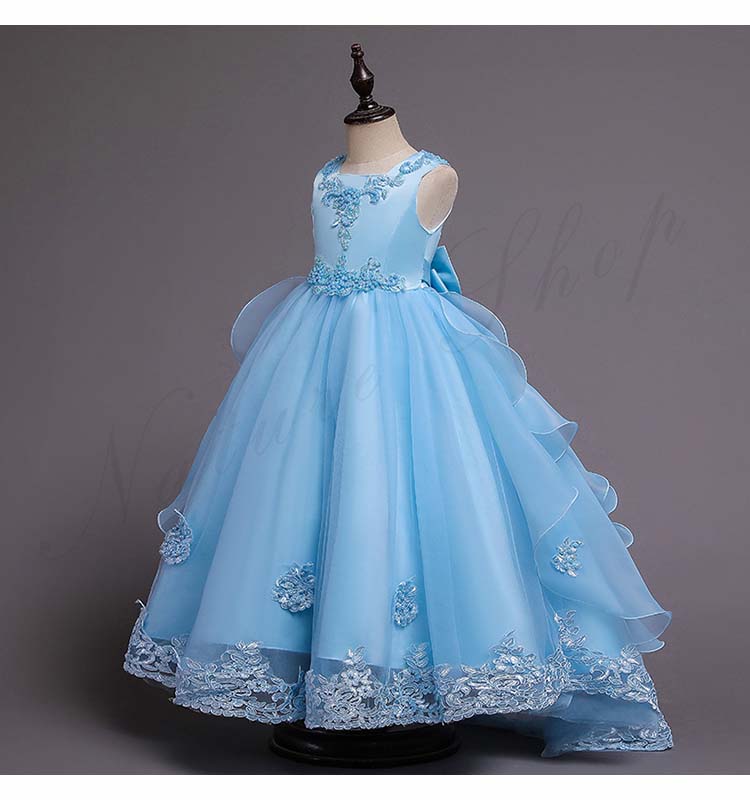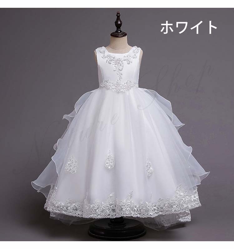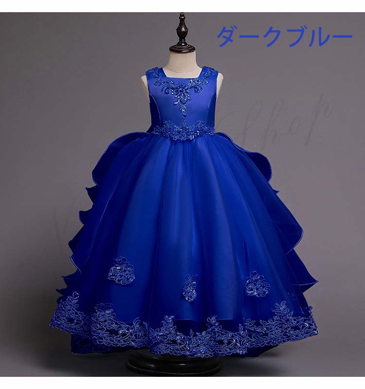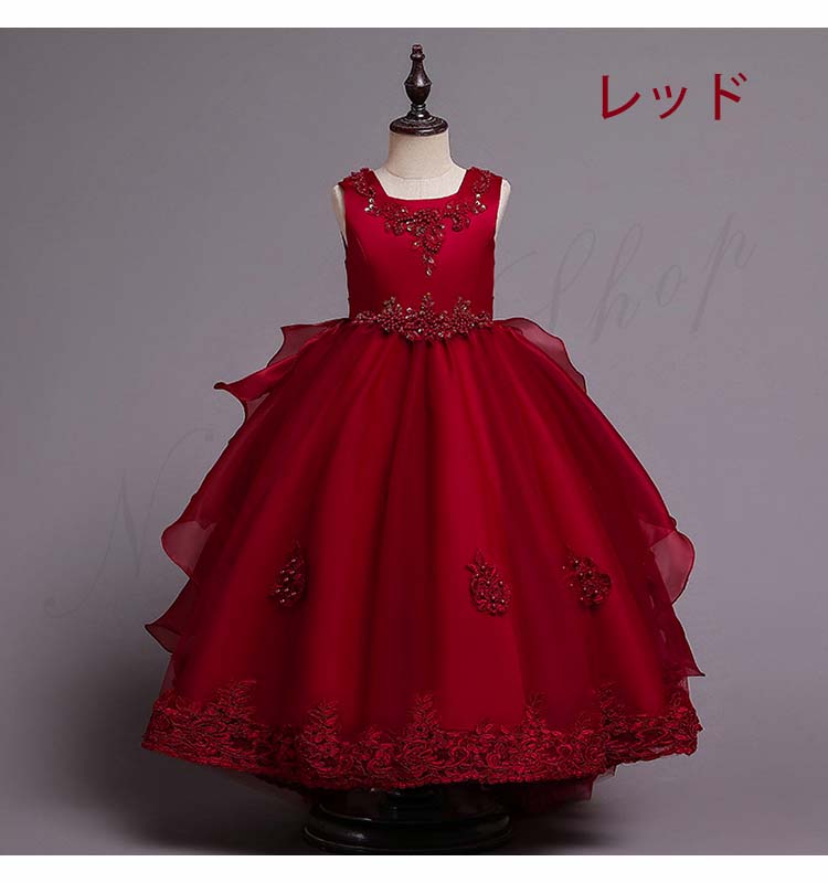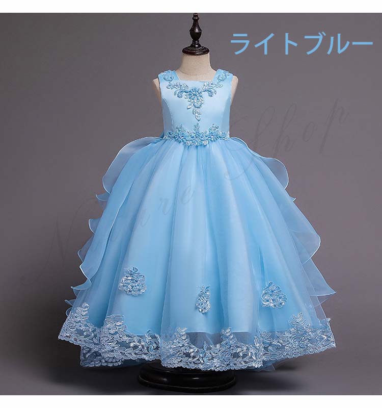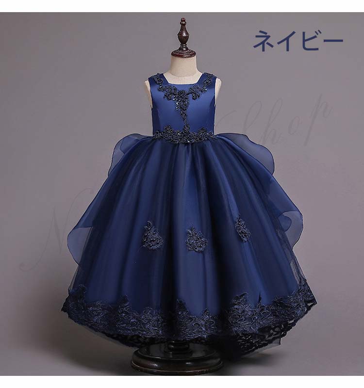 ドレス 子供 ピアノ 発表会 コンクール 刺繍 花柄 スパンコール 袖なし ノースリーブ 後ろリボン 無地 インレギュラー 着地式 チュールスカート キッズ チュール ワンピース