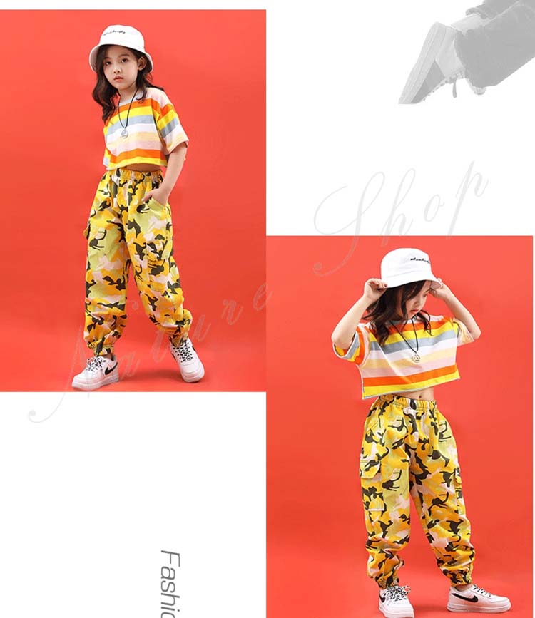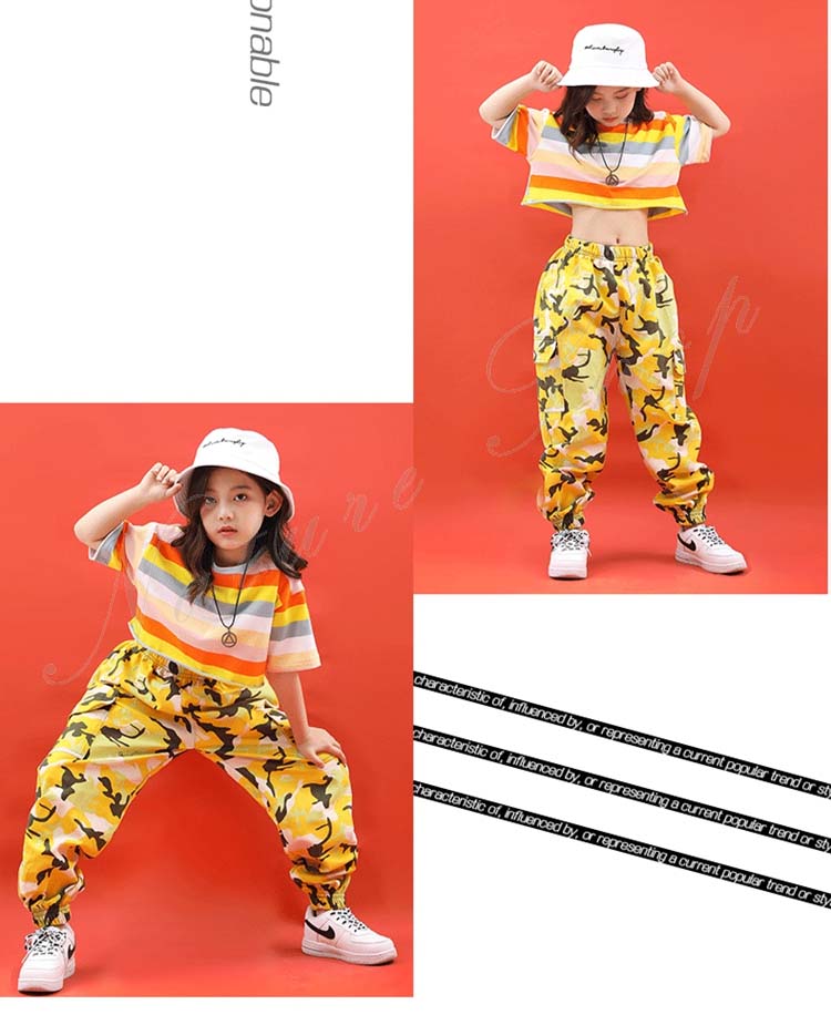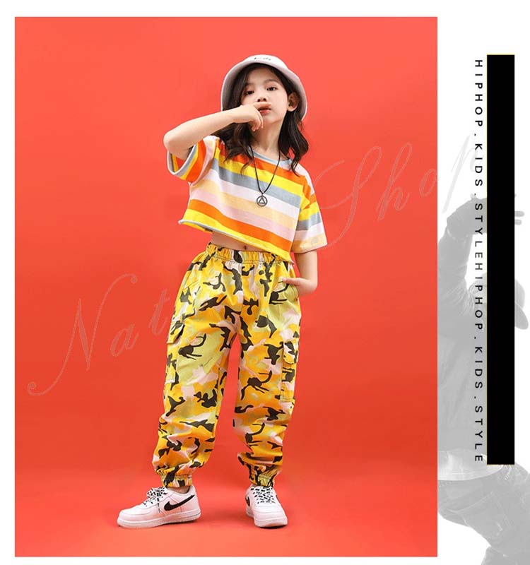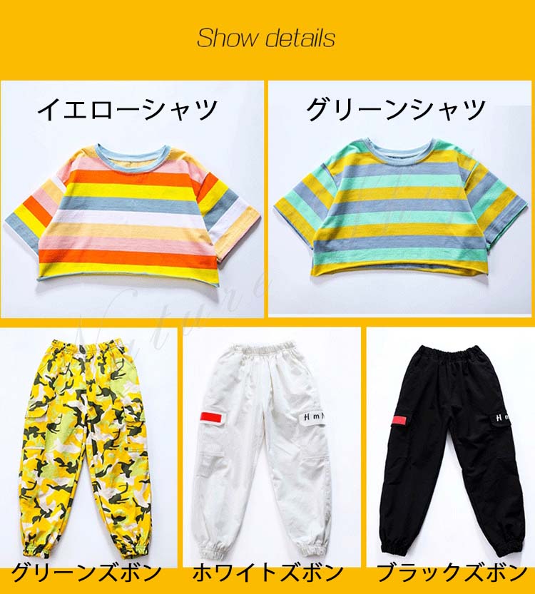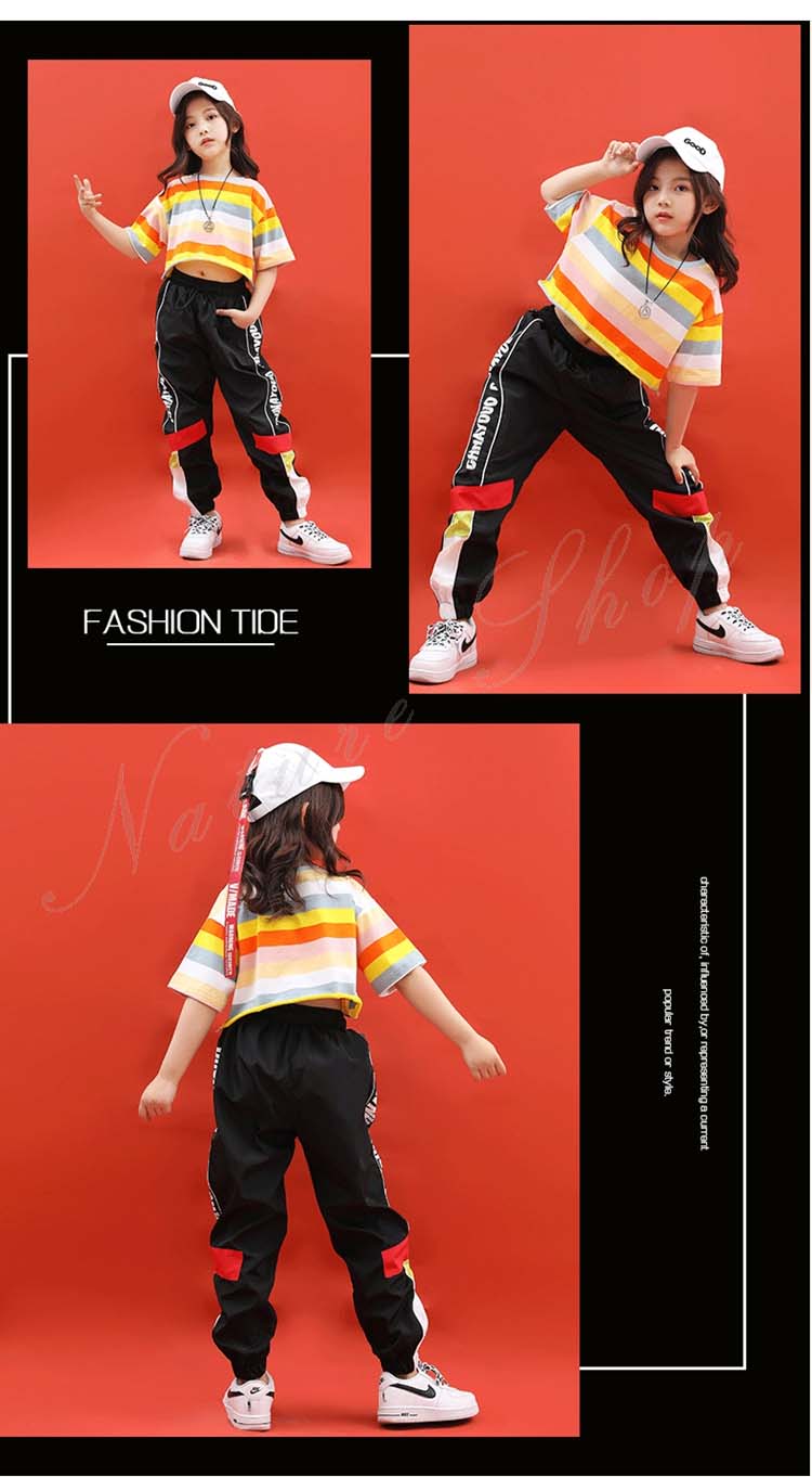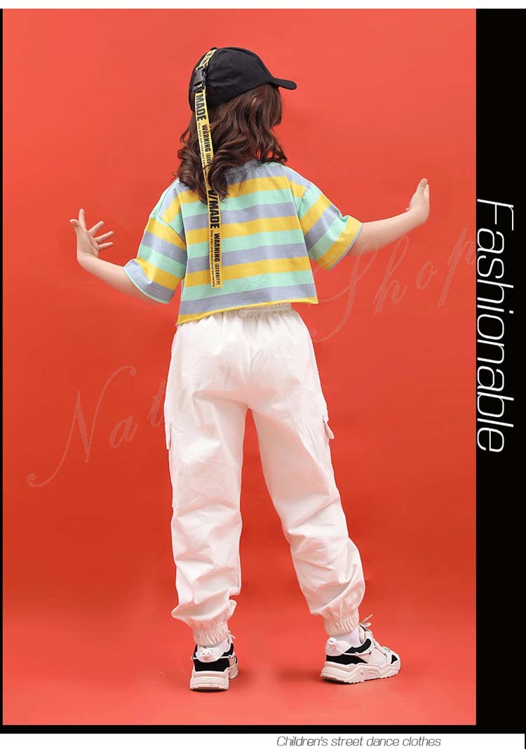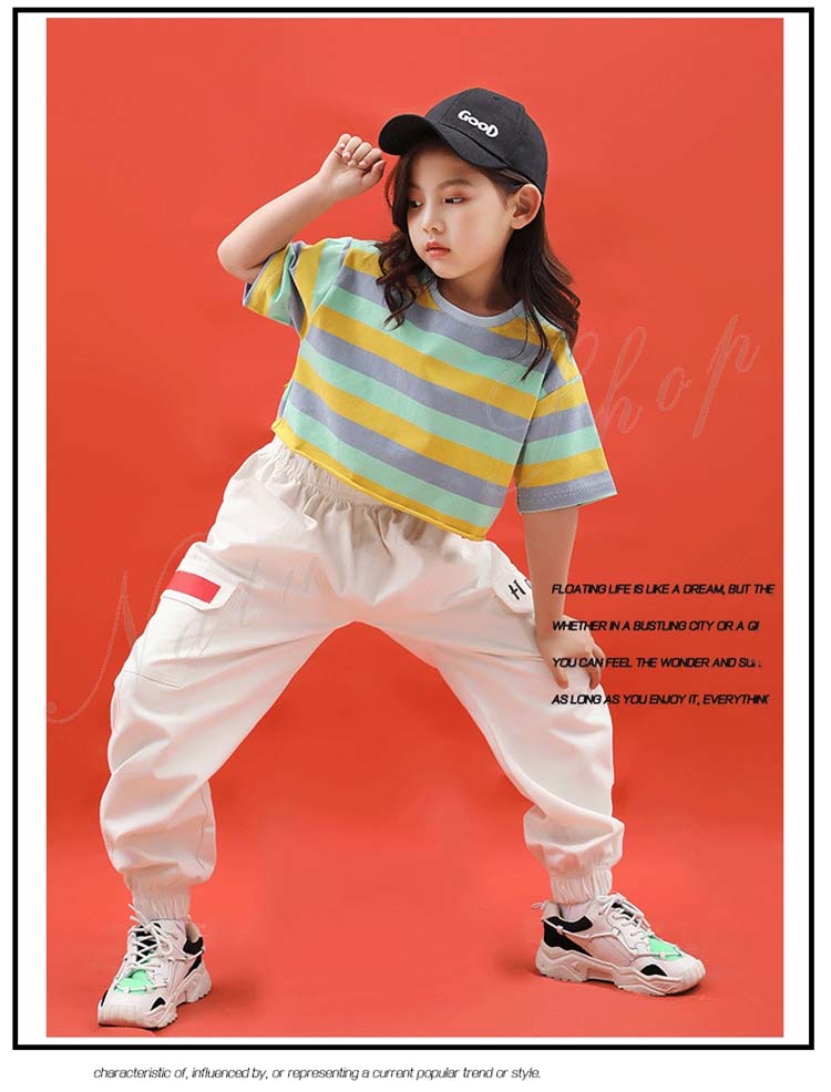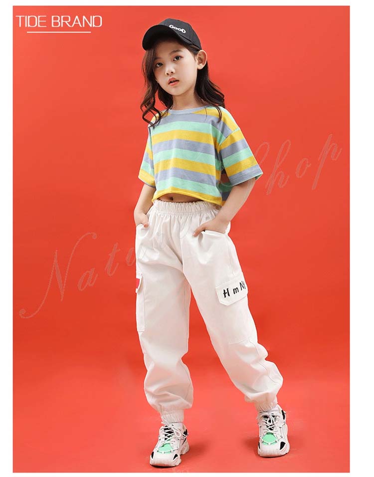 キッズダンス衣装 ダンス衣装 キッズ 半袖 Tシャツ ショートTシャツ へそ出し ロング丈 パンツ ストライプ柄 混色 ゆったり ヒップホップ 衣装 ファッション ダンス レッスン