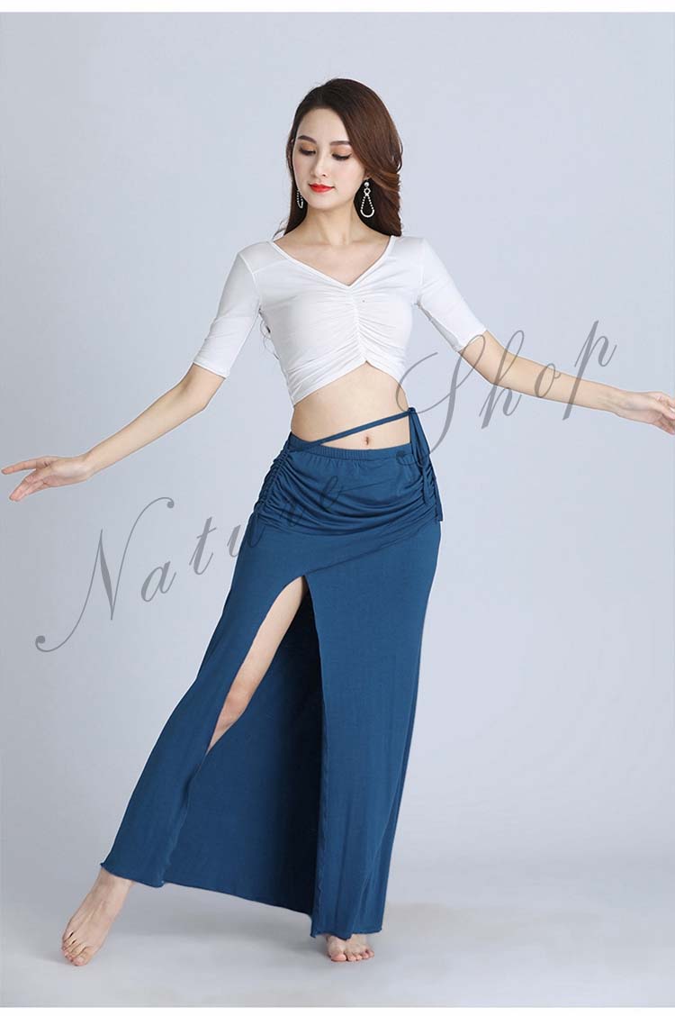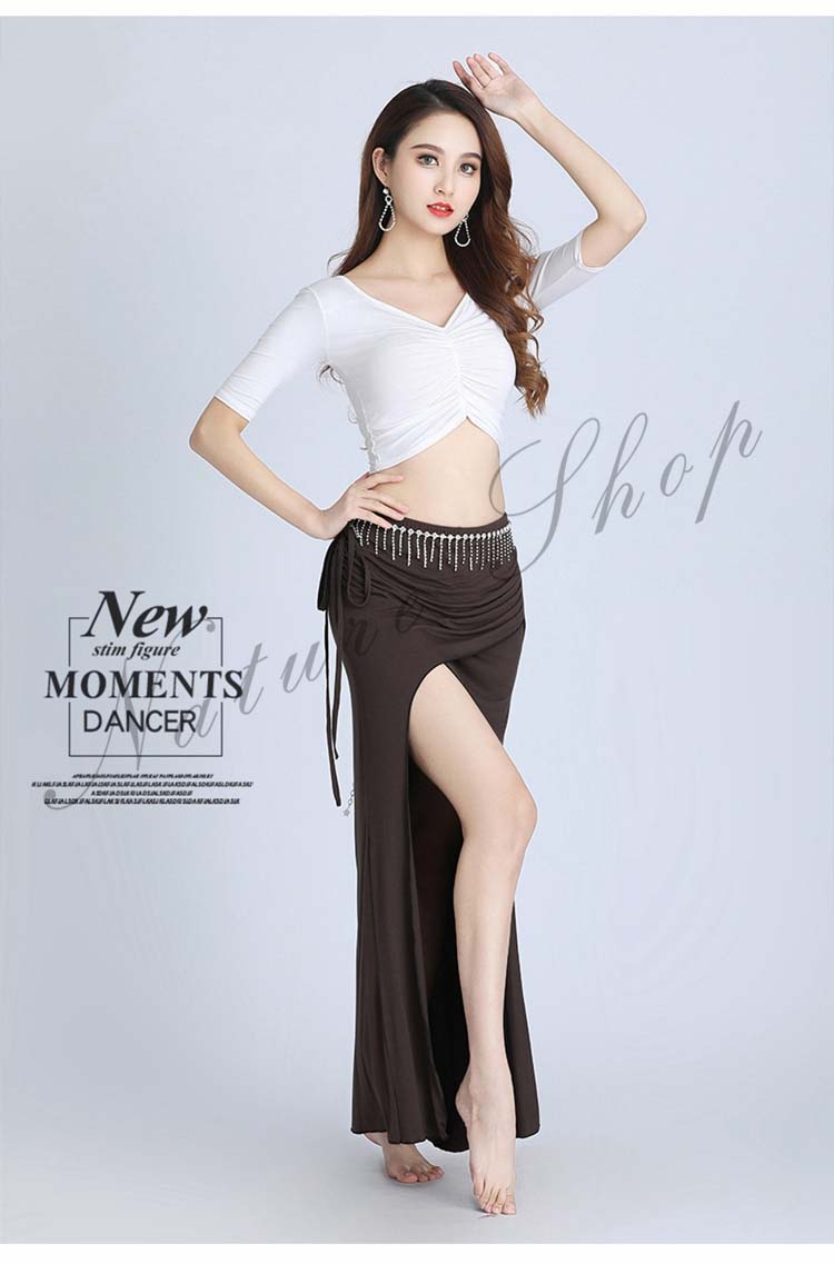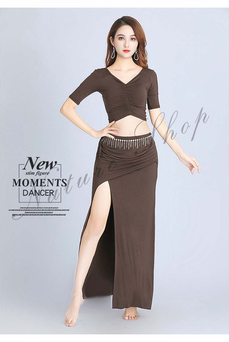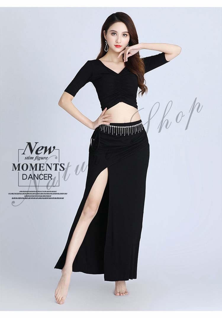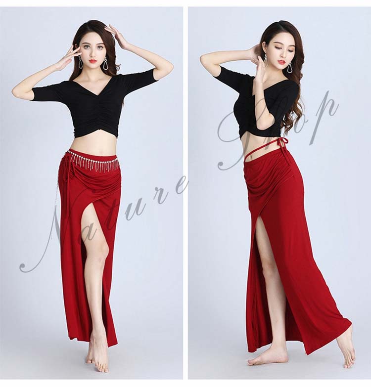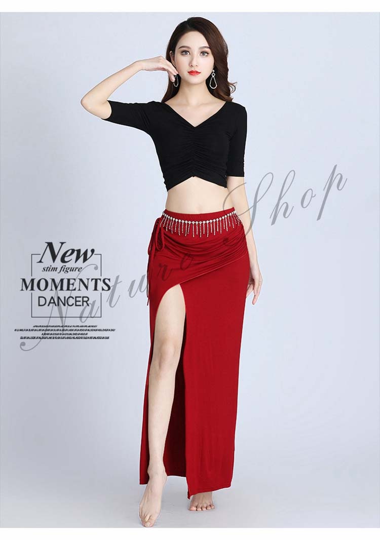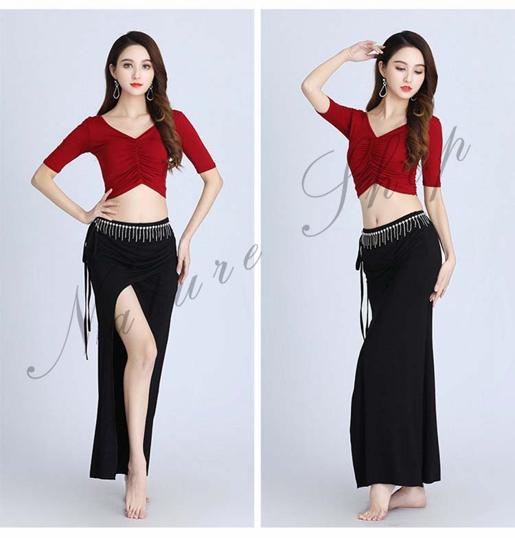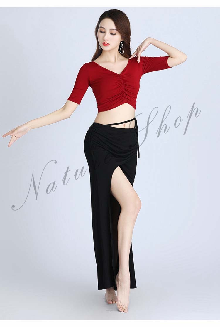 ベリーダンス 衣装 セットアップ 社交ダンス 練習着 レッスンウェア 2点上下セット スリットスカート シースルー ダンスウェア セクシー 半袖トップス+ロングスカート 女性 大人