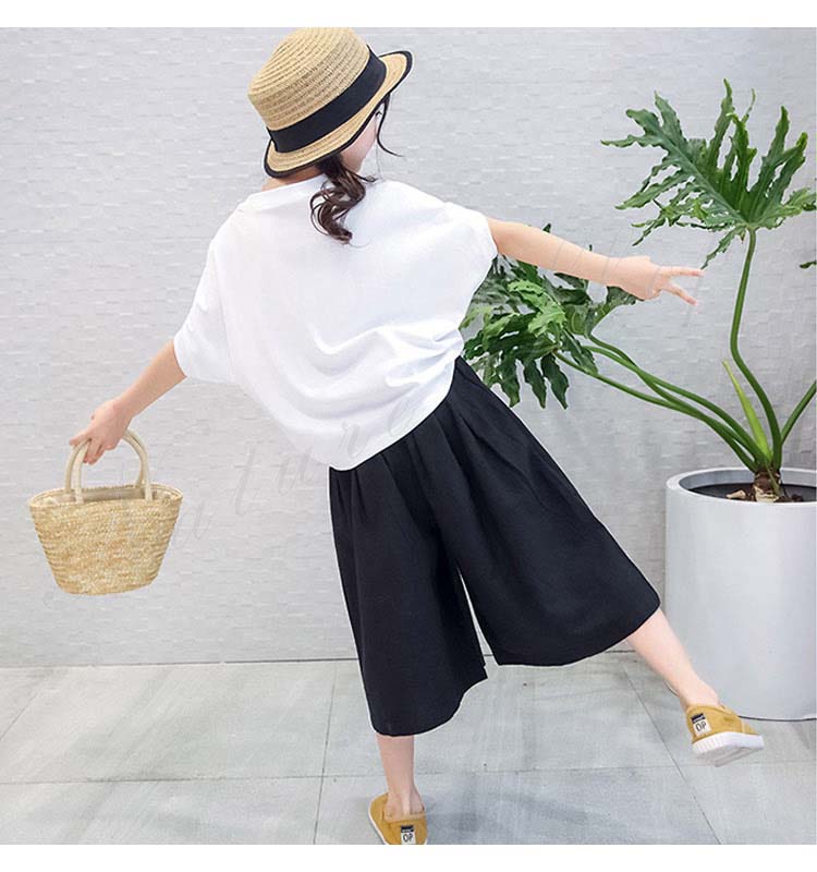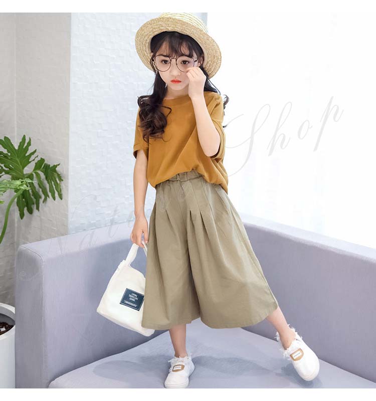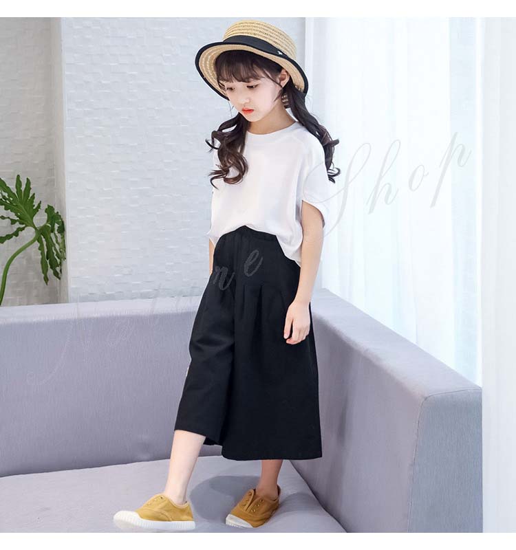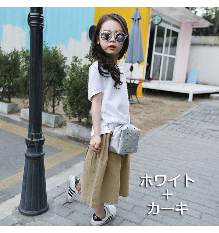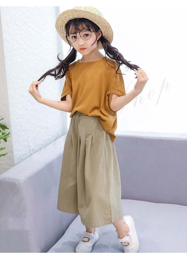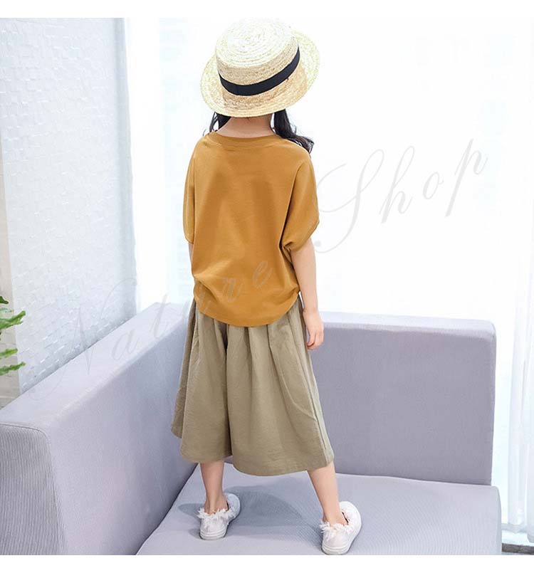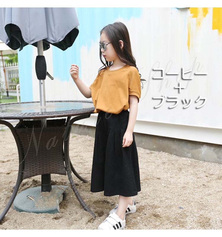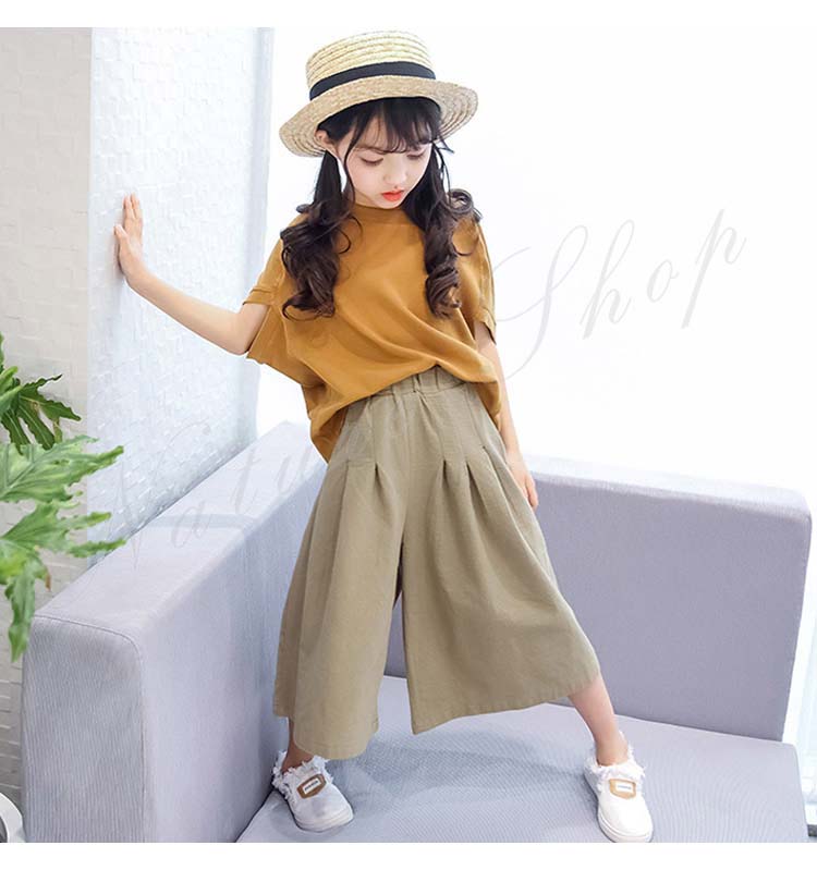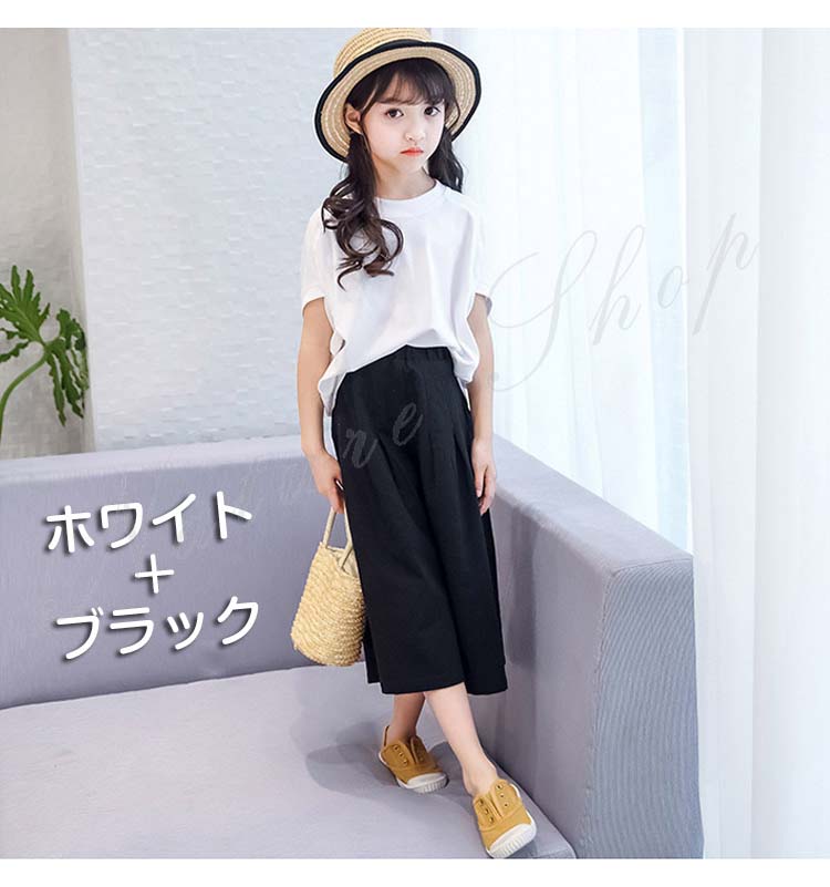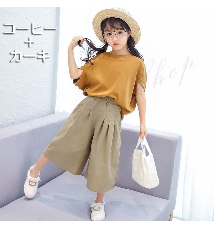 子供服 女の子 セットアップ キッズ 半袖 Tシャツ 無地 ワイドパンツ ジュニア服 夏 上下セット 丸首 綿麻 おしゃれ 可愛い