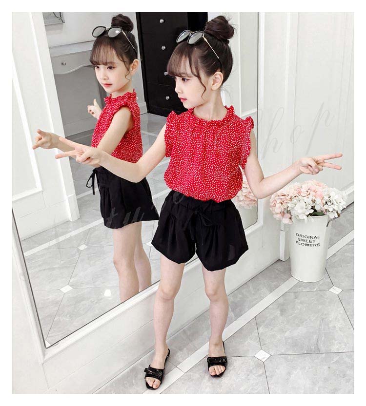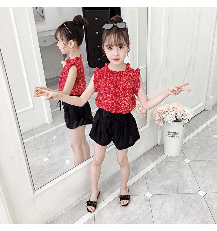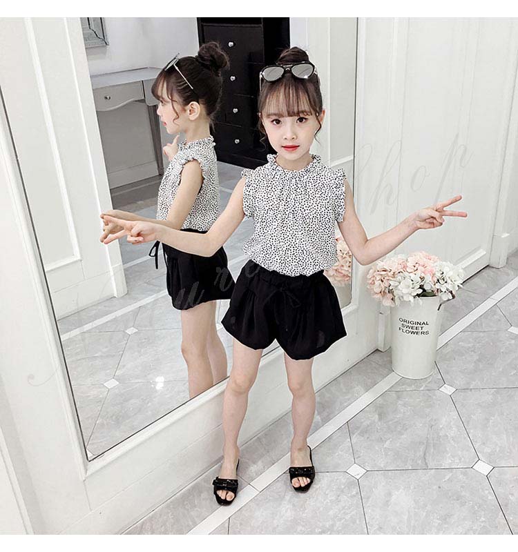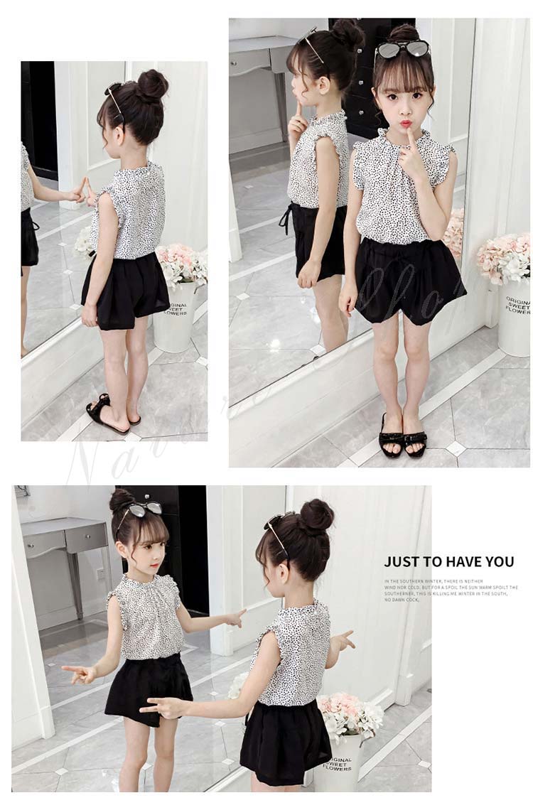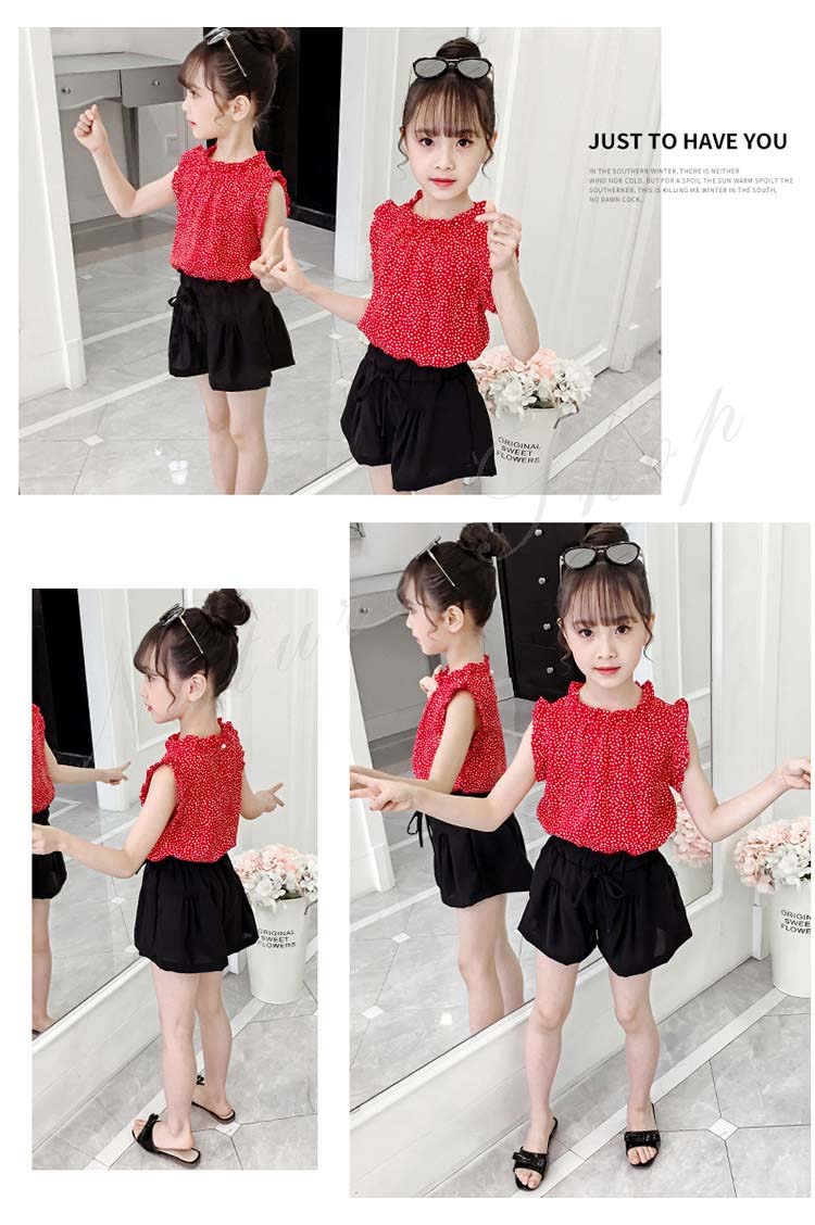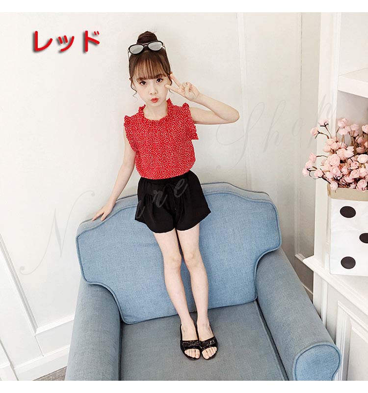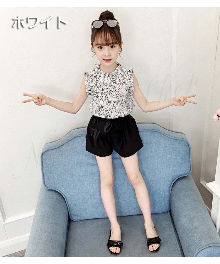 韓国子供服 セットアップ 女の子 水玉 ノースリーブ 夏服 普段着 シフォンシャツ ショートパンツ ドット 丸首 子ども服 キッズ