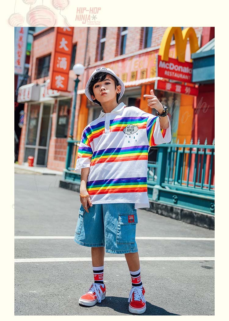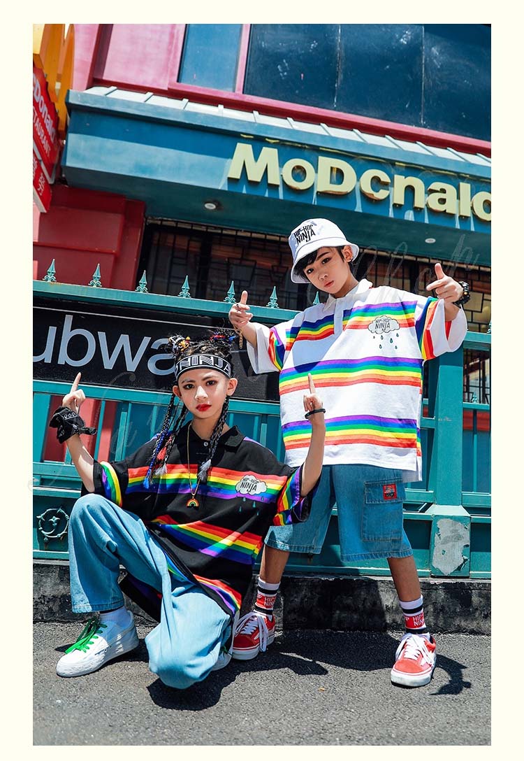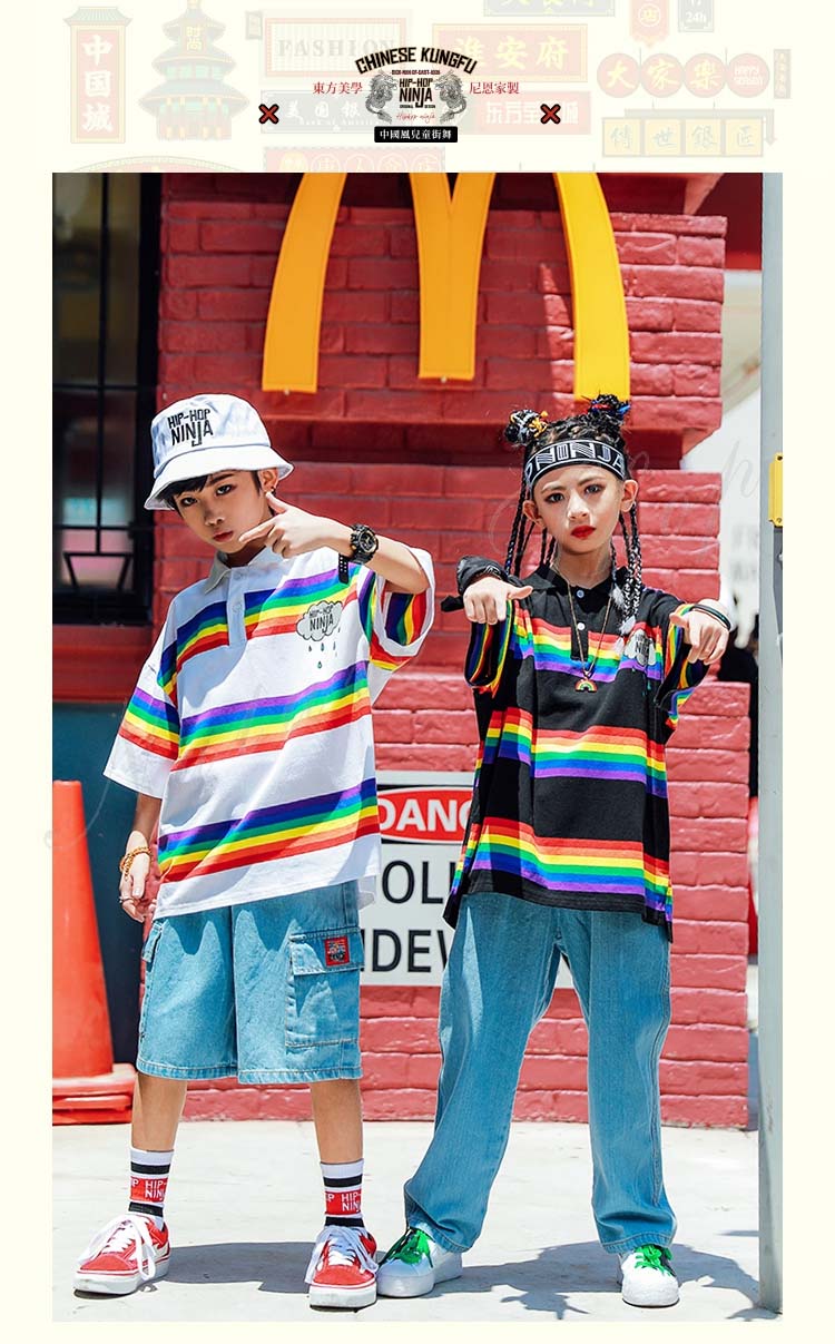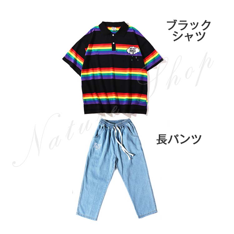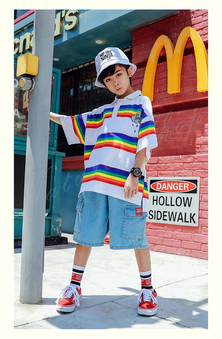 ヒップホップ 衣装 ファッション キッズダンス衣装 ダンス衣装 キッズ 半袖 ポロシャツ 虹柄 ボーダー柄 ジーンズ デニム 長ズボン 半ズボン 子供服 子ども服