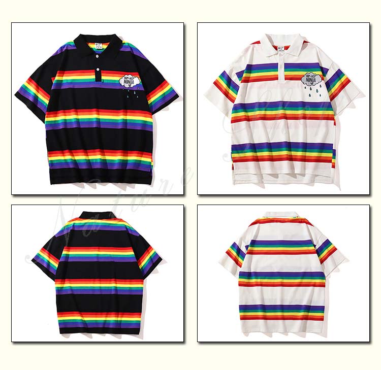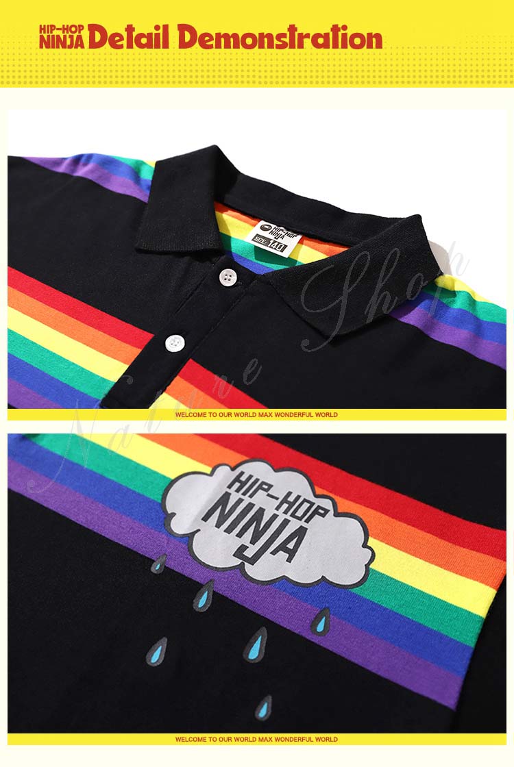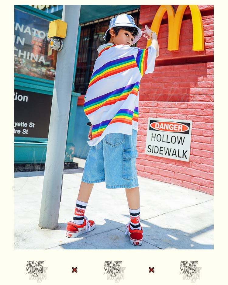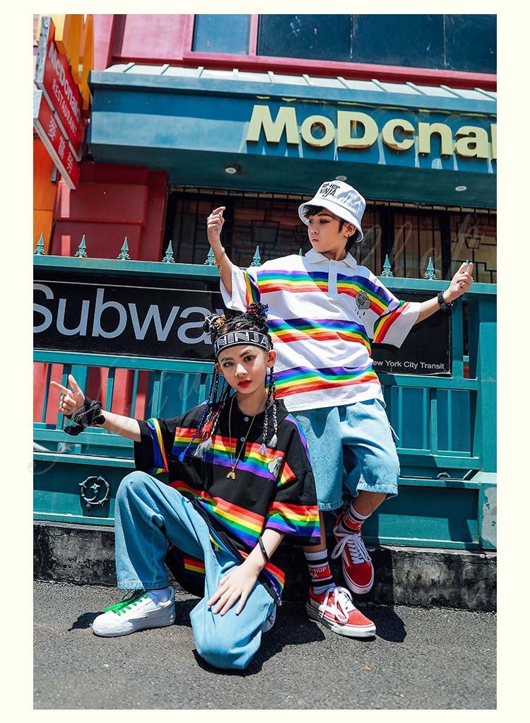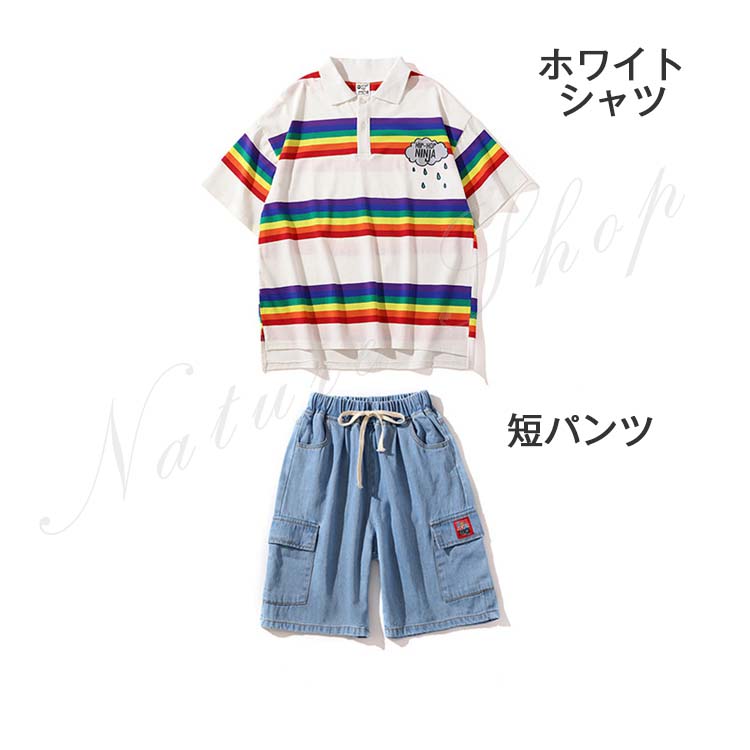 ヒップホップ 衣装 ファッション キッズダンス衣装 ダンス衣装 キッズ 半袖 ポロシャツ 虹柄 ボーダー柄 ジーンズ デニム 長ズボン 半ズボン 子供服 子ども服