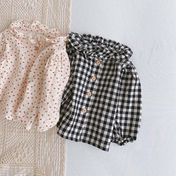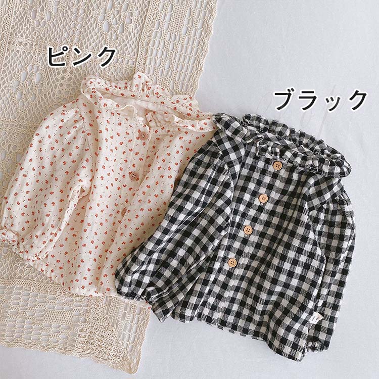 女の子シャッツ 長袖シャッツ 綿100%シャッツ 春物 秋物 子供服 立襟 フリル襟 新生児 前開き 柄系 紅葉柄 もみじ柄 総柄 チェック柄
