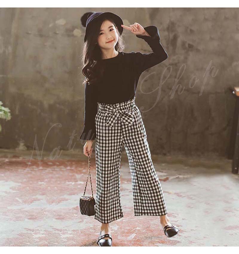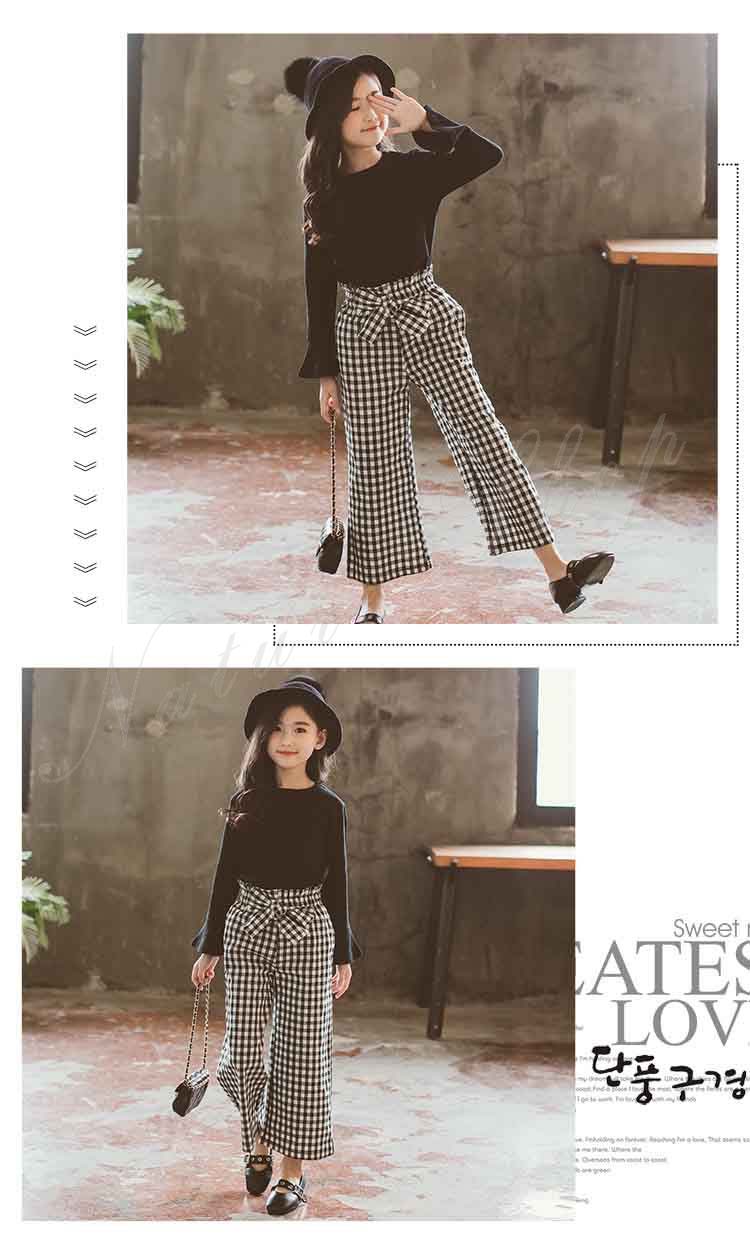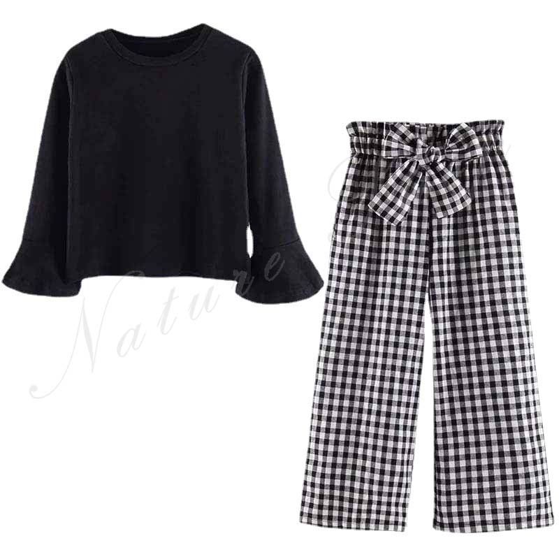 子供服 子ども服 女の子 春秋 セットアップ カジュアル ナチュラル 長袖 Tシャツ ラッパ袖 ワイドパンツ チェック柄 フォーマル 黒Tシャツ ロング丈 パンツ 千鳥柄 普段着