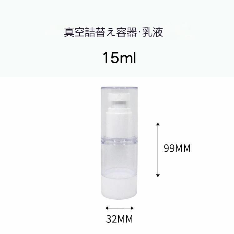 「真空小分けボトル」 真空構造を採用したボトルで残量に合わせて中の液体が上昇することで最後までスムーズに液体/乳液が出せます。中身を出しやすいので最後まで使い切ることができます。真空詰替え容器の使い方:液体を使い切ると、中底もボトルの最上部あたりまで上昇しているが、細長い棒で「スーッ」と中底を押し下げると、好みの位置まで中底が沈みます。
