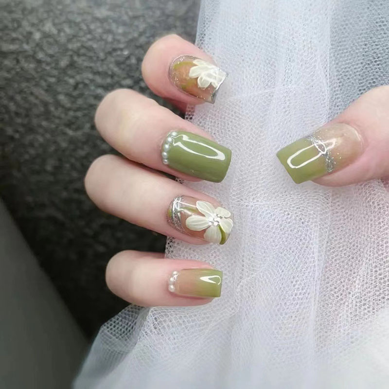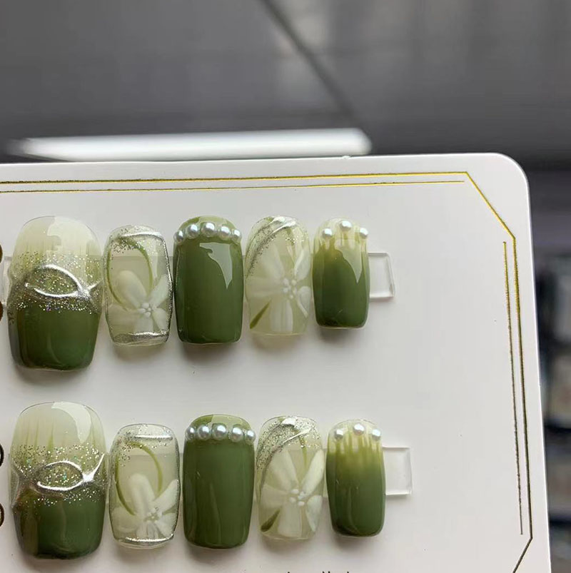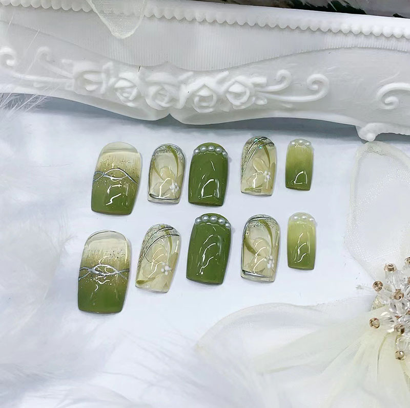 ネイルチップ 10枚入り 全4サイズ 手つくり キラキラ デザインチップ 付け爪 各種デザイン 結婚式 披露宴 成人式 ウエディング ブライダル ワンカラー 花 green スクエア ロング つけ爪