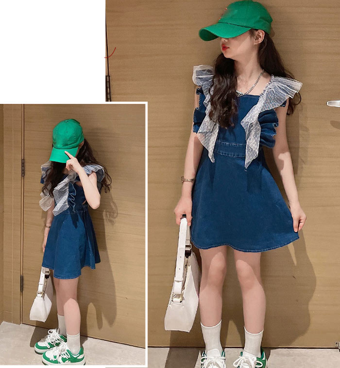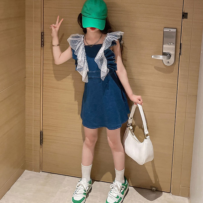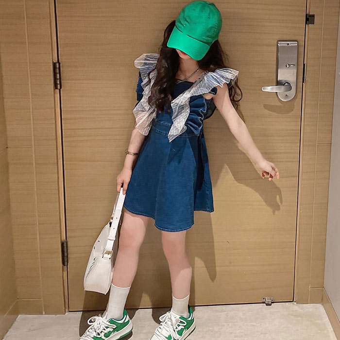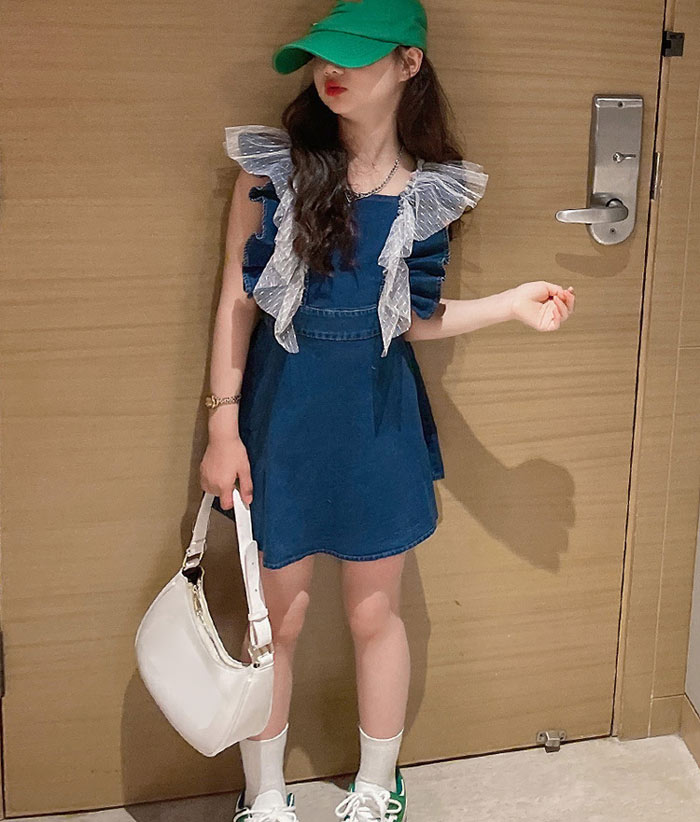 女の子 ベビー サスペンダースカート縁どり デニム ワンピース 韓国子供服 デニムサスペンダースカート