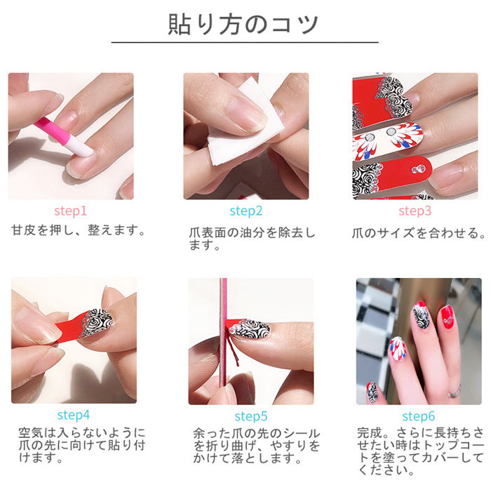 貼った後にトップコートやジェルコートを塗ると更に長持ち、綺麗に仕上がります。除去する際ははがすだけなので爪にダメージを与えにくいです。