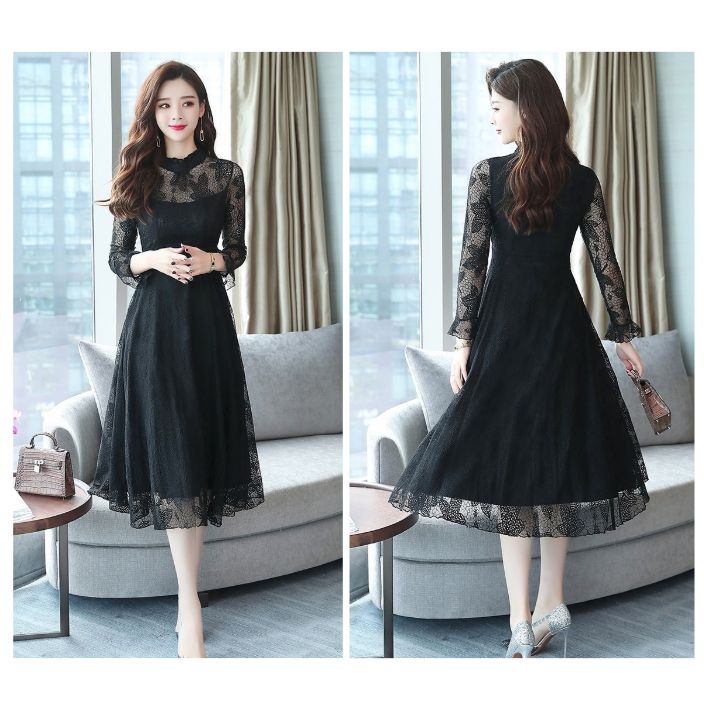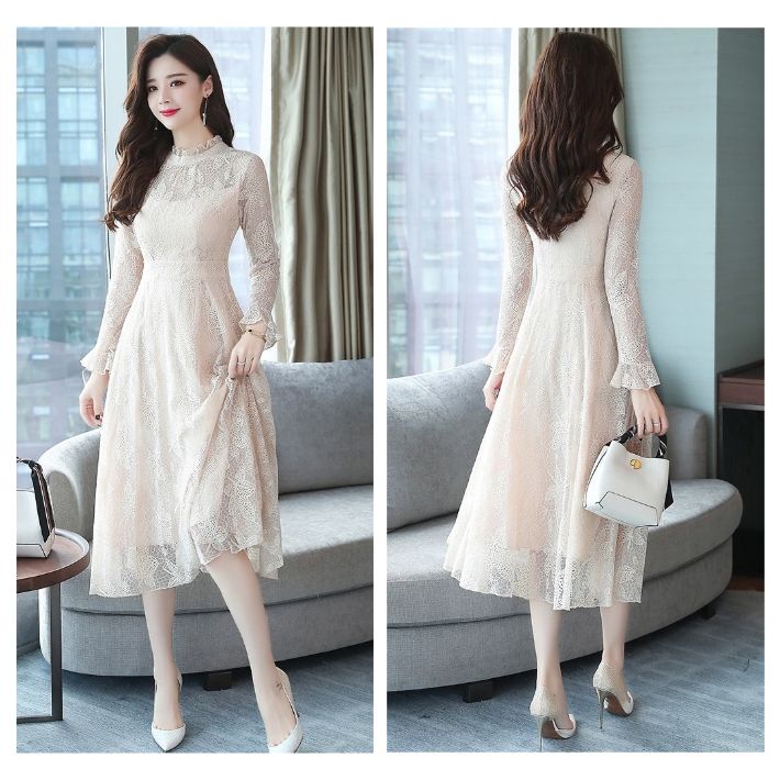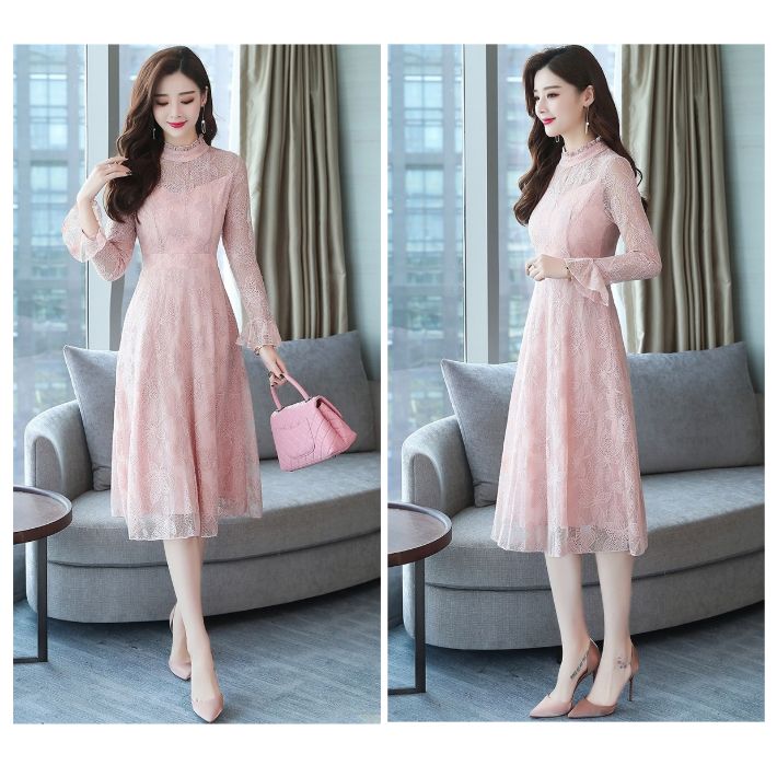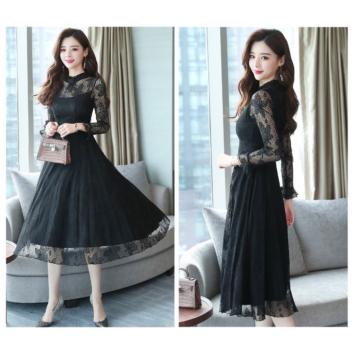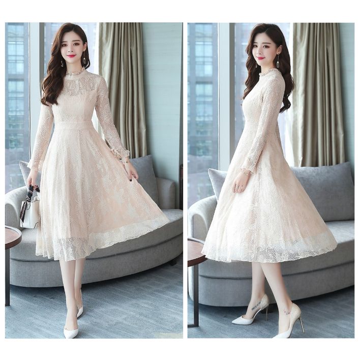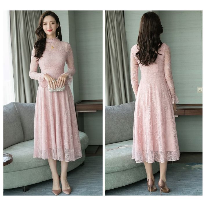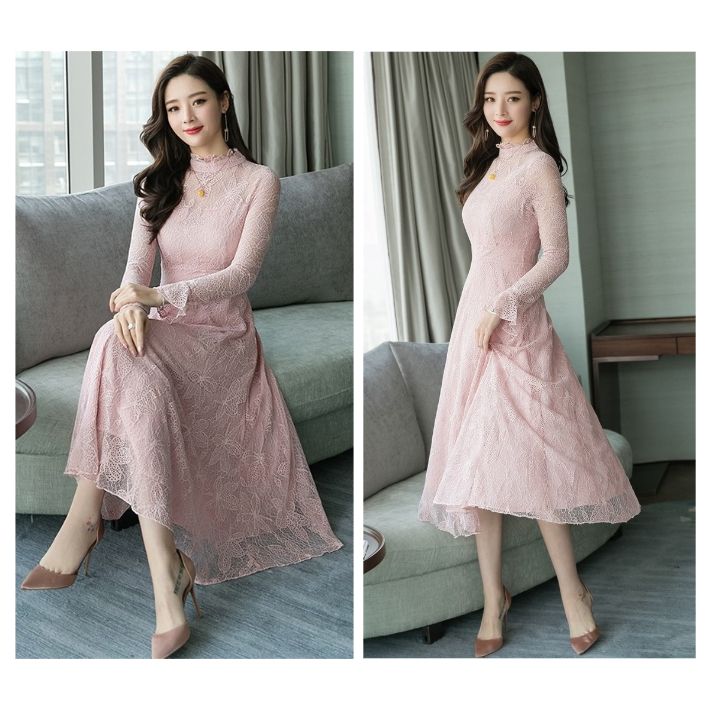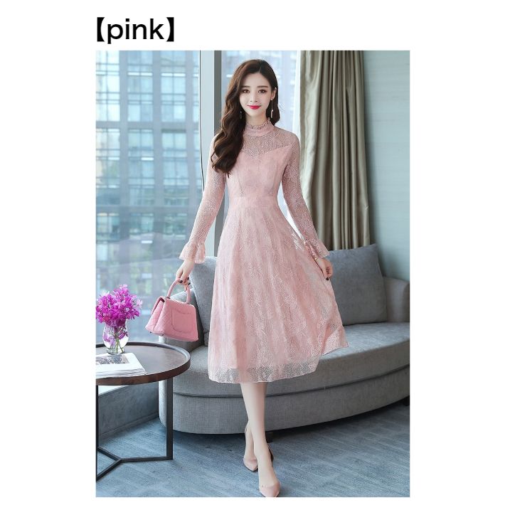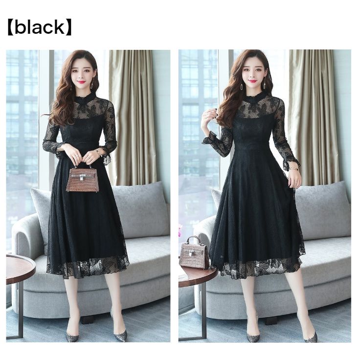 総レース ハイネック フレア ワンピー