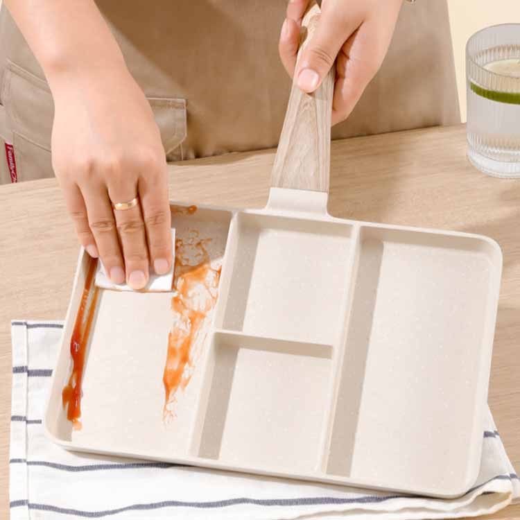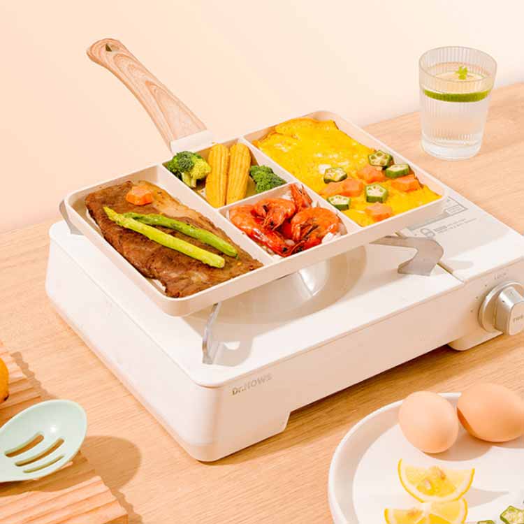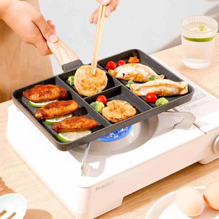 忙しい朝もこのフライパンを使えば、1度に卵焼きやウィンナー、ハンバーグなどの4つの食材を同時に調理することができます。洗う手間も1回で済みます。