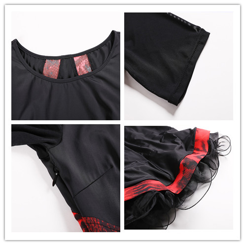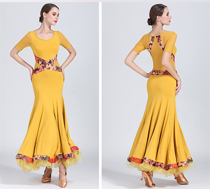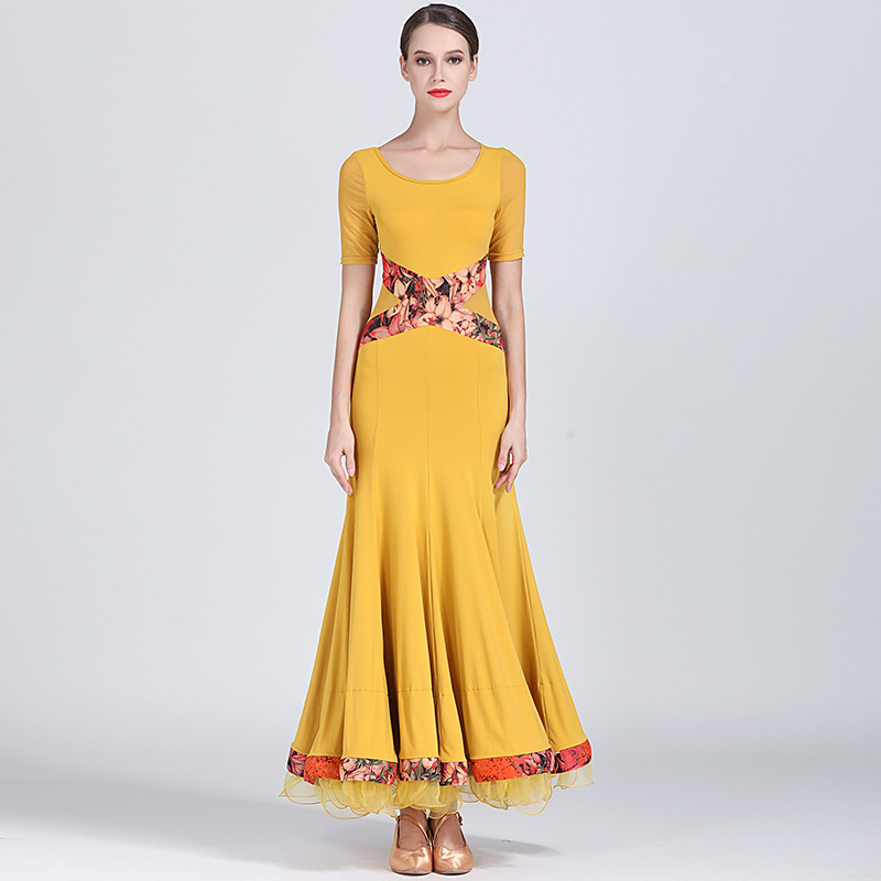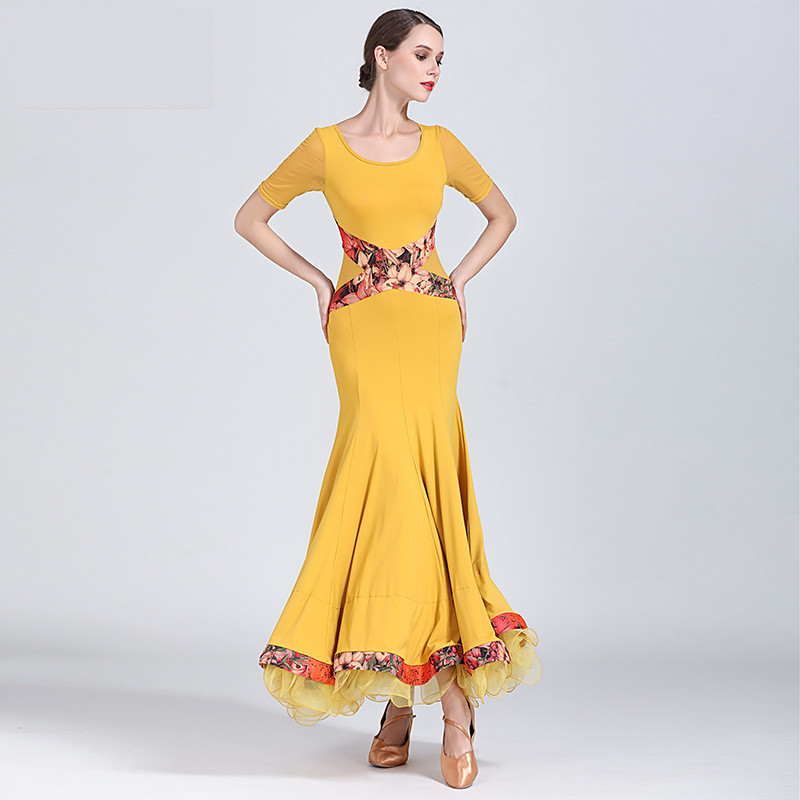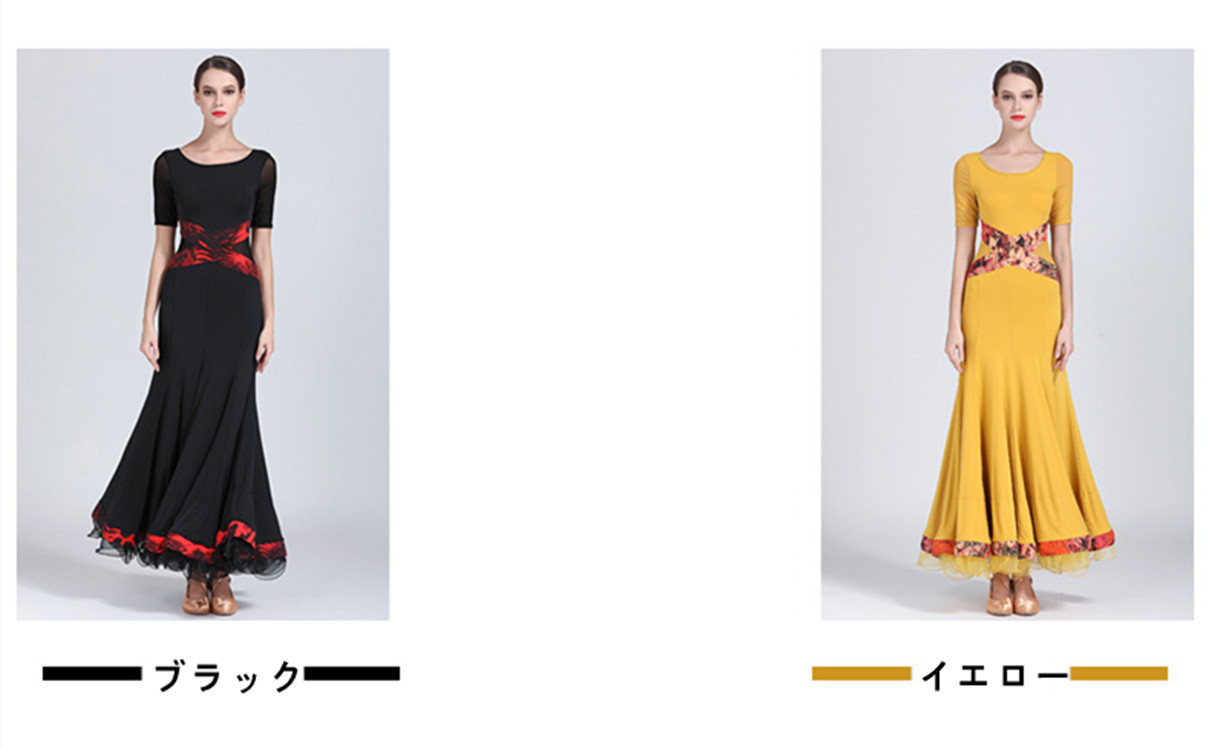 イエロー ブラック半袖レース社交ダンス 衣装 モダンドレス ラテンドレス ラテン衣装 社交ダンスドレス 大きい裾 豪華なドレスダンス衣装 ワンピース ダンス衣装 ダンス発表会 競技着 練習着 演出用