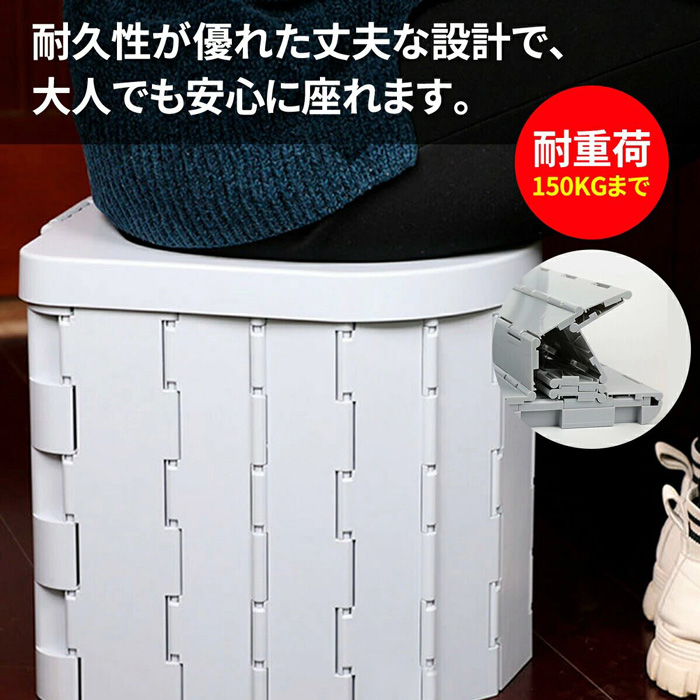 耐荷重は150kg。耐久性に優れた丈夫な設計で、誰でも気軽に使用できる簡易トイレです。