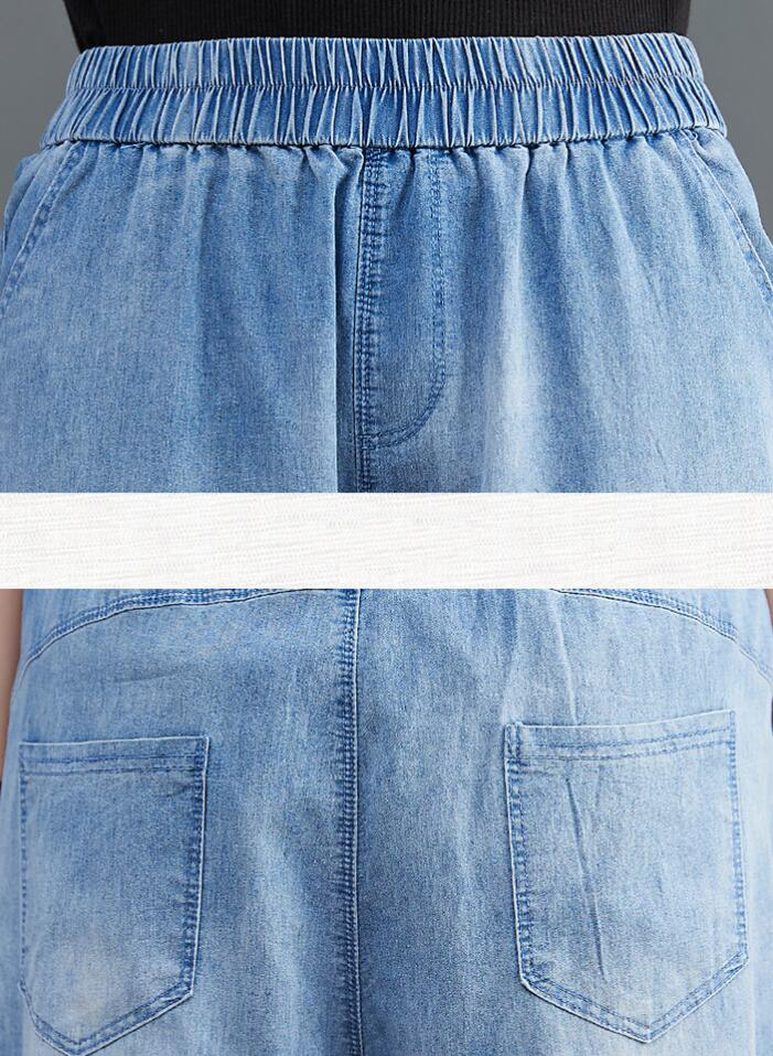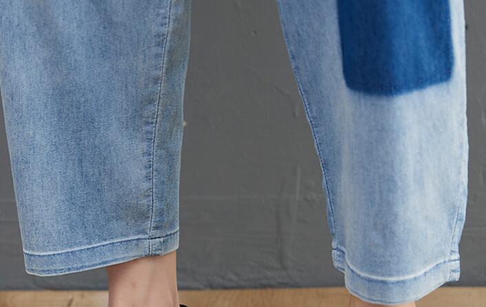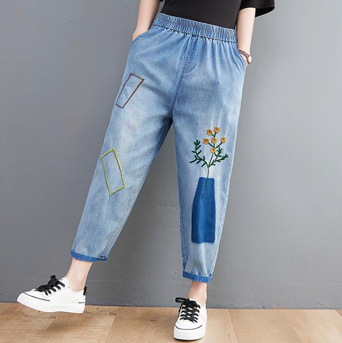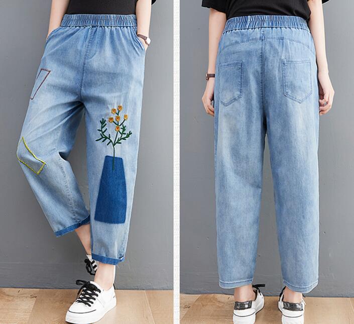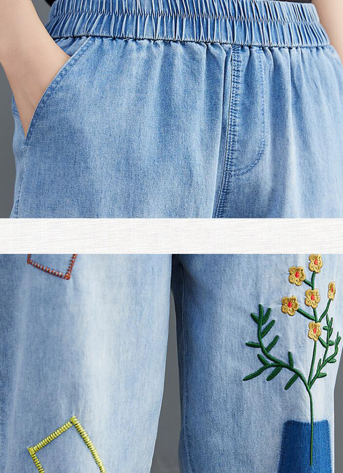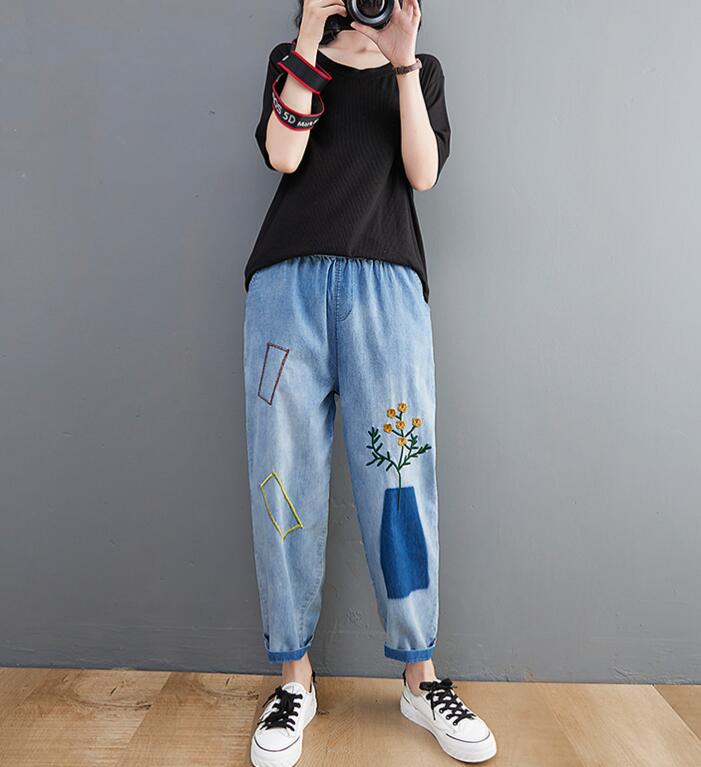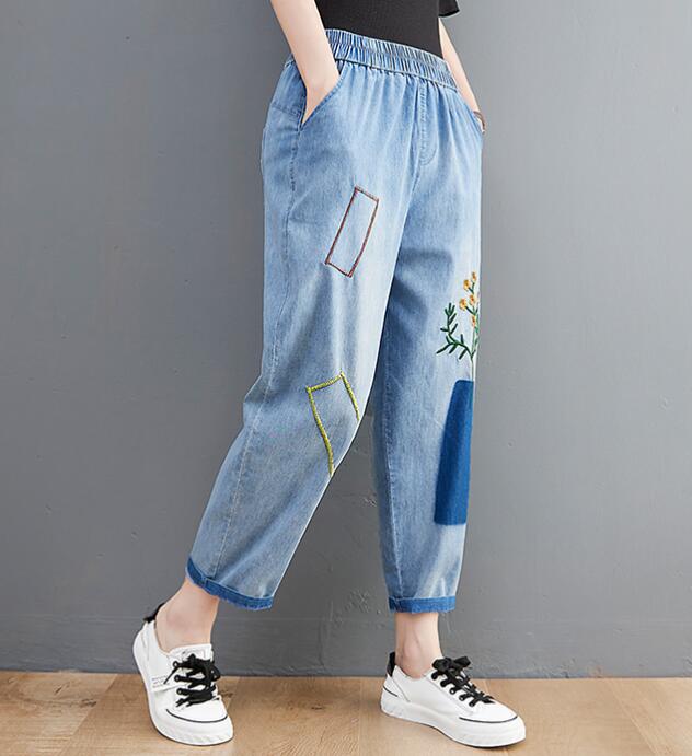 デニムパンツ刺繍花柄ウエストゴムジーン