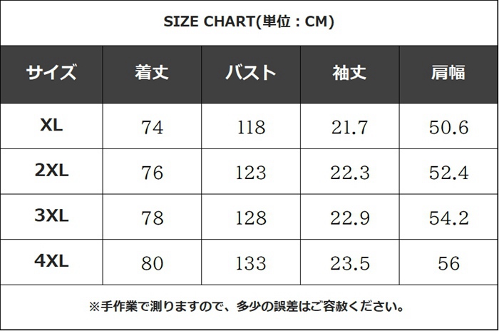 サイズ: XL(日本サイズM相当) 2XL(日本サイズL相当) 3XL(日本サイズXL相当) 4XL(日本サイズ2XL相当)