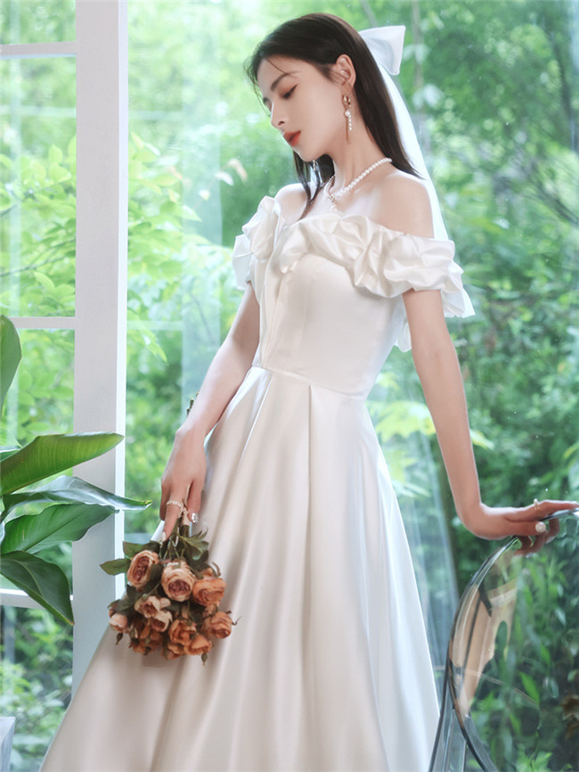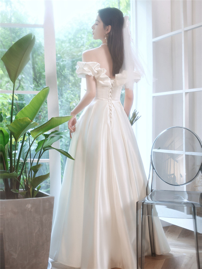 ホワイト オフショルダー ウェディングドレスAライン編上げタイプマキシ丈、ロング丈ロングドレススカート xs~xxxlWedding Dressお花嫁結婚式旅行撮影演出レディースウェディングドレス