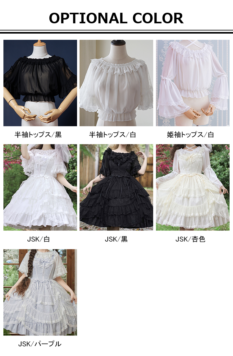 カラー 半袖トップス黒|半袖トップス白|姫袖トップス白|JSK白|JSK黒|JSK杏色|JSKパープル