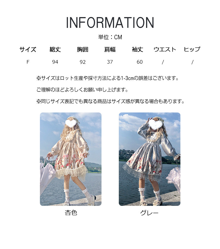 ※お取り扱い前に、商品付属タグの記載もご確認下さい。商品情報商品名 ロリータ ワンピース レディース 長袖 ワンピ つや ボリューム袖 総柄 膝下 フリル 萌え 甘ロリ かわいい素材 ポリエステルカラー グレー|杏色サイズ F生産国 中国包装について 環境保護の観点から、「簡易包装」を推進しております明細書について 当店ではエコロジーと個人情報流出防止のため、ご指示の無い限り明細書を発行しておりません。