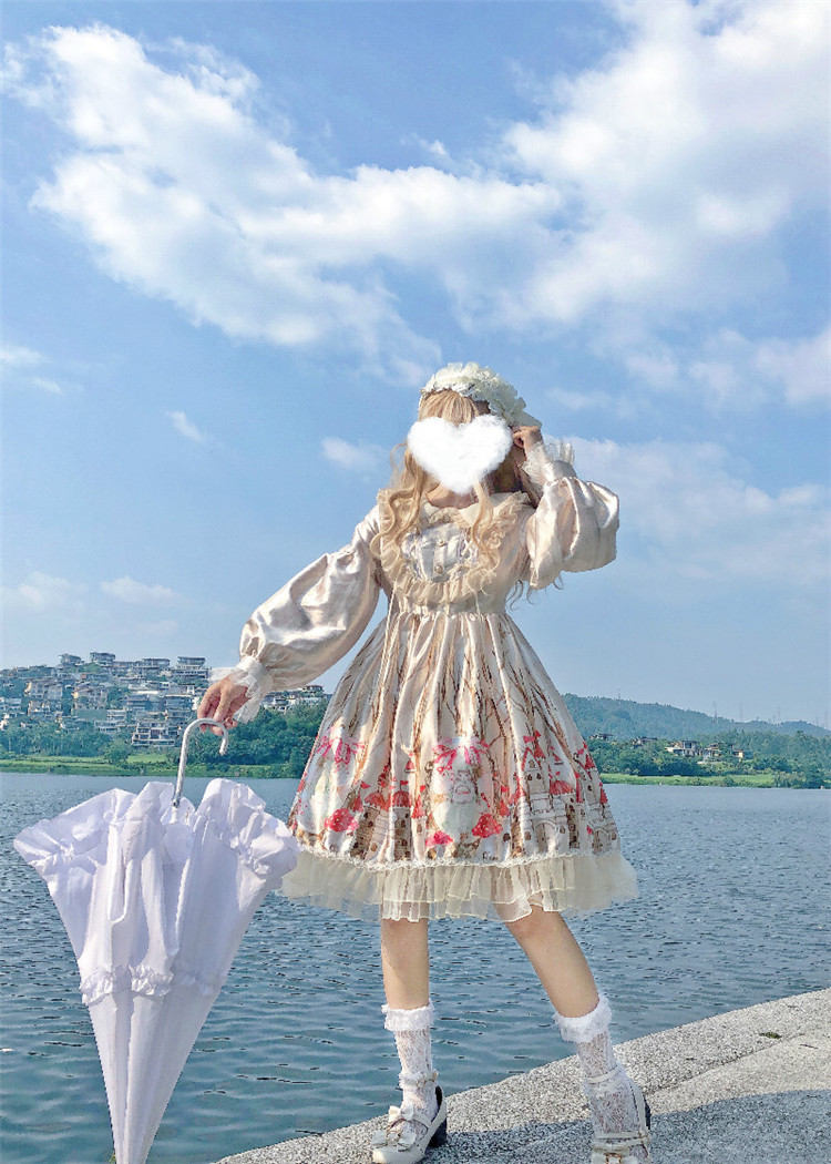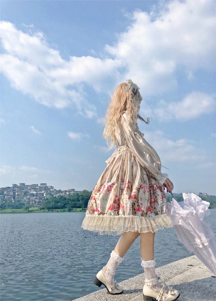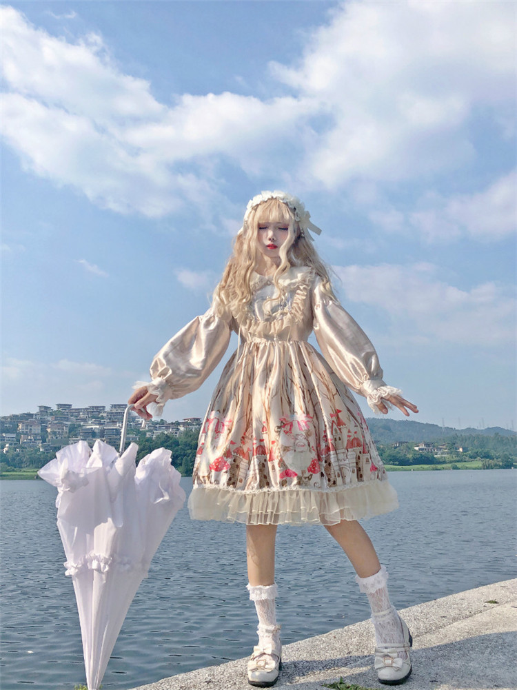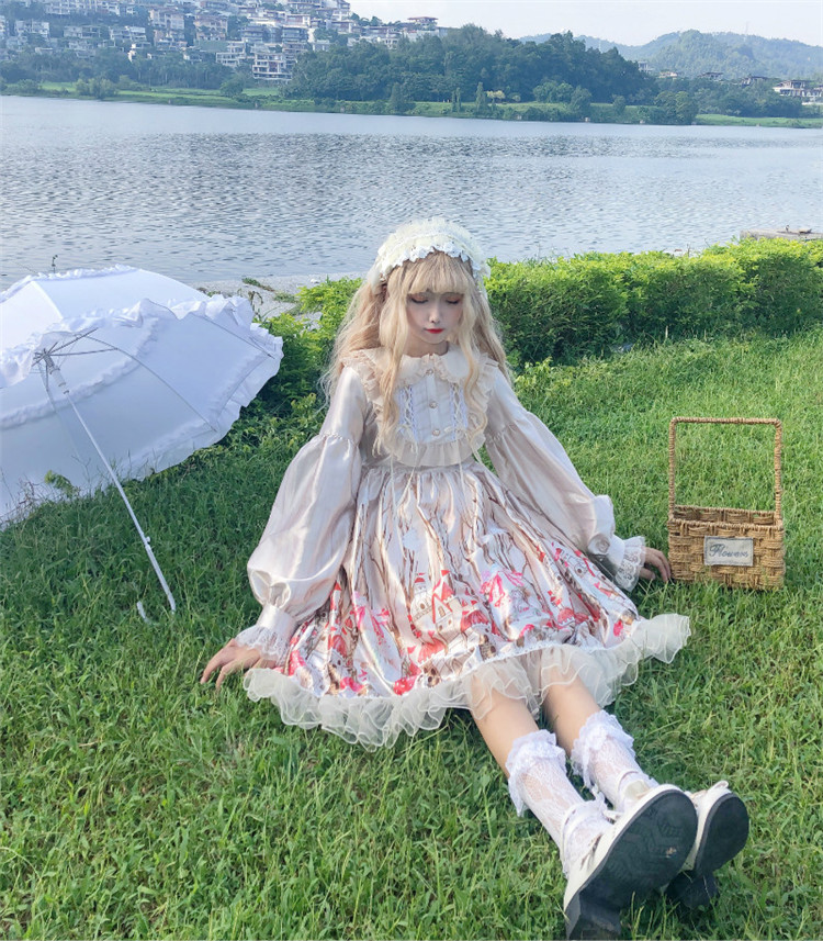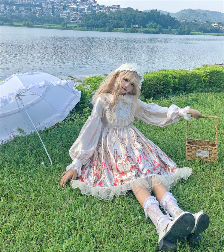 商品名 ロリータ ワンピース レディース 長袖 ワンピ つや ボリューム袖 総柄 膝下 フリル 萌え 甘ロリ かわいい